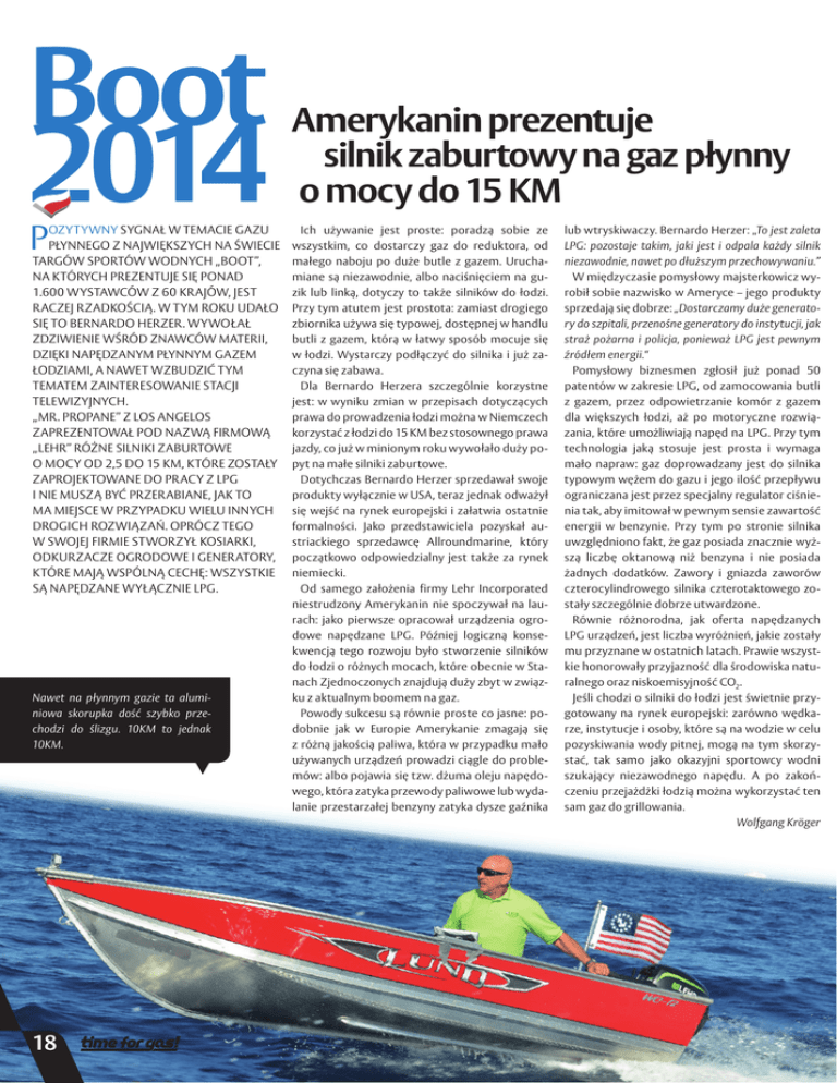Boot 2014 P OZYTYWNY SYGNAŁ W TEMACIE GAZU PŁYNNEGO Z NAJWIĘKSZYCH NA ŚWIECIE TARGÓW SPORTÓW WODNYCH „BOOT”, NA KTÓRYCH PREZENTUJE SIĘ PONAD 1.600 WYSTAWCÓW Z 60 KRAJÓW, JEST RACZEJ RZADKOŚCIĄ. W TYM ROKU UDAŁO SIĘ TO BERNARDO HERZER. WYWOŁAŁ ZDZIWIENIE WŚRÓD ZNAWCÓW MATERII, DZIĘKI NAPĘDZANYM PŁYNNYM GAZEM ŁODZIAMI, A NAWET WZBUDZIĆ TYM TEMATEM ZAINTERESOWANIE STACJI TELEWIZYJNYCH. „MR. PROPANE” Z LOS ANGELOS ZAPREZENTOWAŁ POD NAZWĄ FIRMOWĄ „LEHR” RÓŻNE SILNIKI ZABURTOWE O MOCY OD 2,5 DO 15 KM, KTÓRE ZOSTAŁY ZAPROJEKTOWANE DO PRACY Z LPG I NIE MUSZĄ BYĆ PRZERABIANE, JAK TO MA MIEJSCE W PRZYPADKU WIELU INNYCH DROGICH ROZWIĄZAŃ. OPRÓCZ TEGO W SWOJEJ FIRMIE STWORZYŁ KOSIARKI, ODKURZACZE OGRODOWE I GENERATORY, KTÓRE MAJĄ WSPÓLNĄ CECHĘ: WSZYSTKIE SĄ NAPĘDZANE WYŁĄCZNIE LPG. Nawet na płynnym gazie ta aluminiowa skorupka dość szybko przechodzi do ślizgu. 10KM to jednak 10KM. 18 Amerykanin prezentuje silnik zaburtowy na gaz płynny o mocy do 15 KM Ich używanie jest proste: poradzą sobie ze wszystkim, co dostarczy gaz do reduktora, od małego naboju po duże butle z gazem. Uruchamiane są niezawodnie, albo naciśnięciem na guzik lub linką, dotyczy to także silników do łodzi. Przy tym atutem jest prostota: zamiast drogiego zbiornika używa się typowej, dostępnej w handlu butli z gazem, którą w łatwy sposób mocuje się w łodzi. Wystarczy podłączyć do silnika i już zaczyna się zabawa. Dla Bernardo Herzera szczególnie korzystne jest: w wyniku zmian w przepisach dotyczących prawa do prowadzenia łodzi można w Niemczech korzystać z łodzi do 15 KM bez stosownego prawa jazdy, co już w minionym roku wywołało duży popyt na małe silniki zaburtowe. Dotychczas Bernardo Herzer sprzedawał swoje produkty wyłącznie w USA, teraz jednak odważył się wejść na rynek europejski i załatwia ostatnie formalności. Jako przedstawiciela pozyskał austriackiego sprzedawcę Allroundmarine, który początkowo odpowiedzialny jest także za rynek niemiecki. Od samego założenia firmy Lehr Incorporated niestrudzony Amerykanin nie spoczywał na laurach: jako pierwsze opracował urządzenia ogrodowe napędzane LPG. Później logiczną konsekwencją tego rozwoju było stworzenie silników do łodzi o różnych mocach, które obecnie w Stanach Zjednoczonych znajdują duży zbyt w związku z aktualnym boomem na gaz. Powody sukcesu są równie proste co jasne: podobnie jak w Europie Amerykanie zmagają się z różną jakością paliwa, która w przypadku mało używanych urządzeń prowadzi ciągle do problemów: albo pojawia się tzw. dżuma oleju napędowego, która zatyka przewody paliwowe lub wydalanie przestarzałej benzyny zatyka dysze gaźnika lub wtryskiwaczy. Bernardo Herzer: „To jest zaleta LPG: pozostaje takim, jaki jest i odpala każdy silnik niezawodnie, nawet po dłuższym przechowywaniu.” W międzyczasie pomysłowy majsterkowicz wyrobił sobie nazwisko w Ameryce – jego produkty sprzedają się dobrze: „Dostarczamy duże generatory do szpitali, przenośne generatory do instytucji, jak straż pożarna i policja, ponieważ LPG jest pewnym źródłem energii.“ Pomysłowy biznesmen zgłosił już ponad 50 patentów w zakresie LPG, od zamocowania butli z gazem, przez odpowietrzanie komór z gazem dla większych łodzi, aż po motoryczne rozwiązania, które umożliwiają napęd na LPG. Przy tym technologia jaką stosuje jest prosta i wymaga mało napraw: gaz doprowadzany jest do silnika typowym wężem do gazu i jego ilość przepływu ograniczana jest przez specjalny regulator ciśnienia tak, aby imitował w pewnym sensie zawartość energii w benzynie. Przy tym po stronie silnika uwzględniono fakt, że gaz posiada znacznie wyższą liczbę oktanową niż benzyna i nie posiada żadnych dodatków. Zawory i gniazda zaworów czterocylindrowego silnika czterotaktowego zostały szczególnie dobrze utwardzone. Równie różnorodna, jak oferta napędzanych LPG urządzeń, jest liczba wyróżnień, jakie zostały mu przyznane w ostatnich latach. Prawie wszystkie honorowały przyjazność dla środowiska naturalnego oraz niskoemisyjność CO2. Jeśli chodzi o silniki do łodzi jest świetnie przygotowany na rynek europejski: zarówno wędkarze, instytucje i osoby, które są na wodzie w celu pozyskiwania wody pitnej, mogą na tym skorzystać, tak samo jako okazyjni sportowcy wodni szukający niezawodnego napędu. A po zakończeniu przejażdżki łodzią można wykorzystać ten sam gaz do grillowania. Wolfgang Kröger