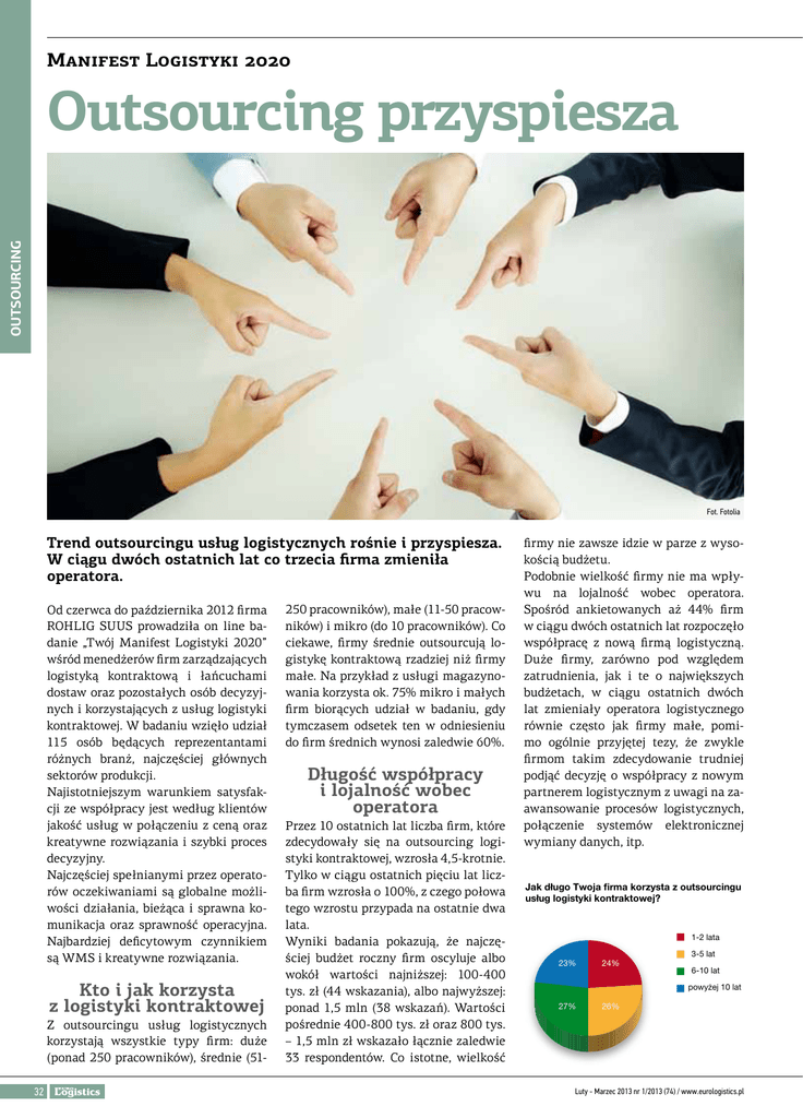 Manifest Logistyki 2020 Outsourcing Outsourcing przyspiesza Fot. Fotolia Trend outsourcingu usług logistycznych rośnie i przyspiesza. W ciągu dwóch ostatnich lat co trzecia firma zmieniła operatora. Od czerwca do października 2012 firma ROHLIG SUUS prowadziła on line badanie „Twój Manifest Logistyki 2020” wśród menedżerów firm zarządzających logistyką kontraktową i łańcuchami dostaw oraz pozostałych osób decyzyjnych i korzystających z usług logistyki kontraktowej. W badaniu wzięło udział 115 osób będących reprezentantami różnych branż, najczęściej głównych sektorów produkcji. Najistotniejszym warunkiem satysfakcji ze współpracy jest według klientów jakość usług w połączeniu z ceną oraz kreatywne rozwiązania i szybki proces decyzyjny. Najczęściej spełnianymi przez operatorów oczekiwaniami są globalne możliwości działania, bieżąca i sprawna komunikacja oraz sprawność operacyjna. Najbardziej deficytowym czynnikiem są WMS i kreatywne rozwiązania. Kto i jak korzysta z logistyki kontraktowej Z outsourcingu usług logistycznych korzystają wszystkie typy firm: duże (ponad 250 pracowników), średnie (5132 250 pracowników), małe (11-50 pracowników) i mikro (do 10 pracowników). Co ciekawe, firmy średnie outsourcują logistykę kontraktową rzadziej niż firmy małe. Na przykład z usługi magazynowania korzysta ok. 75% mikro i małych firm biorących udział w badaniu, gdy tymczasem odsetek ten w odniesieniu do firm średnich wynosi zaledwie 60%. Długość współpracy i lojalność wobec operatora Przez 10 ostatnich lat liczba firm, które zdecydowały się na outsourcing logistyki kontraktowej, wzrosła 4,5-krotnie. Tylko w ciągu ostatnich pięciu lat liczba firm wzrosła o 100%, z czego połowa tego wzrostu przypada na ostatnie dwa lata. Wyniki badania pokazują, że najczęściej budżet roczny firm oscyluje albo wokół wartości najniższej: 100-400 tys. zł (44 wskazania), albo najwyższej: ponad 1,5 mln (38 wskazań). Wartości pośrednie 400-800 tys. zł oraz 800 tys. – 1,5 mln zł wskazało łącznie zaledwie 33 respondentów. Co istotne, wielkość firmy nie zawsze idzie w parze z wysokością budżetu. Podobnie wielkość firmy nie ma wpływu na lojalność wobec operatora. Spośród ankietowanych aż 44% firm w ciągu dwóch ostatnich lat rozpoczęło współpracę z nową firmą logistyczną. Duże firmy, zarówno pod względem zatrudnienia, jak i te o największych budżetach, w ciągu ostatnich dwóch lat zmieniały operatora logistycznego równie często jak firmy małe, pomimo ogólnie przyjętej tezy, że zwykle firmom takim zdecydowanie trudniej podjąć decyzję o współpracy z nowym partnerem logistycznym z uwagi na zaawansowanie procesów logistycznych, połączenie systemów elektronicznej wymiany danych, itp. Jak długo Twoja firma korzysta z outsourcingu usług logistyki kontraktowej? 1-2 lata 23% 24% 3-5 lat 6-10 lat powyżej 10 lat 27% 26% Luty - Marzec 2013 nr 1/2013 (74) / www.eurologistics.pl WMS i kreatywne rozwiązania. Interesujące są pewne rozbieżności oczekiwań przy podejmowaniu współpracy z operatorem oraz później, w trakcie obsługi kontraktu. Dla przykładu, komunikacja bezpośrednia wg ankietowanych nie ma tak dużego znaczenia dla wrażenia posiadania efektywnej współpracy, równolegle zła komunikacja staje się jednym z głównych powodów rezygnacji z usług (wskazało ją 40,87% respondentów). Ponadto - WMS rzadko kiedy był postrzegany wśród najbardziej istotnych warunków efektywnej współpracy, ale jednocześnie jest najbardziej pożądanym elementem w przypadku, gdy respondent jest pytany o to, czego najbardziej mu brakuje w obecnej współpracy z operatorem. Klienci deklarowali, że kreatywne rozwiązania są dla nich ważnym elementem efektywnej Zdecydowanie najważniejszym czynnikiem efektywnej współpracy jest w opinii respondentów jakość usług. Na drugim miejscu znalazła się kreatywność rozwiązań, na trzecim błyskawiczny proces decyzyjny. Nowoczesny WMS to system, który idealnie odzwierciedla i optymalizuje Twoje procesy logistyczne. Wybierając operatora respondenci kierują się jednak w równym stopniu ceną i jakością (w sumie 60% wszystkich odpowiedzi). Są to zresztą również główne powody zerwania współpracy z operatorem, choć pierwszy wyznacznik – cenę, wskazują głównie reprezentanci mniejszych firm, natomiast drugi – jakość, przedstawiciele dużych. Najbardziej deficytowym czynnikiem w obecnej współpracy są wg ankietowanych Poziom 1 Poziom 2 Poziom 3 Poziom 4 Poziom 5 Poziom 6 współpracy z operatorem i jednocześnie w ich opinii jest to najbardziej deficytowy czynnik. Pożądane zmiany we współpracy Najczęściej wskazywaną odpowiedzią w pytaniu o pożądane zmiany we współpracy były cena oraz jakość - 19,1%. Jednakże zaraz potem znalazły się rozwiązania IT – na taką potrzebę wskazało aż 17,4% respondentów. Były to głównie firmy, które od wielu lat są na rynku outsourcingu usług logistycznych i korzystają z szerokiej gamy usług logistyki kontraktowej: magazynowania, dystrybucji, VAS. Opracowała Alicja Kostecka Na podstawie Raportu ROHLIG SUUS Wspólny Manifest Logistyki 2020 Outsourcing Kluczowe warunki efektywności Poziom 7 100 80 60 40 33,04% 20 Sprawność operacyjna (terminowość, kompletność zleceń itp.) Bezprośrednia komunikacja z ekspertem i doradcą i optymalizuje Twoje procesy logistyczne Nowoczesny system WMS, który idealnie odzwierciedla Kreatywne rozwiązania zamiast wtłaczania w sztywne schematy Błyskawiczny proces decyzyjny Szybkie nabywanie kompetencji i adaptacja do potrzeb Globalne możliwości działania 0 inna (jaka?)* 3,48% odzieżowa i tekstylna 4,35% elektroniczna 5,22% farmaceutyczna 5,22% AGD 6,96% maszynowa 9,57% chemiczna 9,57% budowlana 10,43% motoryzacyjna 12,17% spożywcza 35,65% obsługa zwrotów i reklamacji 28,70% etykietowanie 21,74% co-pa