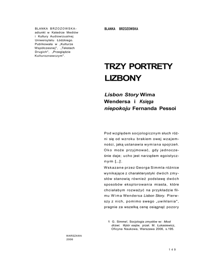 BLANKA B R Z O Z O W S K A adiunkt w Katedrze Mediów i Kultury Audiowizualnej Uniwersytetu Łódzkiego. Publikowała w „Kulturze Współczesnej", „Tekstach Drugich", „Przeglądzie Kulturoznawczym". BLANKA BRZOZOWSKA TRZY PORTRETY LIZBONY Lisbon Story Wima Wendersa i Księga niepokoju Fernanda Pessoi Pod względem socjologicznym słuch różni się od w z r o k u brakiem owej w z a j e m ności, jaką ustanawia w y m i a n a spojrzeń. O k o może p r z y j m o w a ć , gdy j e d n o c z e śnie daje; u c h o jest narządem egoistycz1 n y m [...] . W s k a z a n e przez G e o r g a S i m m l a różnice wynikające z charakterystyki d w ó c h z m y słów stanowią również podstawę d w ó c h sposobów e k s p l o r o w a n i a miasta, które chciałabym rozważyć na przykładzie filmu W i m a W e n d e r s a Lisbon Story. Pierwszy z n i c h , p o m i m o swego „ u w i k ł a n i a " , pragnie za wszelką cenę osiągnąć pozory 1 G. Simme!, Socjologia zmysłów w: Most drzwi. Wybór esejów, przeł. M. Łukasiewicz, Oficyna Naukowa, Warszawa 2006, s.195. WARSZAWA 2006 1 4 9 BLANKA BRZOZOWSKA o b i e k t y w i z m u , drugi, p o m i m o swego zdystansowanego „ e g o i z m u " , odsłania w i e lowarst wowy, intymny o b r a z miasta. Reprezentantami tych d w ó c h postaw są w tym w y p a d k u Friedrich M o n r o e , reżyser i Philip Winter, d ź w i ę k o w i e c . O b y dwaj przemierzają o b c e sobie miasto, Lizbonę, poszukując materiałów do filmu (tak naprawdę jednak każdy z nich w y o b r a ż a sobie inny film) i uprawiając j e d n o cześnie, każdy na swój sposób, specyficzne formy flânerie. D o d a t k o w y kontekst dla ich poszukiwań stwarza trzeci, inspirujący ich obraz miasta, który p o c h o d z i z p r o z y i poezji portugalskiego pisarza Fernando Pessoi. Konflikt p o m i ę d z y w i z j a m i W i n t e r a i M o n r o e ' a opiera się w dużej mierze na o d m i e n n y c h o d c z y t a n i a c h jego Księgi niepokoju, która stanowi swoisty d z i e n n i k mieszkańca przyjmującego rolę turysty we w ł a s n y m mieście. Pessoa u r o d z i ł się i spędził większość s w e g o ż y c i a w L i z b o n i e i o n a stała się g ł ó w n ą przyczyną p o w s t a n i a , jak i g ł ó w n ą postacią jego s p e c y f i c z n e g o d z i e n n i ka. W e n d e r s , od d a w n a z a f a s c y n o w a n y problematyką miejską, p o s t a n o w i ł wyruszyć do L i z b o n y , z a i n s p i r o w a n y u t w o r a m i P e s s o i , a w szczególności powieś c i ą - d z i e n n i k i e m Księga niepokoju, oraz m u z y k ą portugalskiej grupy M a d r e d e u s , grającej fado. M i a ł powstać f i l m d o k u m e n t a l n y o mieście, powstał natomiast n o w y d z i e n n i k , n i e r o z e r w a l n i e z w i ą z a n y z e s w o i m p o p r z e d n i k i e m , i tak jak o n , z jednej strony w y r a ż a j ą c y osobisty z a c h w y t nad m i a s t e m , subtelność w r a ż e ń towarzyszącą jego o d k r y w a n i u , z drugiej zaś będący w y r a z e m f i l o z o f i c z n y c h przemyśleń autora, jego p o g l ą d ó w na temat sztuki (kina), granic p o z n a n i a , relacji m i e d z y o b i e k t y w i z m e m a s u b i e k t y w i z m e m . W e n d e r s , a w r a z z n i m P h i l i p W i n t e r i Friedrich M o n r o e , przemierzają miasto d o k ł a d n i e tymi s a m y m i ścieżkam i , j a k i m i przemierzał je Fernando Pessoa i w r a z z n i m p o d e j m u j ą p r ó b y o d p o w i e d z i na p y t a n i a : j a k p o z n a j e m y i jakie ma to z n a c z e n i e , jak b a r d z o m o ż e m y być o b i e k t y w n i w t y m , co opisujemy, c z y m o ż n a oddać ulotność wrażeń? W s w o i m d z i e n n i k u Soares (heteronim c z y też semiheteronim pisarza) w y k o r z y stuje metodę pisma automatycznego - i do tego będzie starał się nawiązać M o n roe swoją kamerą na p l e c a c h , obaj bliscy są zaś a u t o m a t y z m o w i spaceru Franza 2 H e s s l a . „Piszę bez z a s t a n o w i e n i a , pozwalając, by słowa kołysały mnie n i c z y m d z i e c k o . Są to z d a n i a bez sensu, bezradnie płynące n i c z y m w o d y rzeki o z m ą c o 2 150 Leszek Sobkiewicz pisze: „Podobnie jak surrealiści, Hessel rozwinął również swoje pismo automatyczne. W poszukiwaniu owego automatyzmu, mającego ustrzec pisarza przed autorskim subiektywizmem, nie korzystał jednak z wiedzy psychoanalitycznej ani też nie sięgał po eksperymenty z narkotykami - jak czynił to chociażby Benjamin - lecz osiągał swój cel dzięki postawie moralnego dystansu. Zadurzenie w spacerze pozwalało mu zapomnieć o sobie, a jednocześnie patrzeć z rezerwą i łagodną TRZY PORTRETY LIZBONY 3 nych f a l a c h , z m i e n n y c h , następujących po s o b i e " . Pisanie staje się dla niego w y z w o l e n i e m od siebie, od subiektywizmu. To samo dotyczy czytania: „Czytam i staję się w o l n y ; uzyskuję o b i e k t y w i z m ; przestaję być sobą i roztargnionym [...] 4 c z y t a m , jak ktoś, kto abdykuje [...] c z y t a m , jak ten, co w ę d r u j e " . A b d y k a c j a , jest tu p o d d a n i e m się d r y f o w a n i u , ale też rezygnacją z siebie jako i n d y w i d u u m p o z n a jącego i rejestrującego swoje p o z n a n i e . Słowa w y m y k a j ą się spod kontroli i z a c z y nają żyć w ł a s n y m ż y c i e m , piszący g o d z i się z tym faktem, nie przestając pisać, 5 gdyż jedynie to przynosi mu s p o k ó j . Pessoę interesuje eksplorowanie ulotności, także własnego życia, które j a w i się tu jako spektakl ze z m i e n i a j ą c y m się nie6 ustannie s c e n a r i u s z e m . O b s e r w o w a n i e pasażerów miejskiego tramwaju staje się d l a niego pretekstem do u r u c h a m i a n i a luźnych skojarzeń, metoda ta p o z w a l a w ciągu kilku minut „przeżyć całe ż y c i e " . Interesują go szczegóły, jak na przyk