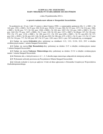 UCHWAŁA NR XXII/254/2012 RADY MIEJSKIEJ W STARGARDZIE SZCZECIŃSKIM z dnia 30 października 2012 r. w sprawie nadania nazw ulicom w Stargardzie Szczecińskim. Na podstawie art. 18 ust. 2 pkt 13 ustawy z dnia 8 marca 1990 r. o samorządzie gminnym (Dz. U. z 2001 r. Nr 142, poz. 1591; z 2002 r. Nr 23, poz. 220, Nr 62, poz. 558,Nr 113, poz. 984, Nr 153, poz. 1271 i Nr 214, poz. 1806, z 2003 r. Nr 80, poz. 717 i Nr 162, poz. 1568; z 2004 r. Nr 102, poz. 1055 i Nr 116, poz. 1203; z 2005 r. Nr 172, poz. 1441 iNr 175, poz. 1457; z 2006 r. Nr 17, poz. 128 i Nr 181, poz. 1337; z 2007 r. Nr 48,poz. 327, Nr 138, poz. 974 i Nr 173, poz. 1218; z 2008 r. Nr 180, poz.1111 i Nr 223, poz.1458; z 2009 r. Nr 52, poz.420 i Nr 157, poz.1241, z 2010 r. Nr 28, poz.142 i 146, Nr 40, poz.230 i Nr 106, poz. 675, z 2011 r. Nr 21, poz. 113, Nr 117, poz. 679, Nr 134, poz. 777, Nr 149, poz. 887 i Nr 217, poz. 1281 oraz z 2012 r. poz. 567) uchwala się, co następuje: § 1. Nadaje się nazwę Sybiraków ulicy położonej na działkach 11/2, 13/2, 21/24, 22/2, 29/3 w obrębie ewidencyjnym numer 1 miasta Stargard Szczeciński. § 2. Nadaje się nazwę Olgi Boznańskiej ulicy położonej na działce 21/5 w obrębie ewidencyjnym numer 1 miasta Stargard Szczeciński. § 3. Nadaje się nazwę Tadeusza Makowskiego ulicy położonej na działce 21/14 w obrębie ewidencyjnym numer 1 miasta Stargard Szczeciński. § 4. Położenie ulic, o których mowa w § 1 , 2, 3 określa mapa stanowiąca załącznik do niniejszej uchwały. § 5. Wykonanie uchwały powierza się Prezydentowi Miasta Stargard Szczeciński. § 6. Uchwała wchodzi w życie po upływie 14 dni od dnia ogłoszenia w Dzienniku Urzędowym Województwa Zachodniopomorskiego. Załącznik do Uchwały Nr XXII/254/2012 Rady Miejskiej w Stargardzie Szczecińskim z dnia 30 października.2012 r. UZASADNIENIE W związku z realizacją miejscowego planu zagospodarowania przestrzennego w rejonie ulic Jana Matejki, Wojciecha Kossaka, Podmiejskiej i Podleśnej, zachodzi konieczność nadania nazw dla nowych ulic, co umożliwi zaprojektowanie numeracji porządkowej dla przewidzianej w planie zabudowy usług rzemiosła z mieszkaniami. 1. Dla upamiętnienia martyrologii polskich zesłańców, na wniosek Związku Sybiraków Oddział Rejonowy w Stargardzie nadaje się ulicy nazwę Sybiraków. Liczba osób zamordowanych przez Sowietów pozostaje nadal nieznana. Nie ma wątpliwości, że należy do nich zaliczyć nie tylko ofiary rozstrzeliwań czy zbiorowych zabójstw popełnionych na polskich więźniach politycznych, ale również tych, którzy zmarli z powodu warunków w łagrach czy na zesłaniu. Dla zesłańców Sybir jest symbolem represji wobec Polaków zsyłanych do łagrów i więzień, najczęściej w dalekowschodnie strony byłego ZSRR, określane mianem nieludzkiej ziemi, która choć oddalona o tysiące kilometrów, pozostaje cząstką naszej polskiej historii. Nieustannie trzeba ożywiać pamięć o losie zesłanych rodaków, również w formie nazwania ulicy ich imieniem. 2. Dla podtrzymania charakteru nazw ulic przyległych, który związany jest z wybitnymi malarzami polskimi, nadaje się ulicom nazwy: Olgi Boznańskiej, wybitnej polskiej malarki okresu Młodej Polski, która urodziła się w roku 1865 w Krakowie, zmarła w roku 1940 w Paryżu. Głównie portrecistka, malowała też wysmakowane w kompozycji, subtelne w kolorystyce martwe natury. Pozostawiła także nieliczne pejzaże miejskie oraz wczesne kompozycie rodzajowe. Malarstwa uczyła się u Antoniego Piotrowskiego i Kazimierza Pochwalskiego, w latach 1886-1898 studiowała w Monachium. Ukształtowana w środowisku krakowsko-monachijskim w 1898 r. osiadła na stałe w Paryżu, gdzie stała się czołową przedstawicielką polskiej kolonii artystycznej. Od 1898 była członkiem Towarzystwa Artystów Polskich "Sztuka", od 1901 Société Nationale des Beaux Arts. W roku 1912 została odznaczona we Francji Legią Honorową, a w 1938 orderem Polonia Restituta. Jej najsławniejszym obrazem jest portret „Dziewczynka z chryzantemami” (1894). Tadeusza Makowskiego, który był jednym z najwybitniejszych malarzy polskich XX wieku. Urodził się w roku 1882 w Oświęcimiu, zmarł w roku 1932 w Paryżu. Pozostawił ponad 600 obrazów olejnych, kilka tysięcy rysunków, akwarel i rycin. Tadeusz Makowski w latach 1903-08 studiował w Akademii Sztuk Pięknych w Krakowie. W roku 1908 wyjechał do Paryża, gdzie zetknął się z ówczesną awangardą artystyczną i uległ wpływowi kubizmu. Po wybuchu I wojny światowej wyjechał do Bretanii, tam namalował szereg realistycznych obrazów, głównie o tematyce pejzażowej i rodzajowej. Kilkakrotnie spędzał też wakacje w Owerni. W 1923 związał się z międzynarodową grupą malarzy, z którą wystawiał w galerii Berthe Weill. Makowski zapoczątkował wówczas swój własny, niepowtarzalny styl, będący podsumowaniem dotychczasowych doświadczeń artystycznych - kubizmu, malarstwa holenderskiego, naiwnego realizmu i polskiej sztuki ludowej. Bohaterami obrazów Makowskiego są przeważnie dzieci, wyobrażone jako małe figurki w spiczastych czapeczkach, pokazane w nastrojowych scenach domowych (głównie wiejskich), teatralnych, muzycznych czy maskaradowych. Malował też kompozycje zawodów i groteski charakterologiczne. Malarz zmarł w wieku 50 lat. Pochowany jest na polskim cmentarzu pod Paryżem Mając powyższe na uwadze, podjęcie uchwały uważa się za zasadne.