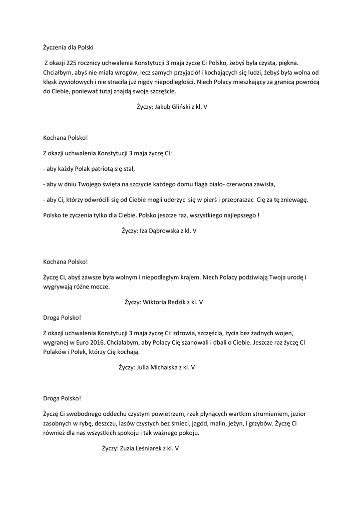 Życzenia dla Polski Z okazji 225 rocznicy uchwalenia Konstytucji 3 maja życzę Ci Polsko, żebyś była czysta, piękna. Chciałbym, abyś nie miała wrogów, lecz samych przyjaciół i kochających się ludzi, żebyś była wolna od klęsk żywiołowych i nie straciła już nigdy niepodległości. Niech Polacy mieszkający za granicą powrócą do Ciebie, ponieważ tutaj znajdą swoje szczęście. Życzy: Jakub Gliński z kl. V Kochana Polsko! Z okazji uchwalenia Konstytucji 3 maja życzę CI: - aby każdy Polak patriotą się stał, - aby w dniu Twojego święta na szczycie każdego domu flaga biało- czerwona zawisła, - aby Ci, którzy odwrócili się od Ciebie mogli uderzyc się w pierś i przepraszac Cię za tę zniewagę. Polsko te życzenia tylko dla Ciebie. Polsko jeszcze raz, wszystkiego najlepszego ! Życzy: Iza Dąbrowska z kl. V Kochana Polsko! Życzę Ci, abyś zawsze była wolnym i niepodległym krajem. Niech Polacy podziwiają Twoja urodę i wygrywają różne mecze. Życzy: Wiktoria Redzik z kl. V Droga Polsko! Z okazji uchwalenia Konstytucji 3 maja życzę Ci: zdrowia, szczęścia, życia bez żadnych wojen, wygranej w Euro 2016. Chciałabym, aby Polacy Cię szanowali i dbali o Ciebie. Jeszcze raz życzę CI Polaków i Polek, którzy Cię kochają. Życzy: Julia Michalska z kl. V Droga Polsko! Życzę Ci swobodnego oddechu czystym powietrzem, rzek płynących wartkim strumieniem, jezior zasobnych w rybę, deszczu, lasów czystych bez śmieci, jagód, malin, jeżyn, i grzybów. Życzę Ci również dla nas wszystkich spokoju i tak ważnego pokoju. Życzy: Zuzia Leśniarek z kl. V Kochana Polsko! Z okazji 225. rocznicy uchwalenia Konstytucji 3 maja życzę Tobie: - żeby wszyscy Polacy Cię szanowali i znali Twoją historię, - żeby wszyscy Polacy przestrzegali ustaw zawartych w konstytucji, - żebyś na zawsze pozostała niepodległym państwem. Życzy Maciek Ciężki z kl. V Kochana Polsko! Z okazji tak ważnego Święta chciałabym życzyć Ci wszystkiego co najlepsze dla Ciebie. Zachwycaj wszystkich Polaków swą niezwykłą urodą i cudnymi zabytkami. Niech Polacy Cię kochają ! Życzy: Anita Świtoń z kl. V Kochana Polsko! Życzę Tobie byś była taka jaką Cię kocham darzona szacunkiem, niosąca spokój, bądź nam domem, w którym będziemy się czuli dobrze i bezpiecznie. Życzy: Martyna Czaja z kl. IV Kochana Polsko! Z okazji Święta 3 maja życzę Ci, abyś zawsze była piękna i wspaniała i żeby Ci, którzy nie dbają i niszczą Twoje tereny zmienili swoje postępowanie. Życzę Ci, abyś zachwycała nas swoją pięknością. Życzy: Filip Gąszczak z kl. IV Droga Polsko! Chcę Ci podziękować Polsko, za to że jesteś moim krajem, że się tu urodziłam, mieszkam, mam swoją rodzinę. Każdego dnia budzę się i cieszę, że to właśnie w Baranowie chodzę do szkoły, mam przyjaciół. Wiem, że nacierpiałaś się, gdy nasz kraj był wiele razy atakowany, ludzie trafiali do niewoli, były nawet momenty, gdy na mapie nie było Polski. Teraz od wielu lat cieszysz się wolnością, dlatego przede wszystkim wolności Ci życzę z okazji 225. rocznicy uchwalenia Konstytucji 3 maja. Niech polski naród cieszy się nią nieustannie, niech dzieci i młodzież pamiętają o ludziach, dzięki którym możemy spokojnie spać. Niech polska tradycja i zwyczaje będą zawsze gościły w naszych domach, bo przecież są częścią Polski. Niech każdego roku dzień rocznicy uchwalenia Konstytucji 3 maja będzie uroczyście świętowany, poczynając już od najmłodszych pokoleń. Polska to siła, którą tworzymy wszyscy razem, a dzięki sile zawsze przetrwamy. Wszystkiego dobrego Polsko! Życzy: Aleksandra Parzybót z kl. IV Kochana Polsko! Z okazji 225. rocznicy uchwalenia Konstytucji 3 maja, życzę Ci, abyś zawsze była niepodległa i coraz piękniejsza. Niech Twoja ziemia rodzi obfite plony, powietrze niech będzie czyste, ludzie szczęśliwi, dobrzy i sprawiedliwi. Życzy: Mateusz Korczak z kl. V