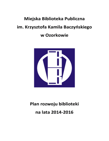 Miejska Biblioteka Publiczna im. Krzysztofa Kamila Baczyńskiego w Ozorkowie Plan rozwoju biblioteki na lata 2014-2016 Miejska Biblioteka Publiczna im. Krzysztofa Kamila Baczyńskiego w Ozorkowie PLAN ROZWOJU BIBLIOTEKI NA LATA 2014-2016 I. Wizytówka biblioteki 20-tys. Gmina Miasto Ozorków jest położona w woj. łódzkim (prawa miejskie 1816 r.). Funkcjonują tu instytucje zaspokajające podstawowe potrzeby mieszkańców, m. in. przedszkola, szkoły, urzędy, przychodnie zdrowia, domy kultury oraz zakłady przemysłowe w ŁSSE. Miejską Bibliotekę Publiczną im. K.K. Baczyńskiego w Ozorkowie powołano Uchwałą Prezydium Miejskiej Rady Narodowej z dn. 2.01.1952 r. 15.03.1991 r. została wpisana do miejskiego rejestru instytucji kultury pod nr 1. Zakres działania Biblioteki obejmuje przede wszystkim gromadzenie, opracowywanie i udostępnianie zbiorów (z uwzględnieniem regionaliów) oraz działalność informacyjną i wydawniczą. Istotnym elementem pracy placówki jest także działalność edukacyjna i kulturalna, skierowana do różnych grup wiekowych (w tym realizacja projektów dotowanych z innych źródeł, np. MKiDN). Na sieć biblioteczną składają się: - Biblioteka główna w centrum miasta - Filia nr 1 dla Dorosłych i Filia nr 2 dla Dzieci i Młodzieży na dużym osiedlu. Biblioteka zatrudnia 8 pracowników merytorycznych i 3 pracowników obsługi. Priorytetem w działaniu jest popularyzacja wiedzy o regionie, a hasłem przewodnim "Biblioteka - dobre miejsce dla człowieka". Zachęcamy do kontaktu: Miejska Biblioteka Publiczna im. K. K. Baczyńskiego w Ozorkowie Listopadowa 6b, 95-035 Ozorków tel. 42 710-31-17, 508-100-392 e-mail: [email protected] www.mbp.ozorkow.net www.facebook.com/mbp.ozorkow Dyrektor: starszy kustosz mgr Danuta Trzcińska tel. 42 710-31-16 Filie biblioteczne: Filia nr 1 dla Dorosłych ul. R. Mielczarskiego 17, 95-035 Ozorków Kierownik: starszy kustosz mgr Marietta Kaźmierczak tel. 42 710-31-95 Filia nr 2 dla Dzieci i Młodzieży ul. R. Mielczarskiego 17, 95-035 Ozorków Kierownik: starszy kustosz mgr Grażyna Chmielecka tel. 42 710-31-95 2 Miejska Biblioteka Publiczna im. Krzysztofa Kamila Baczyńskiego w Ozorkowie PLAN ROZWOJU BIBLIOTEKI NA LATA 2014-2016 II. Potencjał biblioteki Analiza SWOT Mocne strony biblioteki Słabe strony biblioteki 1. Dobra lokalizacja ( biblioteka główna - 1. Brak środków finansowych na "wkład centrum miasta, filie - największe osiedle) własny" przy ubieganiu się o dotacje, np. 2. Filie: dla dorosłych i dla dzieci i młodzieży MKiDN znajdują się w jednym budynku, co 2. Bariery architektoniczne (schody umożliwia bardzo dobrą współpracę np. wejściowe do wszystkich bibliotek) jednoczesne prowadzenie warsztatów dla dzieci i rodziców 3. Brak na terenie miasta drogowskazów prowadzących do bibliotek 3. Bliskość urzędów, szkół, instytucji 4. Dobre warunki lokalowe (przestronne pomieszczenia, z ogrzewaniem, widne, z dobrym wyposażeniem, w filiach dostęp do toalet, w tym jednej dla osób niepełnosprawnych, szatni) 4. Brak szatni i za mało toalet w bibliotece głównej 5. Szeroka oferta działań kulturalnych (wystawy i wernisaże, spotkania z pisarzami, klub DKK, wyjazdy do kin, teatrów) oraz edukacyjnych (warsztaty, lekcje biblioteczne, Internetowy Klub Seniora, konkursy i inne) 6. Brak zbiorów multimedialnych (płyt CD, DVD, audiobooków, e-booków) 5. Brak odpowiednio wyposażonego Kącika Malucha w filii dla dzieci 7. Zbyt mała oferta czasopism 8. Brak sali widowiskowej w filiach 6. Szeroka współpraca z instytucjami (oświatowymi, kulturalnymi i pomocy społecznej, działającymi na terenie miasta oraz z SE-MA-FORem), organizacjami (Komenda Hufca ZHP w Ozorkowie) i stowarzyszeniami ("Spełnijmy Nadzieję", Warsztatami Terapii Zajęciowej, działającym przy łódzkim oddziale Stowarzyszenia Osób Cierpiących na Padaczkę) 7. Wykwalifikowana kadra - 8 pracowników merytorycznych (w tym 6 z wykształceniem wyższym, 2 ze średnim bibliotekarskim) z dziewięcioletnim stażem pracy (2 osoby) i 3 Miejska Biblioteka Publiczna im. Krzysztofa Kamila Baczyńskiego w Ozorkowie PLAN ROZWOJU BIBLIOTEKI NA LATA 2014-2016 ponad dwudziestoletnim stażem pracy (6 osób) 8. Umiejętność pisania wniosków aplikacyjnych przez bibliotekarki 9. Automatyzacja procesów bibliotecznych, katalogi on-line, dygitalizacja czasopism lokalnych 10. Działalność wydawnicza (publikacja 16 pokonkursowych dwujęzycznych tomików wierszy oraz antologii laureatów konkursu literackiego "Ozorków - Moje Miasto Najbliższe" oraz książek: "Architektoniczne Walory Ozorkowa", "Bibliografia miasta i gminy Ozorków", "Moje Pejzaże" Jana Cholewczyńskiego) 11. Pozyskiwanie stażystów 12. Pozyskiwanie sponsorów (wspierających działalność kulturalną, remont łazienek) Szanse Zagrożenia 1. Możliwość zawiązania partnerstwa z organizacjami np. nieposiadającymi osobowości prawnej, ale zapewniającymi wkład własny i wspólnego aplikowania o dotacje 1. Zbyt niska dotacja Organizatora: niewystarczająca oferta nowości wydawniczych i czasopism - ryzyko zmniejszenia oferty działań kulturalnych niemożność uczestnictwa w płatnych 2. Wykorzystanie potencjału lokalnych kursach poszerzających kwalifikacje kadry twórców w działalności kulturalnej i 2. Spadek wykorzystania księgozbioru edukacyjnej. Biblioteka udostępnia lokal i popularnonaukowego, spowodowany gromadzi uczestników, zapewnia promocję łatwym dostępem do informacji w artystom w zamian za bezpłatne spotkania, Internecie wystawy, warsztaty oraz promocję bibliotek. 3. Niż demograficzny oraz emigracja 3. Doskonalenie bibliotecznej zawodowe kadry mieszkańców Ozorkowa 4. Konkurencja telewizji i gier komputerowych 5. Brak perspektyw na zlikwidowanie barier architektonicznych przy wejściach do bibliotek 4 Miejska Biblioteka Publiczna im. Krzysztofa Kamila Baczyńskiego w Ozorkowie PLAN ROZWOJU BIBLIOTEKI NA LATA 2014-2016 Potencjał biblioteki