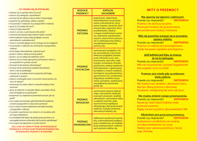 CZY ZDARZA SIĘ, ŻE KTOŚ BLISKI: traktuje Cię w sposób, który Cię rani? obrzuca Cię obelgami, wyzwiskami? zmusza Cię do robienia rzeczy, które Cię poniżają? popycha Cię, policzkuje, uderza, szarpie? nie pozwala Ci widywać się z przyjaciółmi i rodziną? grozi, że Cię zabije lub zrani? niszczy Twoją własność? mówi ci, że wie, co jest słuszne dla ciebie? ośmiesza lub obraża ludzi, których lubisz i cenisz? stale krytykuje Twoją osobę (poglądy, uczucia, pochodzenie, wykształcenie)? mówi ci, że jesteś głupia, że do niczego się nie nadajesz? nie pozwala ci widywać się i rozmawiać z przyjaciółmi, rodziną? dusił, kopał, obezwładniał, wykręcał ręce? groził ci nożem, siekierą, bronią palną? groził ci, że cię zabije lub dotkliwie zrani? obwinia cię za swoje agresywne zachowanie, mówi ci, że wszystkiemu ty jesteś winna? zmuszał cię do pożycia seksualnego? zmusza cię do uprawiania praktyk seksualnych, które ci się nie podobają? straszył cię, że pobije twoich przyjaciół, jeśli będą próbowali ci pomóc? zabiera ci pieniądze, każe o nie prosić lub po prostu nie chce ich dawać? zachowuje się wobec dzieci w sposób budzący Twój sprzeciw? grozi, że zabierze ci wszystko (dzieci, pieniądze, dom), jeśli nie będziesz mu posłuszna? przeprasza cię, rozpieszcza prezentami po tym, jak cię pobił? Czy czujesz się nieswojo, gdy dochodzi do spotkania z twoimi przyjaciółmi w obecności partnera? Czy w czasie trwania małżeństwa zerwałaś kontakty z przyjaciółmi, rodziną? Czy jesteś z partnerem, bo mówił ci, że cię zabije, jeśli od niego odejdziesz? Czy kiedykolwiek byłaś tak pobita przez partnera, że wymagałaś pomocy lekarskiej lub leczenia szpitalnego? Czy czujesz się zagrożona w swoim domu? JEŚLI CHOĆ NA JEDNO PYTANIE ODPOWIEDZIAŁAŚ TWIERDZĄCO, ISTNIEJE DUŻE PRAWDOPODOBIEŃSTWO, ŻE DOZNAJESZ PRZEMOCY W RODZINIE. RODZAJE PRZEMOCY KATALOG ZACHOWAŃ PRZEMOC FIZYCZNA popychanie, odpychanie, obezwładnianie, przytrzymywanie, policzkowanie, szczypanie, kopanie, duszenie, bicie otwartą ręką i pięściami, bicie przedmiotami, ciskanie w kogoś przedmiotami, parzenie, polewanie substancjami żrącymi, użycie broni, porzucanie w niebezpiecznej okolicy, nieudzielanie koniecznej pomocy, itp. PRZEMOC PSYCHICZNA wyśmiewanie poglądów, religii, pochodzenia, narzucanie własnych poglądów, karanie przez odmowę uczuć, zainteresowania, szacunku, stała krytyka, wmawianie choroby psychicznej, izolacja społeczna (kontrolowanie i ograniczanie kontaktów z innymi osobami), domaganie się posłuszeństwa, ograniczanie snu i pożywienia, degradacja werbalna (wyzywanie, poniżanie, upokarzanie, zawstydzanie),stosowanie gróźb, itp. PRZEMOC SEKSUALNA PRZEMOC EKONOMICZNA wymuszanie pożycia seksualnego, wymuszanie nieakceptowanych pieszczot i praktyk seksualnych, wymuszanie seksu z osobami trzecimi, sadystyczne formy współżycia seksualnego, demonstrowanie zazdrości, krytyka zachowań seksualnych kobiety, itp. odbieranie zarobionych pieniędzy, uniemożliwianie podjęcia pracy zarobkowej, nie zaspakajanie podstawowych, materialnych potrzeb rodziny, itp. MITY O PRZEMOCY Nie ujawnia się tajemnic rodzinnych. Prawda czy nieprawda? NIEPRAWDA Przemoc nie skończy się sama. Pierwszym krokiem do jej przerwania jest przełamanie izolacji i milczenia. Nikt nie powinien wtrącać się w prywatne sprawy rodziny. Prawda czy nieprawda? NIEPRAWDA Przemoc w rodzinie jest przestępstwem. Każdy ma prawo zapobiec przestępstwu. Jeśli kobieta jest bita, to znaczy, że na to zasługuje. Prawda czy nieprawda? NIEPRAWDA Nikt nie ma prawa bić i poniżać kogokolwiek bez względu na to co zrobił. Przemoc jest wtedy gdy są widoczne ślady pobicia. Prawda czy nieprawda? NIEPRAWDA Nie trzeba mieć siniaków i złamanych kości, aby być ofiarą przemocy domowej. Poniżanie i obelgi bolą tak samo jak bicie. Nie można zmienić swego przeznaczenia. Prawda czy nieprawda? NIEPRAWDA Nawet po wielu latach kobieta może przerwać przemoc. Nigdy nie jest za późno, aby powiedzieć NIE! Alkoholizm jest przyczyną przemocy. Prawda czy nieprawda? NIEPRAWDA Uzależnienie od alkoholu nie zwalnia od odpowiedzialności za czyny. Należy karać sprawcę przemocy i leczyć jego chorobę.