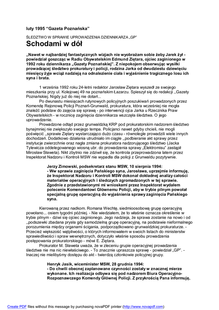 luty 1995 “Gazeta Poznańska” ŚLEDZTWO W SPRAWIE UPROWADZENIA DZIENNIKARZA „GP” Schodami w dół ,,Nawet w najbardziej fantastycznych wizjach nie wyobrażam sobie żeby Jarek żył powiedział goszcząc w Radiu Obywatelskim Edmund Ziętara, ojciec zaginionego w 1992 roku dziennikarza „Gazety Poznańskiej”. Z niepokojem obserwując wysiłki prowadzącej śledztwo prokuratury i policji, rodzina Jarka od dwudziestu dziewięciu miesięcy żyje wciąż nadzieją na odnalezienie ciała i wyjaśnienie tragicznego losu ich syna i brata. 1 września 1992 roku 24-letni redaktor Jarosław Ziętara wyszedł ze swojego mieszkania przy ul. Kolejowej 49 na poznańskim Łazarzu. Spieszył się do redakcji ,,Gazety Poznańskiej. Nigdy już do niej nie dotarł... Po dwunastu miesiącach rutynowych policyjnych poszukiwań prowadzonych przez Komendę Rejonową Policji Poznań-Grunwald, prokuratura, która wcześniej nie mogła znaleźć podstaw do zajęcia się sprawą - po interwencji ojca Jarka u Rzecznika Praw Obywatelskich - w rocznicę zaginięcia dziennikarza wszczęła śledztwa. O jego uprowadzenie. Prowadzone odtąd przez grunwaldzką KRP pod prokuratorskim nadzorem śledztwo bynajmniej nie zwiększyło swojego tempa. Policjanci nawet gdyby chcieli, nie mogli poświęcić ,,sprawie Ziętary wystarczająco dużo czasu - równolegle prowadzili wiele innych dochodzeń. Dodatkowo działania utrudniało im ciągłe ,,podbieranie akt sprawy przez instytucje zwierzchnie oraz nagła zmiana prokuratora nadzorującego śledztwo (Jacka Tylewicza oddelegowanego wiosną ubr. do prowadzenia sprawy „Elektromisu” zastąpił Mirosław Sławeta). Nikt zbytnio nie zdziwił się, że kontrola przeprowadzona latem przez Inspektorat Nadzoru i Kontroli MSW nie wypadła dla policji z Grunwaldu pozytywnie. Jerzy Zimowski, podsekretarz stanu MSW, 10 sierpnia 1994: - Ww sprawie zaginięcia Pańskiego syna, Jarosława, uprzejmie informuję, że Inspektorat Nadzoru i Kontroli MSW dokonał dokładnej analizy całości materiałów operacyjnych i śledczych zgromadzonych w tej sprawie. Zgodnie z przedstawionymi mi wnioskami przez Inspektorat wydałem polecenie Komendantowi Głównemu Policji, aby w trybie pilnym powołał specjalną grupę operacyjną do wyjaśnienia sprawy zaginięcia Pańskiego syna. Kierowaną przez nadkom. Romana Wechtę, siedmioosobową grupę operacyjną powołano... osiem tygodni później. - Nie wiedziałem, że to właśnie oznacza określenie w trybie pilnym - dziwi się ojciec zaginionego. Jego nadzieja, że sprawa zostanie na nowo i od ,,podszewki zbadana prysła gdy samodzielną grupę operacyjną, na podstawie nieformalnego porozumienia między organami ścigania, podporządkowano grunwaldzkiej prokuraturze. Przecież większość wątpliwości, o których informowałem w swoich listach do ministerstw sprawiedliwości i spraw wewnętrznych, dotyczyło właśnie sposobu prowadzenia postępowania prokuratorskiego - mówi E. Ziętara. Prokurator M. Sławeta uważa, że w zleceniu grupie operacyjnej prowadzenia śledztwa nie ma nic niewłaściwego. - To znacznie upraszcza sprawę - powiedział „GP”. Inaczej nie mielibyśmy dostępu do akt - twierdzą członkowie policyjnej grupy. Henryk Jasik, wiceminister MSW, 28 grudnia 1994: - Do chwili obecnej zaplanowane czynności zostały w znacznej mierze wykonane. Ich realizacja odbywa się pod nadzorem Biura OperacyjnoRozpoznawczego Komendy Głównej Policji. Z przykrością Pana informuję, Create PDF files without this message by purchasing novaPDF printer (http://www.novapdf.com) że mimo dużej aktywności powołanej grupy i widocznej staranności dokonywanych przez nią sprawdzeń każdej poszlaki mogącej naświetlić okoliczności zaginięcia Pana syna, nie zdołano dotychczas uzyskać informacji pozwalających na ustalenie jego losów. - Mój syn był dziennikarzem i dlatego zginął - uważa ojciec zaginionego dziennikarza regularnie występując do MSW z listami wskazującymi na liczne wątki i okoliczności, których poruszenie - jest o tym przekonany - może pomóc wyjaśnić los jego syna. Czuje, iż jego starania przyjmowane są z niechęcią: szef grupy operacyjnej nie chce zgodzić się na rozmowę, a na żadne z pytań, których wiele zadał w swoich listach, nie otrzymał odpowiedzi... W połowie stycznia, oburzony zlekceważeniem jego kolejnego wystąpienia Edmund Ziętara wystosował list otwarty do Andrzeja Milczanowskiego, szefa MSW. - Jako obywatel tego kraju uważam to za niepojęte, a jako ojciec Jarka za karygodne - mówi - To wygląda tak jakby nikt nie chciał wydobyć na światło dzienne prawdy o tym co stało się z moim synem. Przez tyle miesięcy... - Sprawa Jarosława Ziętary jest najdłużej prowadzonym dochodzeniem w naszej prokuraturze - przyznaje Andrzej Jóźwiak, szef Prokuratury Rejonowej Poznań-Grunwald. W ostatnich dniach stycznia Prokuratura Wojewódzka przedłużyła postępowanie o kolejne, zdaniem prokuratora Jóźwiaka już ostatnie, dwa miesiące. Szesnasty i siedemnasty. Barbara Malczewska, Departament Prokuratury Ministerstwa Sprawiedliwości: - Obecnie sprawa jest w toku i wykonywane są czynności procesowe mające na celu wszechstronne wyjaśnienie okoliczności zdarzenia i dopiero po wyczerpaniu wszystkich możliwych do przeprowadzenia dowodów, prokurator będzie rozważał sposób merytorycznego zakończenia postępowania. Prokurator Sławeta nie ma złudzeń. Od dawna zapowiada umorzenie dochodzenia. Jest bardzo zadowolony ze współpracy ze specjalną grupą operacyjną. ,,Gdyby śledztwo prowadzili policjanci z komendy na Grunwaldzie nigdy nie zebraliby w tak krótkim czasie tyle materiału - powiedział reporterowi ,,GP. Prokurator przewiduje miesiąc na zapoznanie się z wynikami pracy policji: - potem pan Ziętara, jako poszkodowany, będzie mógł zapoznać się z aktami i ustosunkować do podjętej decyzji. Rodzina Jarka zapowiada, że nie usatysfakcjonuje jej umorzenie do
