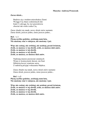 Muzyka: Andrzej Praszczak Zaraz dzień... Budzisz się z trudem mieszkańcu Ziemi Wciąga Cię chaos codziennych dni brak Ci odwagi, by żyć prawdziwie chociaż tak wiele czeka Cię. Zaraz zbudzi się ranek, nowy dzień znów nastanie Zaraz dzień, jeszcze jeden, zaraz jeszcze jeden... Ref. / x 2 Płyną szybko godziny, uciekają nam lata, Nie możemy stać w miejscu, nie możemy i już. Więc nie czekaj, nie zwlekaj, nie uciekaj, przed światem, Zrób, co możesz w tej chwili, zrób, co możesz dziś znów. Zrób, co możesz w tej chwili, Zrób, co możesz w tej chwili, Zrób, co możesz, co możesz dziś znów. Nadzieją musisz pocieszać smutnych Wiarę w konieczność dawać, nie brać Miłością leczyć zranione serca Z radością przyjąć wskazania Mędrca. Zaraz zbudzi się ranek, nowy dzień znów nastanie Zaraz dzień, jeszcze jeden, zaraz jeszcze jeden... Ref. / x 2 Płyną szybko godziny, uciekają nam lata, Nie możemy stać w miejscu, nie możemy i już. Więc nie czekaj, nie zwlekaj, nie uciekaj, przed światem, Zrób, co możesz w tej chwili, zrób, co możesz dziś znów. Zrób, co możesz w tej chwili, Zrób, co możesz w tej chwili, Zrób, co możesz, co możesz dziś znów.
