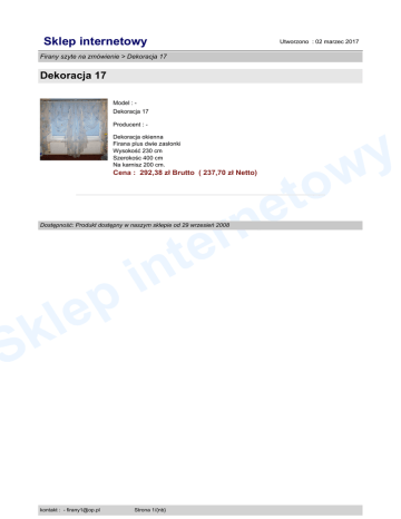 Sklep internetowy Utworzono : 02 marzec 2017 Firany szyte na zmówienie > Dekoracja 17 Dekoracja 17 Model : Dekoracja 17 Producent : Dekoracja okienna Firana plus dwie zasłonki Wysokość 230 cm Szerokośc 400 cm Na karnisz 200 cm. Cena : 292,38 zł Brutto ( 237,70 zł Netto) n r e Dostępność: Produkt dostępny w naszym sklepie od 29 wrzesień 2008 S p e l k kontakt : - [email protected] t in Strona 1/{nb} o t e y w