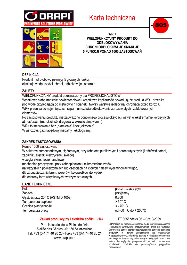 Karta techniczna WR + WIELOFUNKCYJNY PRODUKT DO ODBLOKOWYWANIA CHRONI ODBLOKOWUJE SMARUJE 5 FUNKCJI PONAD 1000 ZASTOSOWAŃ DEFINICJA Produkt hydrofobowy pełniący 5 głównych funkcji: eliminuje wodę, czyści, chroni, odblokowuje i smaruje. ZALETY WIELOFUNKCYJNY produkt przeznaczony dla PROFESJONALISTÓW. Wyjątkowo słabe napięcie powierzchniowe i wyjątkowa kapilarność powodują, że produkt WR+ przenika pod wodę przylegającą do metalowych ścianek i tworzy warstwę izolacyjną, chroniąca przed korozją. WR+ przenika do najmniejszych szpar i umożliwia odblokowanie zardzewiałych i zablokowanych elementów . Po zastosowaniu produktu nie zauważono ponownego procesu oksydacji nawet w ekstremalnie korozyjnych atmosferach (morskiej, sól drogowa w okresie zimowym...) WR+ to smarowanie bez „plamienia” i bez „oliwienia”. W aerozolu: gaz napędowy niepalny i ekologiczny. ZAKRES ZASTOSOWANIA Ponad 1000 zastosowań. W sektorze samochodowym, ciężarowym, przy robotach publicznych i aeronautycznych (końcówki baterii, zapalniki, złączki elektryczne, świece) w żeglarstwie, flocie handlowej mechanice precyzyjnej, przy zabezpieczaniu mikromechanizmów na wszystkich powierzchniach lub częściach na których należy wyeliminować wilgoć, dla zabezpieczenia broni, rowerów, kołowrotków do wędek dla ochrony form wtryskowych tworzyw sztucznych DANE TECHNICZNE Kolor Zapach Gęstość przy 20° C (ASTM D 4052) Temperatura zapłonu Granica plastyczności Temperatura pracy Zakład produkcyjny i siedziba spółki -1/3 Parc Industriel de la Plaine de l’Ain 5 allée des Cèdres - 01150 Saint-Vulbas Tel. +33 (0)4 74 40 20 20 - Faks +33 (0)4 74 40 20 21 www.orapi.com przezroczysty płyn przyjemny 0,800 > 30° C < - 70° C od -60 ° C do + 200°C FT 805/Indeks 06 – 02/10/2009 ORAPI® nie ma możliwości zapoznać się ze wszystkimi sposobami i warunkami użytkowania produkowanych przez nią wyrobów. ORAPI® nie ponosi żadnej odpowiedzialności odnośnie zgodności produktów w danym zastosowaniu lub stosowanych w szczególnym celu. Informacje zawarte w niniejszym dokumencie nie mogą w żadnym wypadku zastąpić wstępnych prób, które należy bezwzględnie przeprowadzić w celu sprawdzenia przydatności produktu do poszczególnych przypadków zastosowania. Karta techniczna SPOSÓB UŻYCIA ODBLOKOWANIE Rozpryskać dużą ilość produktu na zablokowanych częściach lub zanurzyć je w produkcie. Odczekać, aż produkt przeniknie pomiędzy powierzchnie. Odblokować. SMAROWANIE Nanieść na poszczególne elementy mechaniczne krótko rozpylając. OPAKOWANIE Aerozol 650 ml Bidon 5 l Nr katalogowy 4805 A4 Nr katalogowy 2805 J1 HOMOLOGACJA Przemysł lotniczy: PQ 81600 Zgodny ze specyfikacją: AIR 3634, NATO C 634, UK DEF STAN 68-10 FR DCSEA 231, US MIL L3150 B Amdt 2. Zakład produkcyjny i siedziba spółki 2/3 Parc Industriel de la Plaine de l’Ain 5 allée des Cèdres - 01150 Saint-Vulbas Tel. +33 (0)4 74 40 20 20 - Faks +33 (0)4 74 40 20 21 www.orapi.com FT 805/Indeks 06 – 02/10/2009 ORAPI® nie ma możliwości zapoznać się ze wszystkimi sposobami i warunkami użytkowania produkowanych przez nią wyrobów. ORAPI® nie ponosi żadnej odpowiedzialności odnośnie zgodności produktów w danym zastosowaniu lub stosowanych w szczególnym celu. Informacje zawarte w niniejszym dokumencie nie mogą w żadnym wypadku zastąpić wstępnych prób, które należy bezwzględnie przeprowadzić w celu sprawdzenia przydatności produktu do poszczególnych przypadków zastosowania.