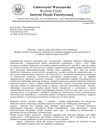 Uniwersytet Warszawski Wydział Fizyki Instytut Fizyki Teoretycznej Hoża 69, 00-681 Warszawa, fax: (+48 22)6219475, e-mail: [email protected] 13 maja 2012 r. prof. dr hab. Witold Bardyszewski Instytut Fizyki Teoretycznej Wydział Fizyki UW ul. Hoża 69, 00-689 Warszawa . Recenzja rozprawy doktorskiej Marty Anny Galickiej pt. “Badanie struktury krystalicznej, elektronowej i własności magnetycznych nanodrutów ze związków półprzewodnikowych III-V”. Przedstawiona rozprawa poświęcona jest teoretycznym badaniom własności strukturalnych, elektronowych i magnetycznych drutów kwantowych wykonanych z GaAs i InAs. Nisko wymiarowe struktury zbudowane ze związków półprzewodnikowych typu III-V, takie jak studnie czy kropki kwantowe od wielu lat leżą w centrum zainteresowania zarówno badań podstawowych jak i przemysłu mikroelektronicznego. Wielkie zalety materiałów III-V takie jak wysoka ruchliwość elektronowa, prosta przerwa energetyczna, szerokie możliwości domieszkowania, w tym jonami magnetycznymi, stanowią o ich użyteczności w różnorakich urządzeniach począwszy od tranzystorów polowych, kwantowych generatorach promieniowania czy też układach spintronicznych. Nanodruty kwantowe wykonane z tych materiałów mogłyby zrewolucjonizować współczesną elektronikę stanowiąc podstawę urządzeń najnowszej generacji takich jak wertykalne tranzystory polowe, lasery i wydajne źródła jednofotonowe. Istnieje też potencjał wykorzystania tego typu struktur do generowania energii w oparciu o zjawisko termoelektryczności. Niestety, technologia otrzymywania wysokiej jakości drutów kwantowych w porównaniu z innymi nanostrukturami jest jeszcze daleka od pożądanego poziomu. Przyczyna tego stanu rzeczy leży w znacznej mierze w ich geometrii i strukturze krystalicznej. Podstawowym celem omawiana pracy doktorskiej była identyfikacja i ewentualnie podanie rozwiązania niektórych problemów stojących na przeszkodzie w wytwarzaniu nanodrutów kwantowych wysokiej jakości. Rozprawa zawiera obszerny wstęp, 4 rozdziały i zwięzłe podsumowanie. Na zakończenie dołączono również informację o dorobku naukowym autorki oraz bibliografię zawierającą 95 pozycji. Pierwsze dwa rozdziały mają charakter wprowadzenia i zawierają omówienie elementarnych własności rozważanych struktur krystalicznych oraz stosowanych metod obliczeniowych. Oryginalne wyniki uzyskane przez mgr M. Galicka są przedstawione w pozostałych dwóch rozdziałach i podsumowaniu. Wstęp zawiera krótkie omówienie badanych zagadnień oraz naświetla istniejący stan badań teoretycznych i doświadczalnych nad drutami kwantowymi typu III-V. Przedstawione są trzy podstawowe grupy problemów na których koncentruje się rozprawa: - wpływ parametrów takich jak struktura krystaliczna, średnica czy kierunek wzrostu nanodrutów kwantowych na ich stabilność strukturalną - mechanizmy domieszkowania nanodrutów, a w szczególności wpływ uwięzienia kwantowego w tych niskowymiarowych strukturach na własności elektronowe domieszki - własności domieszek magnetycznych Mn oraz typy sprzężenia magnetycznego między jonami Mn w nanodrutach. Analiza tak zdefiniowanych zagadnień zaprezentowana w rozprawie zaczyna się od przedstawienia charakterystyki wybranych materiałów półprzewodnikowych tzn. GaAs i InAs. Autorka szczegółowo omawia w rozdziale pierwszym ich strukturę krystaliczną oraz widma elektronowe, zwracając uwagę na istotny fakt, że związki te w normalnych warunkach krystalizują w strukturze blendy cynkowej. Charakteryzuje również różne typy defektów mogących znacząco modyfikować własności tych materiałów. Przedstawione są różne typy domieszek oraz defekty ułożenia, które mają kluczowe znaczenie w przypadku nanodrutów. Kryształy o strukturze blendy cynkowej należą do układów o gęstym upakowaniu i różnią się od kryształów o strukturze wurcytu kolejnością ułożenia poszczególnych warstw atomowych w kierunku <111> w procesie wzrostu. Różnice oddziaływania między atomami w obu strukturach pojawiają się na poziomie trzeciego najbliższego sąsiada i w związku z tym, przy odpowiednio małej różnicy energii formowania obu typów uporządkowania, obserwowane są nanodruty zawierające zarówno partie typu blendy cynkowej jak i partie o strukturze wurcytu. Tak więc podstawową wielkością determinującą strukturę krystaliczną jest całkowita energia stanu podstawowego. Obliczenia energii przedstawione w rozprawie wykonano metodą funkcjonału gęstości. Drugi rozdział zawiera szczegółowy opis zastosowanej metodologii oraz przyjętych przybliżeń. Gęstość elektronowa wyznaczona jest za pomocą tzw. równań Kohna-Shama z funkcjonałem energii korelacji i wymiany przyjętym w przybliżeniu uogólnionych gradientów z poprawką Hubbarda typu U (tzw. metoda DFT+U). Aby zredukować wysiłek numeryczny przy obliczeniach zastosowano odpowiednie pseudopotencjały. Lektura tej części pracy prowadzi do wniosku, że autorka bardzo staranne dobrała metodę oraz przybliżenia odpowiednio do postawionego zadania. W szczególności w przypadku analizy domieszek magnetycznych wprowadzenie poprawki Hubbarda wydaje się nieodzowne. Główne wyniki rozprawy dotyczące nanodrutów niedomieszkowanych zawarte są w rozdziale 3. Wybrana technika obliczeniowa została przetestowana dla struktur objętościowych obu kryształów i skonfrontowana z danymi literaturowymi. Wyznaczono widma elektronowe w kryształach objętościowych wraz z krótkim komentarzem dotyczącym znanego problemu zaniżania przerwy energetycznej półprzewodników w ramach teorii funkcjonału gęstości. Choć istnieją różne metody skorygowania tego defektu, z przedstawionej dyskusji nie mogłem wywnioskować, czy autorka zastosowała którąkolwiek z nich. Jest to o tyle istotne, że w dalszym ciągu przedstawione są widma elektronowe drutów kwantowych również bez
