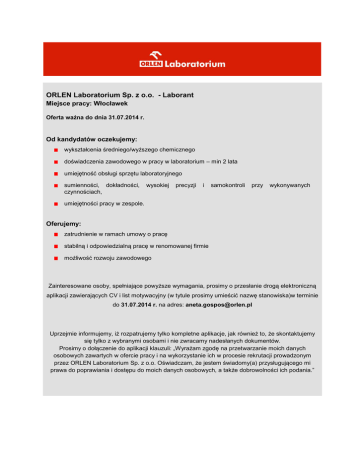 ORLEN Laboratorium Sp. z o.o. - Laborant Miejsce pracy: Włocławek Oferta ważna do dnia 31.07.2014 r. Od kandydatów oczekujemy: wykształcenia średniego/wyższego chemicznego doświadczenia zawodowego w pracy w laboratorium – min 2 lata umiejętność obsługi sprzętu laboratoryjnego sumienności, dokładności, czynnościach, wysokiej precyzji i samokontroli przy wykonywanych umiejętności pracy w zespole. Oferujemy: zatrudnienie w ramach umowy o pracę stabilną i odpowiedzialną pracę w renomowanej firmie możliwość rozwoju zawodowego Zainteresowane osoby, spełniające powyższe wymagania, prosimy o przesłanie drogą elektroniczną aplikacji zawierających CV i list motywacyjny (w tytule prosimy umieścić nazwę stanowiska)w terminie do 31.07.2014 r. na adres: [email protected] Uprzejmie informujemy, iż rozpatrujemy tylko kompletne aplikacje, jak również to, że skontaktujemy się tylko z wybranymi osobami i nie zwracamy nadesłanych dokumentów. Prosimy o dołączenie do aplikacji klauzuli: „Wyrażam zgodę na przetwarzanie moich danych osobowych zawartych w ofercie pracy i na wykorzystanie ich w procesie rekrutacji prowadzonym przez ORLEN Laboratorium Sp. z o.o. Oświadczam, że jestem świadomy(a) przysługującego mi prawa do poprawiania i dostępu do moich danych osobowych, a także dobrowolności ich podania.”