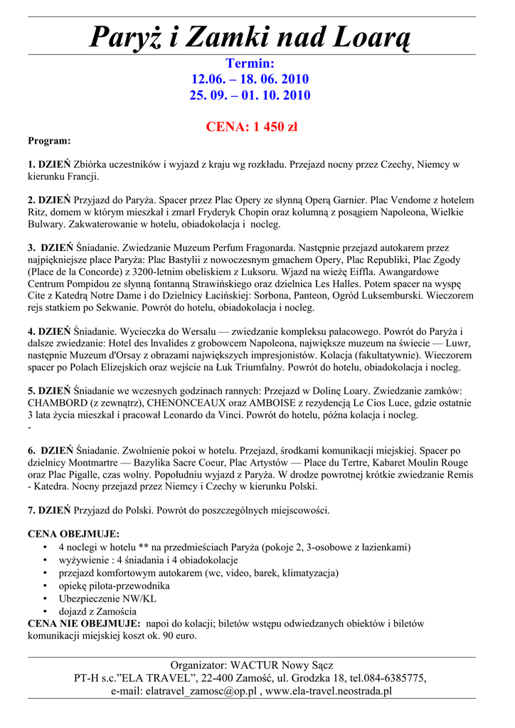 Paryż i Zamki nad Loarą Termin: 12.06. – 18. 06. 2010 25. 09. – 01. 10. 2010 CENA: 1 450 zł Program: 1. DZIEŃ Zbiórka uczestników i wyjazd z kraju wg rozkładu. Przejazd nocny przez Czechy, Niemcy w kierunku Francji. 2. DZIEŃ Przyjazd do Paryża. Spacer przez Plac Opery ze słynną Operą Garnier. Plac Vendome z hotelem Ritz, domem w którym mieszkał i zmarł Fryderyk Chopin oraz kolumną z posągiem Napoleona, Wielkie Bulwary. Zakwaterowanie w hotelu, obiadokolacja i nocleg. 3. DZIEŃ Śniadanie. Zwiedzanie Muzeum Perfum Fragonarda. Następnie przejazd autokarem przez najpiękniejsze place Paryża: Plac Bastylii z nowoczesnym gmachem Opery, Plac Republiki, Plac Zgody (Place de la Concorde) z 3200-letnim obeliskiem z Luksoru. Wjazd na wieżę Eiffla. Awangardowe Centrum Pompidou ze słynną fontanną Strawińskiego oraz dzielnica Les Halles. Potem spacer na wyspę Cite z Katedrą Notre Dame i do Dzielnicy Łacińskiej: Sorbona, Panteon, Ogród Luksemburski. Wieczorem rejs statkiem po Sekwanie. Powrót do hotelu, obiadokolacja i nocleg. 4. DZIEŃ Śniadanie. Wycieczka do Wersalu — zwiedzanie kompleksu pałacowego. Powrót do Paryża i dalsze zwiedzanie: Hotel des lnvalides z grobowcem Napoleona, największe muzeum na świecie — Luwr, następnie Muzeum d'Orsay z obrazami największych impresjonistów. Kolacja (fakultatywnie). Wieczorem spacer po Polach Elizejskich oraz wejście na Łuk Triumfalny. Powrót do hotelu, obiadokolacja i nocleg. 5. DZIEŃ Śniadanie we wczesnych godzinach rannych: Przejazd w Dolinę Loary. Zwiedzanie zamków: CHAMBORD (z zewnątrz), CHENONCEAUX oraz AMBOISE z rezydencją Le Cios Luce, gdzie ostatnie 3 lata życia mieszkał i pracował Leonardo da Vinci. Powrót do hotelu, późna kolacja i nocleg. 6. DZIEŃ Śniadanie. Zwolnienie pokoi w hotelu. Przejazd, środkami komunikacji miejskiej. Spacer po dzielnicy Montmartre — Bazylika Sacre Coeur, Plac Artystów — Place du Tertre, Kabaret Moulin Rouge oraz Plac Pigalle, czas wolny. Popołudniu wyjazd z Paryża. W drodze powrotnej krótkie zwiedzanie Remis - Katedra. Nocny przejazd przez Niemcy i Czechy w kierunku Polski. 7. DZIEŃ Przyjazd do Polski. Powrót do poszczególnych miejscowości. CENA OBEJMUJE: • 4 noclegi w hotelu ** na przedmieściach Paryża (pokoje 2, 3-osobowe z łazienkami) • wyżywienie : 4 śniadania i 4 obiadokolacje • przejazd komfortowym autokarem (wc, video, barek, klimatyzacja) • opiekę pilota-przewodnika • Ubezpieczenie NW/KL • dojazd z Zamościa CENA NIE OBEJMUJE: napoi do kolacji; biletów wstępu odwiedzanych obiektów i biletów komunikacji miejskiej koszt ok. 90 euro. Organizator: WACTUR Nowy Sącz PT-H s.c.”ELA TRAVEL”, 22-400 Zamość, ul. Grodzka 18, tel.084-6385775, e-mail: [email protected] , www.ela-travel.neostrada.pl
