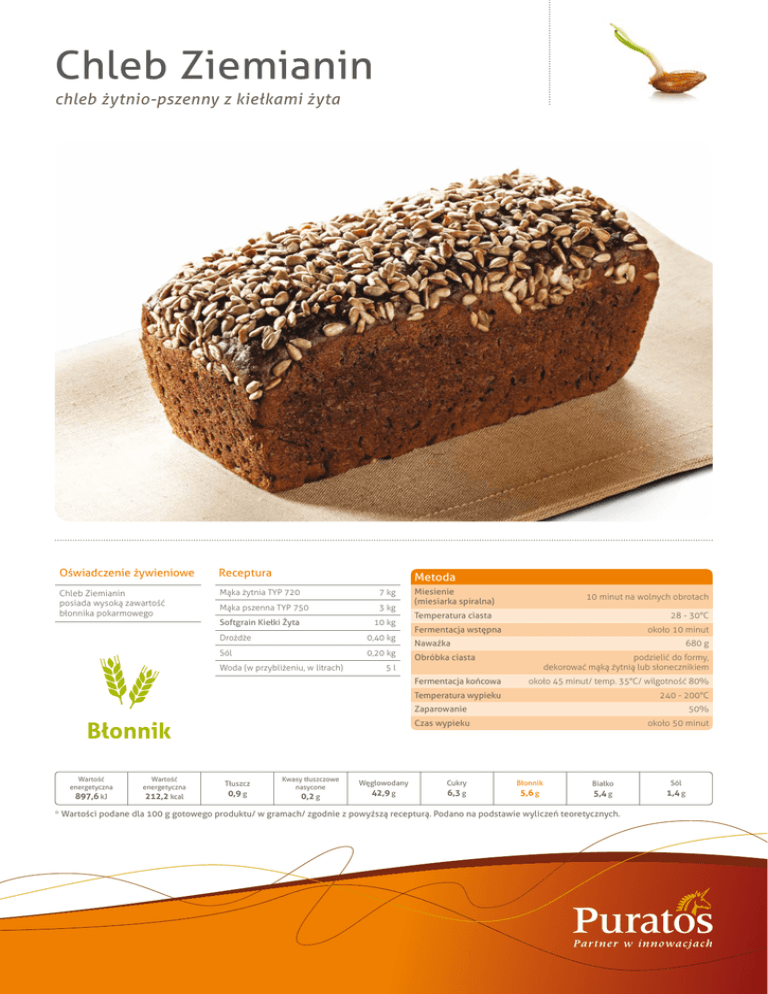 Chleb Ziemianin chleb żytnio-pszenny z kiełkami żyta Oświadczenie żywieniowe Receptura Chleb Ziemianin posiada wysoką zawartość błonnika pokarmowego Mąka żytnia TYP 720 7 kg Mąka pszenna TYP 750 3 kg Metoda Softgrain Kiełki Żyta 10 kg Drożdże 0,40 kg Sól 0,20 kg Woda (w przybliżeniu, w litrach) Miesienie (miesiarka spiralna) 10 minut na wolnych obrotach Temperatura ciasta 28 - 30°C Fermentacja wstępna około 10 minut Naważka 680 g Obróbka ciasta podzielić do formy, dekorować mąką żytnią lub słonecznikiem 5l Fermentacja końcowa około 45 minut/ temp. 35°C/ wilgotność 80% Temperatura wypieku 240 - 200°C Zaparowanie 50% Czas wypieku Wartość energetyczna Wartość energetyczna 897,6 kJ 212,2 kcal Tłuszcz 0,9 g Kwasy tłuszczowe nasycone 0,2 g Węglowodany 42,9 g Cukry 6,3 g około 50 minut Błonnik 5,6 g Białko 5,4 g * Wartości podane dla 100 g gotowego produktu/ w gramach/ zgodnie z powyższą recepturą. Podano na podstawie wyliczeń teoretycznych. Sól 1,4 g