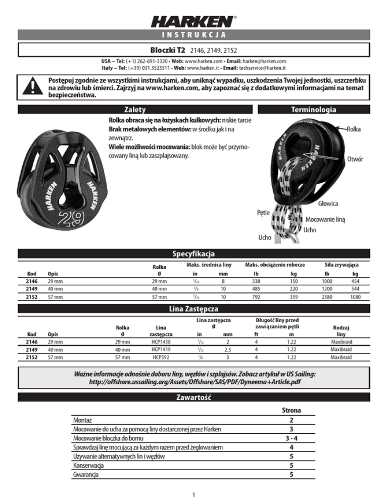 instrukcja Bloczki T2 2146, 2149, 2152 USA – Tel: (+1) 262-691-3320 • Web: www.harken.com • Email: [email protected] Italy – Tel: (+39) 031.3523511 • Web: www.harken.it • Email: [email protected] Postępuj zgodnie ze wszystkimi instrukcjami, aby uniknąć wypadku, uszkodzenia Twojej jednostki, uszczerbku na zdrowiu lub śmierci. Zajrzyj na www.harken.com, aby zapoznać się z dodatkowymi informacjami na temat bezpieczeństwa. Zalety Terminologia Rolka obraca się na łożyskach kulkowych: niskie tarcie Brak metalowych elementów: w środku jak i na zewnątrz. Wiele możliwości mocowania: blok może być przymocowany liną lub zaszplajsowany. Rolka Otwór Głowica Pętle Mocowanie liną Ucho Ucho Specyfikacja Kod 2146 2149 2152 Maks. średnica liny Rolka Ø 29 mm 40 mm 57 mm Opis 29 mm 40 mm 57 mm in 5/16 3 /8 7/16 mm 8 10 10 Maks. obciążenie robocze lb 330 485 792 kg 150 220 359 Siła zrywająca lb 1000 1200 2380 kg 454 544 1080 Lina Zastępcza Kod 2146 2149 2152 Opis 29 mm 40 mm 57 mm Rolka Ø 29 mm 40 mm 57 mm Lina zastępcza Ø in mm 1/16 2 3/32 2.5 1/8 3 Lina zastępcza HCP1438 HCP1419 HCP392 Długość liny przed zawiązaniem pętli ft m 4 1.22 4 1.22 4 1.22 Ważne informacje odnośnie doboru liny, węzłów i szplajsów. Zobacz artykuł w US Sailing: http://offshore.ussailing.org/Assets/Offshore/SAS/PDF/Dyneema+Article.pdf Zawartość Montaż Mocowanie do ucha za pomocą liny dostarczonej przez Harken Mocowanie bloczka do bomu Sprawdzaj linę mocującą za każdym razem przed żeglowaniem Używanie alternatywnych lin i węzłów Konserwacja Gwarancja 1 Strona 2 3 3-4 4 5 5 5 Rodzaj liny Maxibraid Maxibraid Maxibraid Montaż Mocuj tylko do obiektów o zaokrąglonych krawędziach. Unikaj ostrych krawędzi. POPRAWNIE NIEPOPRAWNIE OSTRZEŻENIE! Mocuj wyłącznie do obiektów o zaokrąglonych krawędziach. Nie mocuj bloczka do przelotek tłoczonych. Może to doprowadzić do przecierania się liny i niespodziewanego jej zerwania, powodując uszkodzenie jachtu, uszczerbek na zdrowiu lub śmierć. Zajrzyj na www.harken.com po Ostre Zaokrąglone dodatkowe informacje o bezpieczeństwie. Zawsze prowadź linę do otworu w bloku. Głowica nie jest wystarczająco wytrzymała by bezpiecznie wiązać linę. OSTRZEŻENIE! Prowadź linę do otworu w bloczka zgodnie z instrukcją. Nie wiąż mocowania do głowicy bloczka Może to doprowadzić do przecierania się liny i nieoczekiwanego jej zerwania, a to może spowodować uszkodzenie jachtu, uszczerbek na zdrowiu lub śmierć. POPRAWNIE NIEPOPRAWNIE NIEPOPRAWNIE NIEPOPRAWNIE Otwór Głowica Głowica 2 pętle Ważne: Zrób trzy pętle (sześć odcinków), używając dostarczonej liny. Nie mocuj liny do głowicy bloku. Nie mocuj liny do głowicy bloku. Ten bloczek ma jedynie dwie pętle (cztery odcinki). Trzy pętle (sześć odcinków), jest wymagane do uzyskania odpowiedniej wytrzymałości. OSTRZEŻENIE! Rób trzy pętle korzystając z dostarczonej liny. Zrobienie mniejszej liczby pętli osłabia blok, może doprowadzić do nieoczekiwanej awarii, uszkodzenia jachtu, uszczerbku na zdrowiu lub śmierci. Mocowanie przez otwór nie może być regulowane. Ważne: Węglowa powłoka będzie się wycierać lub niszczyć linę gdy zostanie użyta do regulacji 2:1 pracującej pod obciążeniem. Blok T2 z zaczepem. Upewnij się, że zaszplajsowane ucho jest wystarczająco długie by zapobiec zaciskaniu i zakleszczaniu rolki. Zrób zaczep dłuższy niż średnica rolki. NIEPOPRAWNIE Upewnij się, że “X” jest dłuższe niż “Y”. 2 X Y Mocowanie do ucha za pomocą liny dostarczonej przez Harken Zrób trzy pętle, tak by powstało sześć odcinków liny mocującej. Zawiąż węzeł płaski tak, aby zostało dość liny do zawiązania jej zabezpieczenia. Na obu końcach zawiąż supełki zostawiając krótkie końcówki. Utnij końce liny korzystając z elektrycznego palnika. Inne rozwiązanie to zaklejenie końców liny mocującej taśmą izolacyjną, wtedy końcówki liny utnij ostrym nożem lub nożyczkami. Węzeł Płaski Supeł Zabezpieczający Supeł Zabezpieczający Wskazówka: jeżeli nie masz palnika elektrycznego, rozgrzej nóż za pomocą palnika gazowego. POPRAWNIE POPRAWNIE NIEPOPRAWNIE POPRAWNIE jący cza zpie abe eł Z Sup Nie używaj płomienia bezpośrednio pod blokiem Użyj palnika elektrycznego lub rozgrzej nóż, aby łatwiej przeciąć końce liny. Uważaj, aby sie nie poparzyć. Stop końcówki liny lub zaklej węzły klejem, aby je odpowiednio zabezpieczyć. Aby zamontować blok bliżej bomu lub pokładu, skróć mocowanie, tak aby węzeł liny mocującej znalazł się w otworze bloka. Upewnij się, że końcówki liny mocującej zabezpieczone są przez ich stopienie lub zaklejenie klejem. Mocowanie do bomu Podczas mocowania bloku do dużego obiektu takiego jak bom, upewnij się, że lina mocująca poprowadzona jest naprzemiennie, tak aby zapobiec wypychaniu głowicy bloku w jedną ze stron. Zobacz następną stronę. NIEPOPRAWNIE POPRAWNIE 3 Mocowanie do bomu (ciąg dalszy) Pod Pod Pod Na d Nad Nad Jeżeli masz łatwy dostęp do noku bomu, obróć każdą z pętli. Upewnij się, że pętle zewnętrzne obrócone są w odwrotną stronę niż pętla centralna. Pamiętaj o użyciu węzła płaskiego i supłów zabezpieczających. Patrz “Mocowanie do ucha przy użyciu liny dostarczonej przez Harken" na stronie 3. Sprawdzaj linę mocującą przed każdym żeglowaniem Sprawdź linę mocującą bloku pod kątem przetarć lub uszkodzeń spowodowanych promieniami UV przed każdym żeglowaniem. Natychmiast wymień uszkodzoną linę. Wymieniaj linę mocującą co 2 lata, nawet gdy nie nosi znamion uszkodzenia. Użyj liny zastępczej Harken. Gdy używasz własnej liny, patrz “Stosowanie alternatywnych lin i węzłów” a także sprawdź w tabeli na ostatniej stronie informacje ułatwiające dobranie prawidłowej liny mocującej. OSTRZEŻENIE! Nieprzeprowadzenie inspekcji sprzętu oraz niewymienienie zniszczonej przez promienie