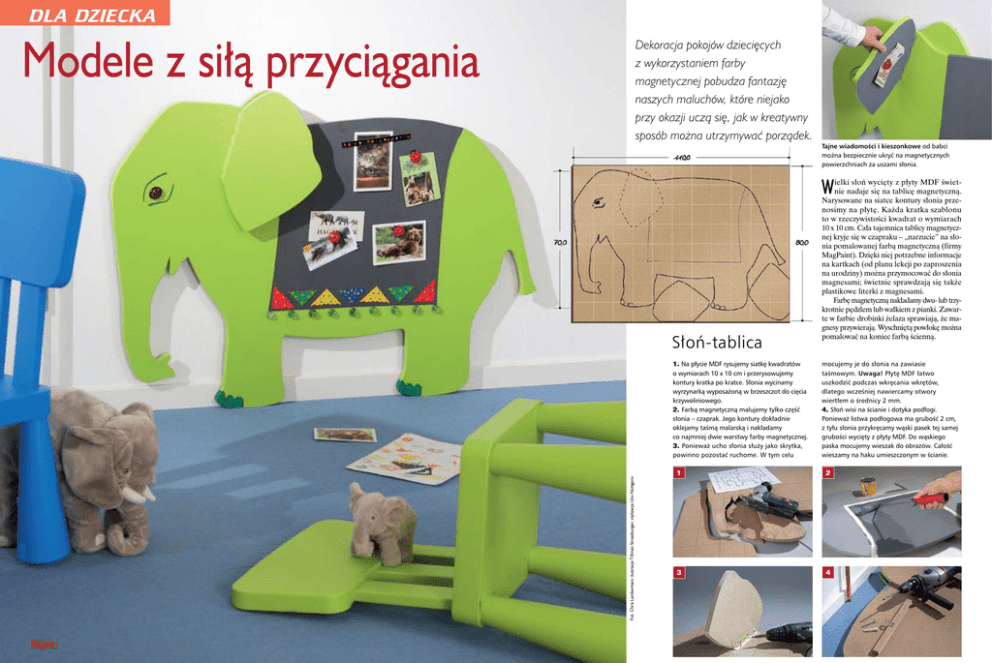 DLA DZIECKA Modele z siłą przyciągania Dekoracja pokojów dziecięcych z wykorzystaniem farby magnetycznej pobudza fantazję naszych maluchów, które niejako przy okazji uczą się, jak w kreatywny sposób można utrzymywać porządek. Tajne wiadomości i kieszonkowe od babci można bezpiecznie ukryć na magnetycznych powierzchniach za uszami słonia. W Słoń-tablica Fot. Chris Lambertsen; ilustracje Tillman Straszburger; stylizacja Ursi Nüttgens 1. Na płycie MDF rysujemy siatkę kwadratów o wymiarach 10 x 10 cm i przerysowujemy kontury kratka po kratce. Słonia wycinamy wyrzynarką wyposażoną w brzeszczot do cięcia krzywoliniowego. 2. Farbą magnetyczną malujemy tylko część słonia – czaprak. Jego kontury dokładnie oklejamy taśmą malarską i nakładamy co najmniej dwie warstwy farby magnetycznej. 3. Ponieważ ucho słonia służy jako skrytka, powinno pozostać ruchome. W tym celu ielki słoń wycięty z płyty MDF świetnie nadaje się na tablicę magnetyczną. Narysowane na siatce kontury słonia przenosimy na płytę. Każda kratka szablonu to w rzeczywistości kwadrat o wymiarach 10 x 10 cm. Cała tajemnica tablicy magnetycznej kryje się w czapraku – „narzucie” na słonia pomalowanej farbą magnetyczną (firmy MagPaint). Dzięki niej potrzebne informacje na kartkach (od planu lekcji po zaproszenia na urodziny) można przymocować do słonia magnesami; świetnie sprawdzają się także plastikowe literki z magnesami. Farbę magnetyczną nakładamy dwu- lub trzykrotnie pędzlem lub wałkiem z pianki. Zawarte w farbie drobinki żelaza sprawiają, że magnesy przywierają. Wyschniętą powłokę można pomalować na koniec farbą ścienną. mocujemy je do słonia na zawiasie taśmowym. Uwaga! Płytę MDF łatwo uszkodzić podczas wkręcania wkrętów, dlatego wcześniej nawiercamy otwory wiertłem o średnicy 2 mm. 4. Słoń wisi na ścianie i dotyka podłogi. Ponieważ listwa podłogowa ma grubość 2 cm, z tyłu słonia przykręcamy wąski pasek tej samej grubości wycięty z płyty MDF. Do wąskiego paska mocujemy wieszak do obrazów. Całość wieszamy na haku umieszczonym w ścianie. 1 2 3 4 DLA DZIECKA Latająca bordiura Z azwyczaj w pokoju dziecięcym przykleja się kolorowe bordiury, np. we wzory ze zwierzętami lub ludzikami. Na pewno bardziej oryginalne będą pasy udekorowane samodzielnie i wykorzystane np. jako ciągnięta przez samolot tablica do umieszczenia kolekcji zdjęć lub baner reklamowy. Bordiury wykonaliśmy z kawałków tapety fizelinowej (Trendvlies firmy Erfurt), pomalowanych wcześniej farbą magnetyczną. Farbę nanosimy dwukrotnie równomierną warstwą, najlepiej za pomocą niewielkiego wałka z pianki (farba jest wodorozcieńczalna, dlatego łatwo go potem umyć wodą). Po wyschnięciu farby przyklejamy tapetę fizelinową specjalnym klejem lub klejem do bordiur. 1. Do wycięcia z płyty MDF niewielkiego samolotu najlepiej użyć wyrzynarki z brzeszczotem do cięć krzywoliniowych. Można nim precyzyjnie wycinać nawet najmniejsze wzory lub wąskie zakręty i to bez konieczności przerywania pracy. Krawędzie samolotu zaokrąglamy papierem ściernym 120. 2. Na ciągnięty przez samolot łopoczący baner najlepiej nadaje się tapeta fizelinowa, która się nie odkształca, ale łatwo ją przykleić. Powierzchnię tapety, z której wytniemy kolejne fragmenty banera, malujemy farbą magnetyczną dwu-, a nawet trzykrotnie, dobrze susząc każdą z warstw. 1 2 4 3 3. Kształt banera może być dowolny – nie musimy się trzymać jednej linii. Na tapecie pomalowanej farbą magnetyczną rysujemy ołówkiem jego kontury i wycinamy nożyczkami. 4. Przygotowane fragmenty banera malujemy cienką warstwą dowolnej farby ściennej w wybranym kolorze i przyklejamy do ścian klejem do tapet. Farba magnetyczna jest dostępna także w wersji dającej efekt lśnienia i jarzenia. Każda kratka siatki z samolotem ma w rzeczywistości wymiary 5 x 5 cm. Przedstawiony obok szablon można łatwo powiększyć na kopiarce do wielkości arkusza A3. *%$9.9-!*34%2 +4°2%-5-/.!:!5&!£ Wielostronny słup ogłoszeniowy P rezentowany słup ogłoszeniowy wykonany z płyty MDF to nie tylko tablica magnetyczna, lecz także niewielka garderoba dla dzieci. Ostateczna warstwa – ścienna farba w kolorze jasnoniebieskim – źle kryje ciemną farbę magnetyczną i trzeba ją nałożyć dwukrotnie. By magnetyczna farba dobrze przyciągała magnesy poprzez powłokę farby ściennej, płytę MDF trzeba pomalować farbą magnetyczną aż trzy razy. Dzięki temu nawet lustro z przyklejonymi od spodu magnesami bezpiecznie wisi na swoim miejscu. .!2:§$:)! )!+#%3/2)! JAKIENARZÇDZIABÇDDLANASNAJLEPSZE KRYTERIAWYBORUELEKTRONARZÇDZI JAKUYWAÃNARZÇDZI 52:$:!.)% )$%+/2/7!.)% JAKEFEKTOWNIEURZDZIÃWNÇTRZE DOBÐRMATERIAÐWOKUÃINARZÇDZI JAKKROKPOKROKUZBUDOWAÃMEBLE 2%-/.4 )-/$%2.):!#*! JAKZAPLANOWAÃREMONT JAKWYKONAÃPRACEWYKOÎCZENIOWE MATERIAYIPREPARATYREMONTOWE $/-)/4/#:%.)% 1 2 1. Z płyty MDF wycinamy słup – prostokątną ściankę z trójkątnym daszkiem. Z tyłu w trójkątnym fragmencie ścianki wiercimy nieprzelotowy otwór i wklejamy w niego drewniany drążek na ubrania średnicy 2,5 cm i przykręcamy od przodu. Uwaga! Wcześniej w otworze w ściance i w pręcie nawiercamy otwory na wkręt. Drugi koniec drążka wklejamy w listwę przykręconą pionowo do ściany. 2. Z płyty MDF wycinamy nakładkę – trójkąt o takim samych wymiarach jak trójkątny daszek ścianki – i przyklejamy ją z przodu ścianki i unieruchamiamy ściskami aż do wyschnięcia kleju. Prostokątny fragment ścianki malujemy farbą magnetyczną. Na dole od tyłu przykręcamy cokół również przycięty z płyty MDF. JAKZBUDOWAÃALTANKÇIOGRODOWEyCIEKI JAKWYBRAÃNAJLEPSZKOSIARKÇ JAKURZDZIÃPLACYKZABAWDLADZIECI Na rysunku konstrukcyjnym pokazujemy poszczególne elementy słupa ogłoszeniowego. Oczywiście rozmiary można dostosować do indywidualnych potrzeb. ARCHIWUMINFORMACJE NAJCIEKAW