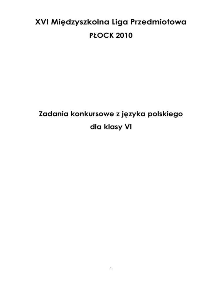 XVI Międzyszkolna Liga Przedmiotowa PŁOCK 2010 Zadania konkursowe z języka polskiego dla klasy VI 1 KOD UCZNIA Witamy Cię na XVI Międzyszkolnej Lidze Przedmiotowej. Przed Tobą zadania konkursowe z języka polskiego dla klasy VI. Instrukcja 1. Przeczytaj uważnie teksty i polecenia. 2. W zadaniach, w których są podane cztery odpowiedzi: A, B, C, D, wybierz tylko jedną i zaznacz znakiem X. 3. Jeżeli się pomylisz, błędną odpowiedź otocz kółkiem i zaznacz inną. 4. Rozwiązania zadań, w których należy samodzielnie sformułować odpowiedź, zapisz czytelnie w wyznaczonych miejscach. Na wykonanie zadań masz 90 minut. Życzymy powodzenia! 2 Wierszem i prozą Tekst I Gościu, siądź pod mym liściem, a odpoczni sobie! Nie dojdzie cię tu słońce, przyrzekam ja tobie, Choć się nawysszej wzbije, a proste promienie Ściągną pod swoje drzewa rozstrzelane cienie. Tu zawżdy1 chłodne wiatry z pola zawiewają, Tu słowicy, tu szpacy wdzięcznie narzekają2. Z mego wonnego kwiatu pracowite pszczoły Biorą miód, który potem szlachci3 pańskie stoły. A ja swym cichym szeptem sprawić umiem snadnie4, Że człowiekowi łacno5 słodki sen przypadnie. Jabłek wprawdzie nie rodzę, lecz mię pan tak kładzie6 Jako szczep napłodniejszy w hesperyskim sadzie7. Jan Kochanowski, Na lipę, [w:] Fraszki, pieśni, treny, Zielona Sowa 2008. 1 zawżdy – zawsze narzekają – śpiewają 3 szlachci – udoskonala 4 snadnie – bez trudu 5 łacno – szybko 6 kładzie – uznaje 7 hesperyjski sad – w mitologii greckiej: sad, w którym rosły złote jabłka; ich strażniczkami były Hesperydy. 2 Zadanie 1. (0-2) Kto mówi w utworze J. Kochanowskiego? Do kogo się zwraca? Zadanie 2. (0-1) Wymień trzy zalety lipy z utworu. Zadanie 3. (0-1) Wypisz z tekstu trzy przykłady epitetów. Zadanie 4. (0-1) J. Kochanowski posłużył się uosobieniem. Wyjaśnij, na czym polega ten środek poetycki w utworze. 3 Zadanie 5. (0-3) Odpowiedz na pytania. a) Jaki gatunek literacki prezentuje utwór Na lipę? b) Jakie dwie cechy tego gatunku możesz wymienić? c) Jaki to rodzaj literacki? Zadanie 6. (0-2) Do wyrazu pszczoła utwórz rodzinę wyrazów. Tekst II Jak to jest być człowiekiem spytał ptak sama nie wiem być więźniem w swojej skórze a sięgać w nieskończoność być jeńcem drobiny czasu a dotykać wieczności być beznadziejnie niepewnym i szaleńcem nadziei być igłą szronu i garścią upału wdychać powietrze dusić się bez słowa płonąć i gniazdo mieć z popiołu jeść chleb lecz głodem się nasycać umierać bez miłości a kochać przez śmierć To śmieszne odrzekł ptak Wzlatując w przestrzeń lekko Anna Kamieńska, Śmieszne Zadanie 7. (0-1) Wymień dwie charakterystyczne cechy wiersza Śmieszne. 4 Zadanie 8. (0-1) Wiersz ma charakter filozoficzny, bo A. stawia pytanie o istotę bytu człowieka. B. interesuje się uczuciami ludzi. C. rozważa problem stosunku ludzi do przyrody. D. opisuje zajęcia i przeżycia człowieka. Zadanie 9. (0-1) Podmiot mówiący zaczyna odpowiedź od stwierdzenia sama nie wiem. Oznacza to, A. że nie posiada wystarczającej wiedzy. B. że nie jest w stanie udzielić jednoznacznej odpowiedzi. C. że odpowie na pytanie później. D. że udzielić odpowiedzi może ktoś mądrzejszy od niej. Zadanie 10. (0-2) Połącz liniami podane fragmenty wiersza z ich interpretacją. być więźniem w swojej skórze a sięgać w nieskończoność Człowiek bez miłości umiera, ale równocześnie w imię miłości potrafi poświęcić życie. być jeńcem drobiny czasu a dotykać wieczności Człowiek ma dwoistą naturę: cielesną i duchową. być beznadziejnie niepewnym i szaleńcem nadziei Życie jest chwilą w porównaniu do wieczności, ale ludzie dążą do nieśmiertelności. być igłą szronu i garścią upału Ludzie nie mogą być pewni swego losu, jednak zawsze mają nadzieję na dobre życie. umierać bez miłości a kochać przez śmierć Człowiek z jednej strony może ranić drugiego, lecz jednocześnie może być pełen miłości. Zadanie 11. (0-1) Dokończ zdanie Podmiot liryczny w powyższych dwuwierszach opisuje człowieka. Jego cechy zestawia na zasadzie ________________ . Zadanie 12. (0-1) W opisie człowieka poetka użyła przede wszystkim A. porównań. B. uosobień. C. onomatopei. 5 D. metafor. Zadanie 13. (0-2) Do podanych wyrazów dopisz antonimy. życie - ____________________________. miłość - ___________________________. nadzieja - _________________________ . upał - ____________________________. głód - ___________________________ . Tekst III Następnego dnia Ula, przyszedłszy z rana od Pestki, znalazła na stole zaadresowaną do niej i zaklejoną kopertę. Znała już ten charakter pisma; pewnego wieczoru, który wydał jej się teraz niezmiernie dawny, były nim napisane słowa: „Wyjdź, czekam”. Zabrała list i pobiegła w pole, chciała być teraz sama. Przysiadłszy na pustej miedzy, otworzyła kopertę. Była w niej kartka (…). Czytała: „Powiedziałem ci kiedyś, że nie mogę przed Tobą wyjawić, jak ze mną było, bobyś tego nie zrozumiała. Ale teraz myślę, że moja miłość do Ciebie…” Ula zatrzymała się, serce zaczęło jej bić mocno i prędko, jak ze strachu. Ale to nie był strach, tylko szczęście. Wpatrywała się w litery, które złożyły się na śliczne słowa, nie mogąc oderwać od nich oczu: „ moja miłość do Ciebie … moja miłość do Ciebie…” Dopiero po dłuższej chwili zaczęła czytać dalej… „to powinna być taka moja szczerość. I dlatego dzisiaj, kiedy wiem, że niedługo wyjadę, postanowiłem Ci napisać prawdę, choćbyś nawet nie wszystko mogła zrozumieć. Uciekłem z domu, bo w domu miałem taką poniewierkę, że to trudno wyrazić. Dla mojego ojca tylko jedno ma znaczenie: wódka. Syn mu niepotrzebny, bo syn kosztuje pieniądze. Dawniej, za życia mamy, także pił, ale mama mnie pilnowała, żeby się nade mną nie znęcał…” … Znęcał si