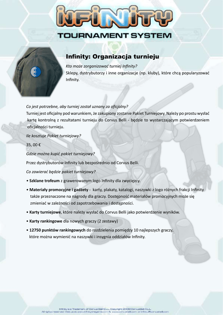 Infinity: Organizacja turnieju Kto może zorganizować turniej Infinity? Sklepy, dystrybutorzy i inne organizacje (np. kluby), które chcą popularyzować Infinity. Co jest potrzebne, aby turniej został uznany za oficjalny? Turniej jest oficjalny pod warunkiem, że zakupiony zostanie Pakiet Turniejowy. Należy po prostu wysłać kartę kontrolną z rezultatami turnieju do Corvus Belli - będzie to wystarczającym potwierdzeniem oficjalności turnieju. Ile kosztuje Pakiet turniejowy? 35, 00 € Gdzie można kupić pakiet turniejowy? Przez dystrybutorów Infinity lub bezpośrednio od Corvus Belli. Co zawierać będzie pakiet turniejowy? • Szklane trofeum z grawerowanym logo Infinity dla zwycięzcy. • Materiały promocyjne i gadżety - karty, plakaty, katalogi, naszywki z logo różnych frakcji Infinity także przeznaczone na nagrody dla graczy. Dostępność materiałów promocyjnych może się zmieniać w zależności od zapotrzebowania i dostępności. • Karty turniejowe, które należy wysłać do Corvus Belli jako potwierdzenie wyników. • Karty rankingowe dla nowych graczy (2 zestawy) • 12750 punktów rankingowych do rozdzielenia pomiędzy 10 najlepszych graczy, które można wymienić na naszywki i insygnia oddziałów Infinity. Infinity: Organizacja mini-turnieju Mini-turnieje to propozycja dla tych graczy, którzy nie mogą wziąć udziału w oficjalnym turnieju w swojej okolicy, a chcieliby grać w domu i nadal korzystać z pewnych zalet sankcjonowanej gry. Kto może zorganizować mini-turniej? Każda osoba pragnąca zmierzyć się z innymi w oficjalnej sankcjonowanej grze. Co jest potrzebne aby tak zorganizowany mini-turniej był uznawany za oficjalny? Turniej jest uważany za oficjalny jeśli zakupiony został mini-pakiet turniejowy. Potwierdzenie wyników gry jest dokonywane przez wysłanie karty turniejowej wraz z wynikami do Corvus Belli. Ile kosztuje mini-pakiet turniejowy? 10, 00 € Gdzie można kupić mini-pakiet turniejowy? Jedynie na www.corvusbelli.com Co zawiera mini-pakiet turniejowy? Mini pakiet przyznaje ci miejsce w rankingu i prawo do zdobywania punktów rankingowych i wymieniania ich za insygnia odpowiednich jednostek. Nic nie jest wysyłane pocztą, Mini-pakiet turniejowy jest całkowicie elektroniczny i zawiera: • Kartę turniejową, która musi zostać wysłana do Corvus Belli wraz z rezultatami turnieju, otrzymasz ją przez e-mail. • Kartę rejestracyjną dla nowych graczy, otrzymasz ją przez e-mail. • 2000 punktów, które należy rozdzielić między 2 graczy którzy zajmą najwyższe miejsca. Punkty można wymienić na insygnia jednostek Infinity i są liczone w międzynarodowym rankingu graczy. Infinity: Zasady, ograniczenia, rola organizatora i graczy w organizacji turnieju. Które reguły i armie mogą zostać użyte w oficjalnym turnieju Infinity? Oficjalne zasady gry i listy armii to te opublikowane przez Corvus Belli na stronie internetowej www.infinitythegame.com w sekcji DOWNLOADS/PLIKI pod zakładką zasady. Wszystkie zasady i listy armii opublikowane wcześniej niż tydzień przed terminem turnieju są uznawane za obowiązujące. Jakie ograniczenia obowiązują podczas oficjalnego turnieju? Musisz posiadać pakiet lub mini-pakiet turniejowy. Wszystkie modele użyte podczas turnieju muszą być figurkami Infinity produkcji Corvus Belli. Wszystkie modele muszą wiernie reprezentować swój oddział łącznie z bronią i wyposażeniem. Jeśli dana miniaturka nie została jeszcze wydana, może być zastąpiona innym modelem z serii Infinity. Należy poinformować przeciwnika o tym, jaką figurkę reprezentuje ten zastępczy model. Używanie konwertowanych modeli jest dopuszczalne o ile wszystkie lub większość komponentów modelu to produkty Corvus Belli. Używanie innych modeli wiernie oddających wygląd modeli Infinity (np. własnoręcznie stworzonych przez fanów) jest dopuszczalne, ale jedynie jeśli nie stanowią one produktu innej firmy. Modele muszą być sklejone (przynajmniej ich główne części, nie ma obowiązku dołączania wszystkich drobnych szczegółów wyposażenia czy antenek). Modele muszą być umieszczone na oryginalnych podstawkach dołączonych do zestawu, gdyż inne podstawki mogłyby mieć wpływ na rozstrzyganie pewnych sytuacji w czasie walki jak walka wręcz. Dla Haqqislamskiej Gwardii Maghariba, która dostarczana jest bez podstawki, zalecamy okrągłą podstawkę o średnicy ok. 4cali (8 cm). Używanie najemników i kompanii najemniczych nie jest dozwolone jako że ranking został pomyślany tak, by brać pod uwagę sposób w jaki dowódcy poszczególnych armii wykorzystują ich przewagi i jak radzą sobie ze słabymi stronami. Jaka jest rola Organizatora? Musi on wypisać i rozdać zasady turniejowe, które będą obowiązywać na turnieju wymieniając takie szczegóły jak ilość punktów na którą będą odbywały się bitwy w turnieju jak również tło konfliktu jakie pragnie stworzyć. Musi zapewnić legalność list armijnych i ułatwić graczom sprawdzenie czy spełniają one wszystkie dodatkowe wymogi i są zgodnie z zasadami turniejowymi. W tym celu dostarczamy program ARO, który pomoże oszczędzić czas i sprawi, że sprawdzenie list będzie łatwiejsze dla obsługi turnieju. Program ten można bezpłatnie pobrać ze strony www.infinitythegame.com Do jego obowiązków należy nadzorowanie przebiegu rozgrywki, aby był on zgodny z zasadami i ograniczeniami Systemu Turniejowego. Jego obowiązkiem jest sędziowanie w turnieju lub wyznaczenie innego sędziego i zapewnienie mu wszelkiego konicznego wsparcia. Musi być uczciwy w przekazywaniu wyników turnieju i pilnować, by stanowiły one wierne odzwierciedlenie przebiegu rozgrywki i dokonań graczy. Jego obowiązkiem jest rejestracja nowych graczy. Do jego obowiązków należy również wypełnianie kart turniejowych i wysłanie rezultatów turnieju do Corvus Belli. Jaka jest rola graczy? Muszą oni podporządkować się zasadom wyznacz