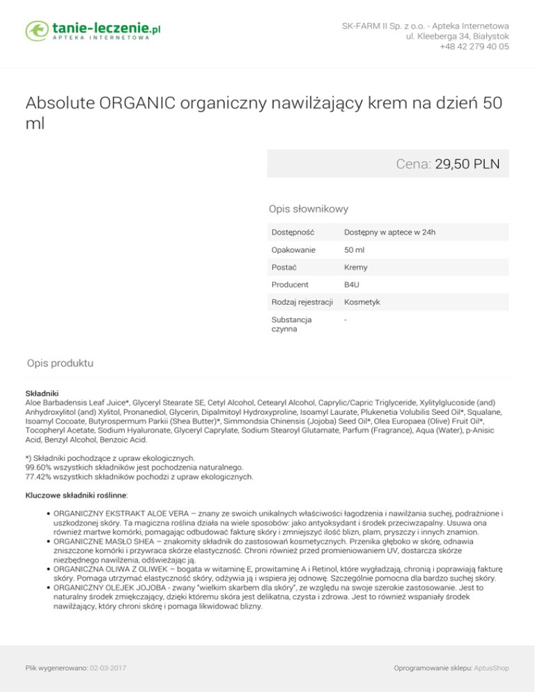 Absolute ORGANIC organiczny nawilżający krem - Tanie