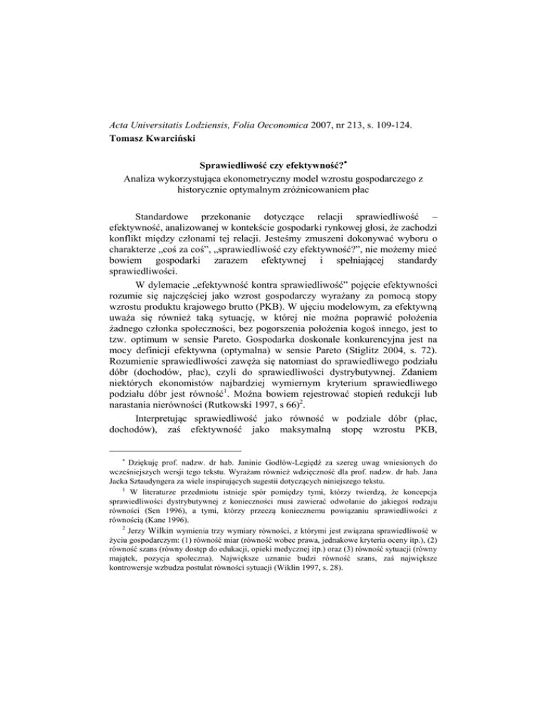 Acta Universitatis Lodziensis, Folia Oeconomica 2007, nr 213, s. 109-124. Tomasz Kwarciński Sprawiedliwość czy efektywność? Analiza wykorzystująca ekonometryczny model wzrostu gospodarczego z historycznie optymalnym zróżnicowaniem płac Standardowe przekonanie dotyczące relacji sprawiedliwość – efektywność, analizowanej w kontekście gospodarki rynkowej głosi, że zachodzi konflikt między członami tej relacji. Jesteśmy zmuszeni dokonywać wyboru o charakterze „coś za coś”, „sprawiedliwość czy efektywność?”, nie możemy mieć bowiem gospodarki zarazem efektywnej i spełniającej standardy sprawiedliwości. W dylemacie „efektywność kontra sprawiedliwość” pojęcie efektywności rozumie się najczęściej jako wzrost gospodarczy wyrażany za pomocą stopy wzrostu produktu krajowego brutto (PKB). W ujęciu modelowym, za efektywną uważa się również taką sytuację, w której nie można poprawić położenia żadnego członka społeczności, bez pogorszenia położenia kogoś innego, jest to tzw. optimum w sensie Pareto. Gospodarka doskonale konkurencyjna jest na mocy definicji efektywna (optymalna) w sensie Pareto (Stiglitz 2004, s. 72). Rozumienie sprawiedliwości zawęża się natomiast do sprawiedliwego podziału dóbr (dochodów, płac), czyli do sprawiedliwości dystrybutywnej. Zdaniem niektórych ekonomistów najbardziej wymiernym kryterium sprawiedliwego podziału dóbr jest równość1. Można bowiem rejestrować stopień redukcji lub narastania nierówności (Rutkowski 1997, s 66)2. Interpretując sprawiedliwość jako równość w podziale dóbr (płac, dochodów), zaś efektywność jako maksymalną stopę wzrostu PKB, Dziękuję prof. nadzw. dr hab. Janinie Godłów-Legiędź za szereg uwag wniesionych do wcześniejszych wersji tego tekstu. Wyrażam również wdzięczność dla prof. nadzw. dr hab. Jana Jacka Sztaudyngera za wiele inspirujących sugestii dotyczących niniejszego tekstu. 1 W literaturze przedmiotu istnieje spór pomiędzy tymi, którzy twierdzą, że koncepcja sprawiedliwości dystrybutywnej z konieczności musi zawierać odwołanie do jakiegoś rodzaju równości (Sen 1996), a tymi, którzy przeczą koniecznemu powiązaniu sprawiedliwości z równością (Kane 1996). 2 Jerzy Wilkin wymienia trzy wymiary równości, z którymi jest związana sprawiedliwość w życiu gospodarczym: (1) równość miar (równość wobec prawa, jednakowe kryteria oceny itp.), (2) równość szans (równy dostęp do edukacji, opieki medycznej itp.) oraz (3) równość sytuacji (równy majątek, pozycja społeczna). Największe uznanie budzi równość szans, zaś największe kontrowersje wzbudza postulat równości sytuacji (Wiklin 1997, s. 28). standardowe przekonanie dotyczące relacji sprawiedliwość – efektywność głosi, że lepszą efektywność gospodarki można uzyskać za cenę większej niesprawiedliwości w podziale dóbr (większych nierówności), lub odwrotnie bardziej sprawiedliwy podział dóbr zostanie uzyskany kosztem efektywności gospodarczej. Wedle opinii Artura Okuna, społeczeństwo jest zobligowane do szukania kompromisu (tradeoff) pomiędzy efektywnością a równością3. Jako interesującą próbę połączenia wymogów efektywności z postulatami sprawiedliwości można interpretować model wzrostu gospodarczego z historycznie optymalnym zróżnicowaniem płac, zbudowany przez Pawła Kumora oraz Jana Jacka Sztaudyngera (Kumor, Sztaudynger 2006; Sztaudynger 2005, s. 68–72). W modelu tym jedną ze zmiennych objaśniających wzrost gospodarczy (PKB) jest zróżnicowanie płac. Autorzy stawiają hipotezę, że można znaleźć taki poziom nierówności płacowych, przy którym stopa wzrostu PKB będzie najwyższa (Kumor, Sztaudynger 2006, s. 1). Taki poziom nierówności nazywają optymalnym zróżnicowaniem płac. Czy jednak poziom optymalnego zróżnicowania płac można utożsamić ze sprawiedliwym podziałem płac? Czy, a jeśli tak to w jakim sensie, sprawiedliwy podział płac może być wyznaczany przez efektywność gospodarki. Czy zatem, efektywność wyznacza standardy sprawiedliwości?4 Ten problem musimy z kolei odróżnić od powiązanych z nim zagadnień, do których należy odpowiedź na pytania: czy postulat efektywności ma prymat nad wymogami sprawiedliwości oraz czy możliwy jest kompromis między sprawiedliwością a efektywnością. Postawione problemy mają charakter normatywny, ich rozstrzygnięcie w dużym stopniu zależy od akceptacji określonych sądów wartościujących. Sprawiedliwość i efektywność będą zatem analizowane jako rodzaje wartości, zarówno ekonomicznych, wyrażanych za pomocą preferencji, zaleceń itp. służących prowadzeniu polityki gospodarczej, jak i moralnych, wyrażanych za pomocą norm określających moralnie słuszne sposoby postępowania. Stąd też, prowadzone analizy będą dotyczyć zarówno ekonomii dobrobytu (sprawiedliwość i efektywność jako wartości ekonomiczne)5, jaki i etyki 3 Zdaniem Okuna, można osiągnąć postęp w szukaniu kompromisu między sprawiedliwością a równością, jednakże konflikt między nimi pozostaje nieusuwalny. Z tego też względu połączenie kapitalizmu (dążenia do efektywności gospodarczej) i demokracji (domeny równości) jest nieprawdopodobną mieszanką. Być może – twierdzi Okun – kapitalizm i demokracja potrzebują siebie nawzajem, by dodać nieco racjonalności do wymogów równości i nieco człowieczeństwa do postulatów efektywności (Okun 1975, s. 88, 120). 4 Pytanie to postawił Jan Jacek Sztaudynger podczas dyskusji nad referatem Optymalna nierównomierność płac w Polsce – analiza ekonometryczna, która odbyła się podczas X Ogólnopolskiej Konferencji „Etyka w życiu gospodarczym”, Łódź, 11–12 maja 2006. 5 Istnieje dyskusja na temat tego, czy ekonomia dobrobytu może być wolna od wartości. Dyskusja ta wpisuje się w szerszą debatę dotyczącą tego, czy nauka, również