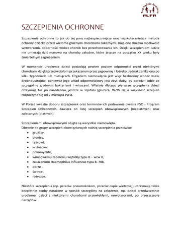 SZCZEPIENIA OCHRONNE Szczepienia ochronne to jak do tej pory najbezpieczniejsza oraz najskuteczniejsza metoda ochrony dziecka przed wieloma groźnymi chorobami zakaźnymi. Dają one dziecku możliwość wytworzenia odporności wobec chorób bez przechorowania ich. Dzięki szczepieniom ludzie nie umierają dziś masowo na choroby zakaźne, które jeszcze na początku XX wieku były śmiertelnym zagrożeniem. W momencie urodzenia dzieci posiadają pewien poziom odporności przed niektórymi chorobami dzięki przeciwciałom przekazanym przez pępowinę i łożysko. Jednak zanika ona po kilku tygodniach lub miesiącach. Organizm niemowlęcia jest więc bezbronny wobec wielu drobnoustrojów, ponieważ jego układ odpornościowy jest zbyt słaby, by poradził sobie ze szczególnie groźnymi bakteriami i wirusami. Właśnie dlatego pierwsze szczepienia dzieci otrzymują tuż po narodzeniu, jeszcze w szpitalu (gruźlica, WZW B), a większość sczepień rozpoczyna się od 2 miesiąca życia. W Polsce kwestie doboru szczepionek oraz terminów ich podawania określa PSO - Program Szczepień Ochronnych. Zawiera on listę szczepień obowiązkowych (niepłatnych) oraz zalecanych (płatnych). Szczepieniami obowiązkowymi objęte są wszystkie niemowlęta. Obecnie do grupy szczepień obowiązkowych należą szczepienia przeciwko: gruźlicy, błonicy, tężcowi, krztuścowi poliomyelitis, wirusowemu zapaleniu wątroby typu B – wzw B, zakażeniom Haemophilus influenzae typu b- Hib, odrze , śwince , różyczce. Niektóre szczepienia (np. przeciw pneumokokom, przeciw ospie wietrznej), otrzymują także bezpłatnie osoby narażone w sposób szczególny na zakażenie, np. dzieci przedwcześnie urodzone, dzieci z niektórymi chorobami przewlekłymi, nowotworami, po przeszczepie narządów. Niektóre szczepienia są zawarte w Programie Szczepień Ochronnych jako zalecane dla wszystkich dzieci lub wybranych grup. Jednak ze względu na ograniczone środki finansowe państwo nie refunduje ich kosztu. Chcąc zapewnić dziecku szerszą ochronę przed niebezpiecznymi chorobami zakaźnymi, warto zdecydować się na szczepienia zalecane. Do grupy szczepień zalecanych należą szczepienia przeciwko: zakażeniom rotawirusowym, zakażeniom wywołanym przez pneumokoki, zakażeniom wywołanym przez meningokoki, grypie, wzw A, ospie wietrznej, kleszczowemu zapaleniu mózgu. Na pierwszej wizycie szczepiennej dziecko otrzyma wg PSO szczepienia obowiązkowe przeciwko: błonicy, tężcowi, krztuścowi, Hib i wzw B. Można otrzymać je bezpłatnie w 3 osobnych zastrzykach, rodzice mogą jednak zdecydować się na wykupienie szczepionki skojarzonej 6 lub 5 w jednym. Szczepionki 6 lub 5 w jednym są zalecane ponieważ: zawierają acelularny (bezkomórkowy) składnik krztuśca, stanowią mniejsze obciążenie dla organizmu, liczba zastrzyków na jednej wizycie będzie mniejsza, dziecko otrzymuje w sumie mniej substancji pomocniczych (konserwantów) niż wtedy, gdy szczepione jest trzykrotnie. SZCZEPIENIE PRZECIWKO ROTAWIRUSOM Rotawirusy to powszechne i wysoce zakaźne wirusy, kore mogą wywoływać ostrą, wodnistą biegunkę, wymioty i gorączkę. W ciężkich przypadkach może dojść do gwałtownego odwodnienia organizmu. W Polsce co roku trafia z tego powodu do szpitala ponad 21,5 tys. dzieci do 5 roku życia. Rotawirusy są najgroźniejsze dla najmłodszych dzieci i niemowląt. Szczepienie jest skuteczną metodą zabezpieczenia dziecka przed ciężkim przebiegiem zakażenia rotawirusami. Szczepionki są podawane doustnie, można je podać po ukończeniu przez dziecko 6 tygodnia życia, a cały cykl szczepień należy zakończyć do 24 tygodnia życia. SZCZEPIENIE PRZECIWKO PNEUMOKOKOM Pneumokoki to powszechnie występując bakterie, które mogą wywołać groźne dla zdrowia i życia choroby takie jak zapalenie opon mózgowo-rdzeniowych czy sepsa. Mogą też wywołać łagodniejsze, lecz znacznie częstsze zakażenia dróg oddechowych: zapalenie ucha środkowego, zapalenie zatok przynosowych, zapalenie płuc. Inwazyjną chorobą pneumokokową szczególnie zagrożone są małe dzieci poniżej 2 roku życia, u których choroba ta występuje dużo częściej niż w innych grupach wiekowych. Szczepienia są skutecznym sposobem zapobiegania tej chorobie. Eksperci zalecają szczepienia przeciwko pneumokokom już w pierwszym kwartale życia. Można szczepić dzieci do 5 roku życia. SZCZEPIENIE PRZECIWKO MENINGOKOKOM Spośród wielu typów meningokoków (Neisseria meningitidis), te wywołujące zakażenia inwazyjne należą do grup A,B,C,Y,W. W Polsce podobnie jak w pozostałych krajach Europy, ponad 90% zachorowań wywołanych jest przez meningokoki z grup B i C. Wywołują one choroby o ciężkim przebiegu jak zapalenie opon mózgowo-rdzeniowych, czy posocznicę (sepsa). Inne rzadziej występujące postaci kliniczne zakażeń meningokokowych to zapalenia płuc, zatok, spojówek, osierdzia czy stawów. W Polsce dostępne są szczepionki przeciw meningokokom typu C,A,W,Y. SZCZEPIENIE PRZECIWKO OSPIE WIETRZNEJ Ospa wietrzna to powszechna choroba zakaźna. Jej głównym objawem to wykwity skórne wypełnione płynem surowiczym. Może im towarzyszyć gorączka i złe samopoczucie. Ospa wietrzna nie zawsze jest chorobą o łagodnym przebiegu, którą dziecko powinno przechorować. Istnieje realne ryzyko wystąpienia ciężkich powikłań – zapalenia mózgu, wirusowego zapalenia opon mózgowo-rdzeniowych, zapalenia płuc, czy wtórego zapalenia skóry, które może prowadzić do postania blizn. Ospa wietrzna jest bardzo groźna dla kobiet w ciąży. Nawet niepowikłana ospa wietrzna może być bardzo uciążliwa dziecka i jego rodziców. Szczepionka skutecznie chroni przed tą chorobą. Schemat szczepienia to dwie dawki podane w odstępie co najmniej 6 tygodni u osób powyżej 9 miesiąca życia. Szczepienie przeciwko ospie wietrznej można podawać także do 72 godzin po kontakcie z osobą chorą. Szczepić można także dorosłych