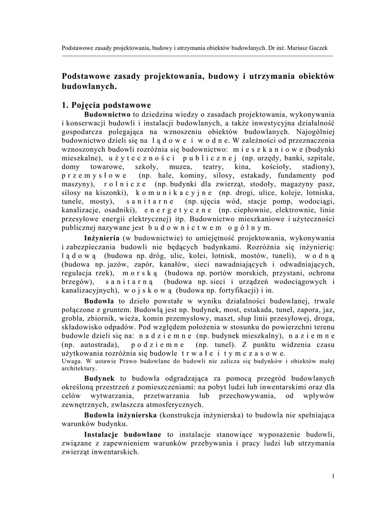 Podstawowe zasady projektowania, budowy i utrzymania obiektów budowlanych. Dr inż. Mariusz Gaczek Podstawowe zasady projektowania, budowy i utrzymania obiektów budowlanych. 1. Pojęcia podstawowe Budownictwo to dziedzina wiedzy o zasadach projektowania, wykonywania i konserwacji budowli i instalacji budowlanych, a także inwestycyjna działalność gospodarcza polegająca na wznoszeniu obiektów budowlanych. Najogólniej budownictwo dzieli się na l ą d o w e i w o d n e. W zależności od przeznaczenia wznoszonych budowli rozróżnia się budownictwo: m i e s z k a n i o w e (budynki mieszkalne), u ż y t e c z n o ś c i p u b l i c z n e j (np. urzędy, banki, szpitale, domy towarowe, szkoły, muzea, teatry, kina, kościoły, stadiony), przemysłowe (np. hale, kominy, silosy, estakady, fundamenty pod maszyny), r o l n i c z e (np. budynki dla zwierząt, stodoły, magazyny pasz, silosy na kiszonki), k o m u n i k a c y j n e (np. drogi, ulice, koleje, lotniska, tunele, mosty), sanitarne (np. ujęcia wód, stacje pomp, wodociągi, kanalizacje, osadniki), e n e r g e t y c z n e (np. ciepłownie, elektrownie, linie przesyłowe energii elektrycznej) itp. Budownictwo mieszkaniowe i użyteczności publicznej nazywane jest b u d o w n i c t w e m o g ó l n y m. Inżynieria (w budownictwie) to umiejętność projektowania, wykonywania i zabezpieczania budowli nie będących budynkami. Rozróżnia się inżynierię: l ą d o w ą (budowa np. dróg, ulic, kolei, lotnisk, mostów, tuneli), w o d n ą (budowa np. jazów, zapór, kanałów, sieci nawadniających i odwadniających, regulacja rzek), m o r s k ą (budowa np. portów morskich, przystani, ochrona brzegów), sanitarną (budowa np. sieci i urządzeń wodociągowych i kanalizacyjnych), w o j s k o w ą (budowa np. fortyfikacji) i in. Budowla to dzieło powstałe w wyniku działalności budowlanej, trwale połączone z gruntem. Budowlą jest np. budynek, most, estakada, tunel, zapora, jaz, grobla, zbiornik, wieża, komin przemysłowy, maszt, słup linii przesyłowej, droga, składowisko odpadów. Pod względem położenia w stosunku do powierzchni terenu budowle dzieli się na: n a d z i e m n e (np. budynek mieszkalny), n a z i e m n e (np. autostrada), podziemne (np. tunel). Z punktu widzenia czasu użytkowania rozróżnia się budowle t r w a ł e i t y m c z a s o w e. Uwaga. W ustawie Prawo budowlane do budowli nie zalicza się budynków i obiektów małej architektury. Budynek to budowla odgradzająca za pomocą przegród budowlanych określoną przestrzeń z pomieszczeniami: na pobyt ludzi lub inwentarskimi oraz dla celów wytwarzania, przetwarzania lub przechowywania, od wpływów zewnętrznych, zwłaszcza atmosferycznych. Budowla inżynierska (konstrukcja inżynierska) to budowla nie spełniająca warunków budynku. Instalacje budowlane to instalacje stanowiące wyposażenie budowli, związane z zapewnieniem warunków przebywania i pracy ludzi lub utrzymania zwierząt inwentarskich. 1 Podstawowe zasady projektowania, budowy i utrzymania obiektów budowlanych. Dr inż. Mariusz Gaczek Sieć to zespół urządzeń i elementów (przewodów) służących do: przesyłania i rozprowadzania określonych czynników z miejsc wytwarzania do miejsc poboru (sieć elektroenergetyczna, ciepłownicza, wodociągowa, gazowa) lub zbierania i odprowadzania (spławiania) ścieków i wód opadowych do odbiorników (sieć kanalizacyjna). Obiekt budowlany to budowla wraz z urządzeniami technicznymi i instalacjami związanymi z tą budowlą. 2. Podstawowe zasady projektowania budowli • • 1. 2. 3. 4. 5. 6. W trakcie procesu projektowania budowli należy określić: rozwiązanie funkcjonalne (np. podział domu na część dzienną i nocną), rozwiązanie materiałowo-konstrukcyjne. Wybierając rozwiązanie materiałowo-konstrukcyjne należy zapewnić: bezpieczeństwo konstrukcji, bezpieczeństwo pożarowe, bezpieczeństwo użytkowania, odpowiednie warunki higieniczne, zdrowotne oraz ochrony środowiska, ochronę przed hałasem i drganiami, oszczędność energii i odpowiednią izolacyjność cieplną przegród budowlanych. Są to tzw. wymagania podstawowe • • • • Bezpieczeństwo konstrukcji zapewniają m.in.: prawidłowy model obliczeniowy konstrukcji (zadanie mechaniki technicznej), odpowiednie współczynniki bezpieczeństwa (najczęściej rozdzielone – zwiększające obciążenia i zmniejszające wytrzymałość materiału konstrukcyjnego), właściwie przyjęte obciążenia w obliczeniach konstrukcji, odpowiednia trwałość konstrukcji (zabezpieczenie przed korozją, wodą). Na spełnienie pozostałych wymagań podstawowych mają przede wszystkim wpływ zastosowane materiały budowlane i sposób ich wbudowania. Na wybór materiałów budowlanych wpływają głównie następujące czynniki: • potrzeba uzyskania projektowanej formy architektonicznej, • zapewnienie wytrzymałości, sztywności, stateczności i szczelności projektowanych elementów i ustrojów budowlanych, • zapewnienie trwałości (zabezpieczenie przed korozją, ogniem, wodą), • zapewnienie swobody kształtowania elementów i ustrojów konstrukcyjnych, • zapewnienie warunków zdrowotnych (np. eliminowanie materiałów zawierających kazeinę, wykazujących podwyższoną promieniotwórczość, zawierających włókna rakotwórcze), 2 Podstawowe zasady projektowania, budowy i utrzymania obiektów budowlanych. Dr inż. Mariusz Gaczek • • • uzyskanie wymaganej ochrony cieplnej oraz przed hałasem i drganiami, ekonomia rozwiązań, inne (np. dostępność materiałów). 3. Przepisy prawne 3.1. Ustawy Działalność obejmującą sprawy projektowania, budowy, utrzymania i rozbiórki obiektów budowlanych normuje ustawa Prawo budowlane. Zgodnie z art. 5 tej ustawy: 1. Obiekt budowlany wraz ze związanymi z nim urządzeniami budowlanymi należy, biorąc pod uwagę przewidywany okres użytkowania, projektować i budować w sposób określony w przepisach, w tym