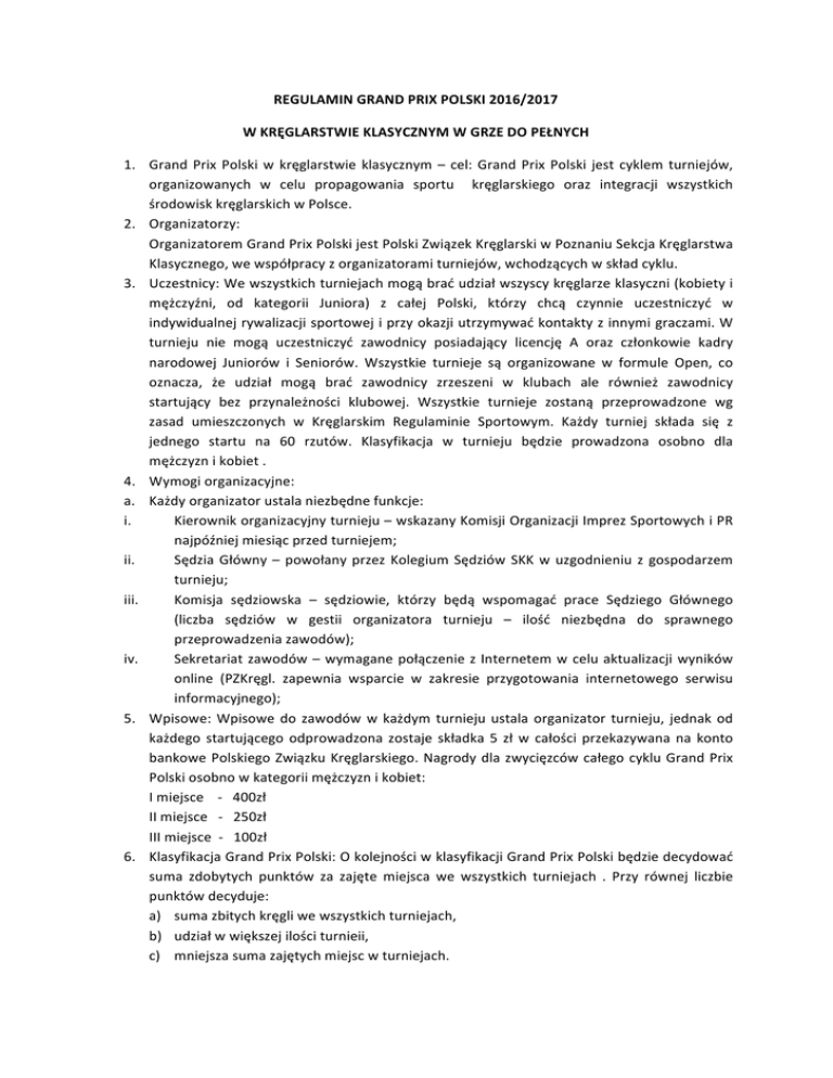 REGULAMINGRANDPRIXPOLSKI2016/2017 WKRĘGLARSTWIEKLASYCZNYMWGRZEDOPEŁNYCH 1. Grand Prix Polski w kręglarstwie klasycznym – cel: Grand Prix Polski jest cyklem turniejów, organizowanych w celu propagowania sportu kręglarskiego oraz integracji wszystkich środowiskkręglarskichwPolsce. 2. Organizatorzy: OrganizatoremGrandPrixPolskijestPolskiZwiązekKręglarskiwPoznaniuSekcjaKręglarstwa Klasycznego,wewspółpracyzorganizatoramiturniejów,wchodzącychwskładcyklu. 3. Uczestnicy:Wewszystkichturniejachmogąbraćudziałwszyscykręglarzeklasyczni(kobietyi mężczyźni, od kategorii Juniora) z całej Polski, którzy chcą czynnie uczestniczyć w indywidualnejrywalizacjisportowejiprzyokazjiutrzymywaćkontaktyzinnymigraczami.W turnieju nie mogą uczestniczyć zawodnicy posiadający licencję A oraz członkowie kadry narodowej Juniorów i Seniorów. Wszystkie turnieje są organizowane w formule Open, co oznacza, że udział mogą brać zawodnicy zrzeszeni w klubach ale również zawodnicy startujący bez przynależności klubowej. Wszystkie turnieje zostaną przeprowadzone wg zasad umieszczonych w Kręglarskim Regulaminie Sportowym. Każdy turniej składa się z jednego startu na 60 rzutów. Klasyfikacja w turnieju będzie prowadzona osobno dla mężczyznikobiet. 4. Wymogiorganizacyjne: a. Każdyorganizatorustalaniezbędnefunkcje: i. Kierownikorganizacyjnyturnieju–wskazanyKomisjiOrganizacjiImprezSportowychiPR najpóźniejmiesiącprzedturniejem; ii. Sędzia Główny – powołany przez Kolegium Sędziów SKK w uzgodnieniu z gospodarzem turnieju; iii. Komisja sędziowska – sędziowie, którzy będą wspomagać prace Sędziego Głównego (liczba sędziów w gestii organizatora turnieju – ilość niezbędna do sprawnego przeprowadzeniazawodów); iv. Sekretariat zawodów – wymagane połączenie z Internetem w celu aktualizacjiwyników online (PZKręgl. zapewnia wsparcie w zakresie przygotowania internetowego serwisu informacyjnego); 5. Wpisowe: Wpisowe do zawodów w każdym turnieju ustala organizator turnieju, jednak od każdego startującego odprowadzona zostaje składka 5 zł w całości przekazywana na konto bankowePolskiegoZwiązkuKręglarskiego.NagrodydlazwycięzcówcałegocykluGrandPrix Polskiosobnowkategoriimężczyznikobiet: Imiejsce-400zł IImiejsce-250zł IIImiejsce-100zł 6. KlasyfikacjaGrandPrixPolski:OkolejnościwklasyfikacjiGrandPrixPolskibędziedecydować suma zdobytych punktów za zajęte miejsca we wszystkich turniejach . Przy równej liczbie punktówdecyduje: a) sumazbitychkręgliwewszystkichturniejach, b) udziałwwiększejilościturnieii, c) mniejszasumazajętychmiejscwturniejach. Za zajęcie odpowiednich miejsc w turniejach zdobywa się punkty w klasyfikacji Grand Prix Polskiitak: 7. a. 8. 9. 10. 1miejsce–200punktów 2miejsce–190punktów 3miejsce–180punktów 4miejsce–170punktów 5miejsce–160punktów 6miejsce–150punktów 7miejsce–140punktów 8miejsce–130punktów 9miejsce–120punktów 10miejsce–110punktów 11miejsce–100punktów 12miejsce–90punktów 13miejsce–80punktów 14miejsce–70punktów 15miejsce–60punktów 16miejsce–50punktów 17miejsce–40punktów 18miejsce–30punktów 19miejsce–20punktów 20miejsce–10punktów od21doostatniego–5punktów Nagrody: Nagrodywposzczególnychturniejachwguznaniaorganizatorów Terminyimiejscarozgrywaniaturniejów: Sieraków–24.09.2016r. Wronki–22.10.2016r. Gostyń–04.02.2017r. PoznańCzarnaKula–18.03.2017r. Puck-29.04.2017r. Patronatmedialny: PolskiSerwisKręglarski–www.kregle.net Informacjedodatkowe: Przed każdym turniejem zostaną przedstawione dodatkowe informacje związane z poszczególnym turniejem. Informacje będą dostępne na stronach patronackich (punkt 11 regulaminu).