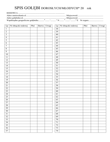 SPIS GOŁĘBI DOROSŁYCH/MŁODYCH* 20 rok HODOWCA ...................................................................... ................. Adres zamieszkania ul ........................................................................... Miejscowość................................................ Adres gołębnika ul ..................................................................................Miejscowość .............................. ................. Współrzędne geograficzne gołębnika ........... 0 ........ ' .......... " N ........ 0 ........ ' ........." E Nr zegara............................ Lp Nr obrączki rodowej 1 2 3 4 5 6 7 8 9 10 11 12 13 14 15 16 17 18 19 20 21 22 23 24 25 26 27 28 29 30 31 32 33 34 35 36 37 Płeć Barwa Uwagi Lp Nr obrączki rodowej 38 39 40 41 42 43 44 45 46 47 48 49 50 51 52 53 54 55 56 57 58 59 60 61 62 63 64 65 66 67 68 69 70 71 72 73 74 Płeć Barwa Uwagi Lp Nr obrączki rodowej Płeć Barwa Uwagi Lp 75 116 76 117 77 118 78 119 79 120 80 121 81 122 82 123 83 124 84 125 85 126 86 127 87 128 88 129 89 130 90 131 91 132 92 133 93 134 94 135 95 136 96 137 97 138 98 139 99 140 100 141 101 142 102 143 103 144 104 145 105 146 106 147 107 148 108 149 109 150 110 151 111 152 112 153 113 154 114 155 115 156 Nr obrączki rodowej Data, pieczęć i podpis Lekarza Weterynarii Data i podpis hodowcy Za Zarząd Sekretarz Płeć Prezes Barwa Uwagi Lp Nr obrączki rodowej Płeć Barwa Uwagi Lp Nr obrączki rodowej Data, pieczęć i podpis Lekarza Weterynarii Data i podpis hodowcy Za Zarząd Sekretarz Płeć Prezes Barwa Uwagi