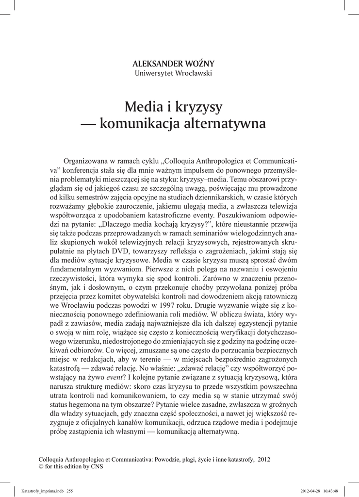 ALEKSANDER WONY Uniwersytet Wroc³awski Media i kryzysy — komunikacja alternatywna Organizowana w ramach cyklu „Colloquia Anthropologica et Communicativa” konferencja stała się dla mnie ważnym impulsem do ponownego przemyślenia problematyki mieszczącej się na styku: kryzysy–media. Temu obszarowi przyglądam się od jakiegoś czasu ze szczególną uwagą, poświęcając mu prowadzone od kilku semestrów zajęcia opcyjne na studiach dziennikarskich, w czasie których rozważamy głębokie zauroczenie, jakiemu ulegają media, a zwłaszcza telewizja współtworząca z upodobaniem katastroficzne eventy. Poszukiwaniom odpowiedzi na pytanie: „Dlaczego media kochają kryzysy?”, które nieustannie przewija się także podczas przeprowadzanych w ramach seminariów wielogodzinnych analiz skupionych wokół telewizyjnych relacji kryzysowych, rejestrowanych skrupulatnie na płytach DVD, towarzyszy refleksja o zagrożeniach, jakimi stają się dla mediów sytuacje kryzysowe. Media w czasie kryzysu muszą sprostać dwóm fundamentalnym wyzwaniom. Pierwsze z nich polega na nazwaniu i oswojeniu rzeczywistości, która wymyka się spod kontroli. Zarówno w znaczeniu przenośnym, jak i dosłownym, o czym przekonuje choćby przywołana poniżej próba przejęcia przez komitet obywatelski kontroli nad dowodzeniem akcją ratowniczą we Wrocławiu podczas powodzi w 1997 roku. Drugie wyzwanie wiąże się z koniecznością ponownego zdefiniowania roli mediów. W obliczu świata, który wypadł z zawiasów, media zadają najważniejsze dla ich dalszej egzystencji pytanie o swoją w nim rolę, wiążące się często z koniecznością weryfikacji dotychczasowego wizerunku, niedostrojonego do zmieniających się z godziny na godzinę oczekiwań odbiorców. Co więcej, zmuszane są one często do porzucania bezpiecznych miejsc w redakcjach, aby w terenie — w miejscach bezpośrednio zagrożonych katastrofą — zdawać relację. No właśnie: „zdawać relację” czy współtworzyć powstający na żywo event? I kolejne pytanie związane z sytuacją kryzysową, która narusza strukturę mediów: skoro czas kryzysu to przede wszystkim powszechna utrata kontroli nad komunikowaniem, to czy media są w stanie utrzymać swój status hegemona na tym obszarze? Pytanie wielce zasadne, zwłaszcza w groźnych dla władzy sytuacjach, gdy znaczna część społeczności, a nawet jej większość rezygnuje z oficjalnych kanałów komunikacji, odrzuca rządowe media i podejmuje próbę zastąpienia ich własnymi — komunikacją alternatywną. Colloquia Anthropologica et Communicativa: Powodzie, plagi, życie i inne katastrofy, 2012 © for this edition by CNS Katastrofy_imprima.indb 255 2012-04-28 16:43:48 256 ALEKSANDER WONY Oto przykład przejmowania oddolnej, obywatelskiej kontroli nad chaosem organizacyjnym i logistycznym spowodowanym powodzią tysiąclecia. Zdaniem Józefa Adamowskiego1, uczestnika utworzonego samorzutnie — w obliczu nadchodzącej do Wrocławia fali powodziowej — komitetu obywatelskiego: nie zrozumiemy fenomenu obrony cywilnej Wrocławia, jeśli nie wspomnimy tej organizacji [organizacji, która nosiła nazwę „wolontariatu miejskiego” — przyp. A.W.]. Nie wiem dlaczego o tym się nie pisze, ale to było kilkaset osób […], które w czasie powodzi w Urzędzie Miasta na Nowym Targu ja nie powiem: przejęły władzę, ale one kierowały — te osoby, dużo młodsze ode mnie — wywozem i przywozem ludności już z terenów zalanych. W sytuacji kryzysowej, która dla mediów w niej uczestniczących jest zarazem ich kryzysem2, dochodzi do zredefinowania roli mediów. Widać to dobrze na lokalnym przykładzie powodzi w 1997 roku. Dziennikarze Radia Wrocław w audycji emitowanej na żywo w dzień po przejściu przez miasto wielkiej fali wyznają: My po prostu wiemy, że ludzie, którzy pracowali przy budowie zapór, ludzie, którzy starali się robić ze wszystkich sił to, co umieli robić najlepiej, nie byli w żaden sposób koordynowani, nikt nie był im w stanie poradzić, a do nas dzwonili z pytaniem czy ustawiać [zapory — przyp. A.W.] pod takim kątem czy pod takim3. Podobnie rzecz się ma z „Gazetą Dolnośląską”, która „przestaje być gazetą z zewnątrz. Staliśmy się gazetą, której sprzedaż gwałtownie zaczęła rosnąć. Ludzie nas zidentyfikowali jako tę, która była przy nich w skrajnej sytuacji”4. W tej sytuacji dziennikarze przejmują role, które wydają się diametralnie odmienne w stosunku do ich profesji, czemu daje wyraz redaktor Marcin Rybak z „Gazety Dolnośląskiej”, pytając: „Jak to się stało, że krytycznej nocy z soboty na niedzielę, kiedy woda zalewała miasto, akcją ustawiania wałów kierowały stacje radiowe i telewizyjne?”5 Ten sam, który kilka dni wcześniej był w Kotlinie Kłodzkiej, gdzie „kierował eskadrą śmigłowców wojskowych, a wysoki rangą wojskowi pytali: no gdzie panie redaktorze, na południe?”6 Dokonana z antropologicznej i zarazem komunikacyjnej perspektywy uważna lektura „telewizyjnych maratonów katastrof”, tym razem postrzeganych w ma1 Z wypowiedzi nagranej w rocznicowym programie dokumentalnym W pięć lat po powodzi, wyemitowanym w 2002 roku przez wrocławski ośrodek TVP. 2 O ile dla Macieja Mrozowskiego (Media masowe. Władza, rozrywka i biznes, Warszawa 2001, s. 151) teza o tym, że „każdy kryzys, który media relacjonują, jest też w jakimś stopniu kryzysem mediów”, wskazuje przede wszystkim na ich uwikłanie w sprzeczności, dylematy i konflikty dyskursu politycznego, o tyle w moim ujęciu kryzys dotyczy całego środowiska medialnego (w wymiarze globalnym). 3 Kopia nagrania z 15 lipca 1997 roku (w archiwum autora). 4 Z wywiadu, jaki przeprowadziłem 23 maja 2002 roku z redaktor naczelną „Gazety Dolnośląskiej” Barbarą Piegdoń-Adamczyk. 5 M. Rybak, Kto tu wpuścił dziennikarzy, „Gazeta Dolnośląska” 19–20 lipca 1997. 6 Z wywiadu z Barbarą Piegdoń-Adamczyk