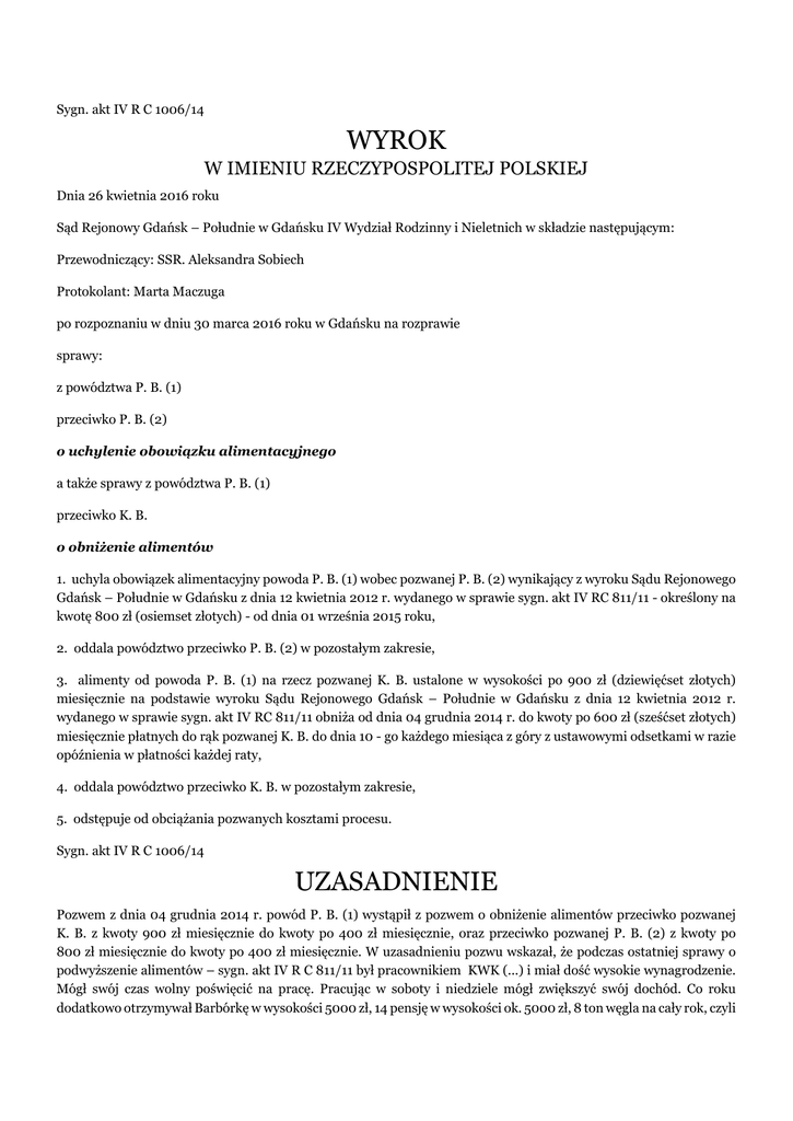 Sygn. akt IV R C 1006/14 WYROK W IMIENIU RZECZYPOSPOLITEJ POLSKIEJ Dnia 26 kwietnia 2016 roku Sąd Rejonowy Gdańsk – Południe w Gdańsku IV Wydział Rodzinny i Nieletnich w składzie następującym: Przewodniczący: SSR. Aleksandra Sobiech Protokolant: Marta Maczuga po rozpoznaniu w dniu 30 marca 2016 roku w Gdańsku na rozprawie sprawy: z powództwa P. B. (1) przeciwko P. B. (2) o uchylenie obowiązku alimentacyjnego a także sprawy z powództwa P. B. (1) przeciwko K. B. o obniżenie alimentów 1. uchyla obowiązek alimentacyjny powoda P. B. (1) wobec pozwanej P. B. (2) wynikający z wyroku Sądu Rejonowego Gdańsk – Południe w Gdańsku z dnia 12 kwietnia 2012 r. wydanego w sprawie sygn. akt IV RC 811/11 - określony na kwotę 800 zł (osiemset złotych) - od dnia 01 września 2015 roku, 2. oddala powództwo przeciwko P. B. (2) w pozostałym zakresie, 3. alimenty od powoda P. B. (1) na rzecz pozwanej K. B. ustalone w wysokości po 900 zł (dziewięćset złotych) miesięcznie na podstawie wyroku Sądu Rejonowego Gdańsk – Południe w Gdańsku z dnia 12 kwietnia 2012 r. wydanego w sprawie sygn. akt IV RC 811/11 obniża od dnia 04 grudnia 2014 r. do kwoty po 600 zł (sześćset złotych) miesięcznie płatnych do rąk pozwanej K. B. do dnia 10 - go każdego miesiąca z góry z ustawowymi odsetkami w razie opóźnienia w płatności każdej raty, 4. oddala powództwo przeciwko K. B. w pozostałym zakresie, 5. odstępuje od obciążania pozwanych kosztami procesu. Sygn. akt IV R C 1006/14 UZASADNIENIE Pozwem z dnia 04 grudnia 2014 r. powód P. B. (1) wystąpił z pozwem o obniżenie alimentów przeciwko pozwanej K. B. z kwoty 900 zł miesięcznie do kwoty po 400 zł miesięcznie, oraz przeciwko pozwanej P. B. (2) z kwoty po 800 zł miesięcznie do kwoty po 400 zł miesięcznie. W uzasadnieniu pozwu wskazał, że podczas ostatniej sprawy o podwyższenie alimentów – sygn. akt IV R C 811/11 był pracownikiem KWK (...) i miał dość wysokie wynagrodzenie. Mógł swój czas wolny poświęcić na pracę. Pracując w soboty i niedziele mógł zwiększyć swój dochód. Co roku dodatkowo otrzymywał Barbórkę w wysokości 5000 zł, 14 pensję w wysokości ok. 5000 zł, 8 ton węgla na cały rok, czyli ok. 4500 zł netto, bony żywnościowe za każdy przepracowany dzień 12 zł, czyli około 300-350 zł miesięcznie. Dochód powoda kształtował się w wysokości ok. 6500 zł miesięcznie i dodatkowo dodatki 18.100 zł rocznie. Obecnie powód jest na emeryturze, która wynosi 3793 zł miesięcznie. Po odliczeniu alimentów pozostaje mu na rękę 2093 zł. Powód ponosi koszty ubezpieczenia w wysokości 168,40 zł, oraz bieżące rachunki w łącznej wysokości 1335,95 zł. Po odjęciu alimentów i rachunków pozostaje powodowi 757,05 zł. Powód ma rodzinę, żonę , 6 letnią córkę, która rozpoczęła naukę w szkle podstawowej. Córka choruje na przewlekłe zapalenie górnych dróg oddechowych, które są związane z alergią na roztocza. Przyjmuje leki, antybiotyki, witaminy drogie maści. Córka jest w wieku, w którym ze wszystkiego bardzo szybko wyrasta. Starsze córki starają sobie same radzić. K. studiuje i pracuje, mieszka z partnerem i utrzymuje się z pracy i alimentów. P. mieszka z dziewczyną, nie ma podejścia do nauki, ani do dorosłego życia. Powtarza drugą klasę, ignoruje ojca i matkę, twierdząc że jest dorosła. Ma nałogi papierosy, alkohol i prawdopodobnie narkotyki. Powód nie ma kontaktów z córkami, które go unikają, powód jest jedynym płatnikiem alimentów. W odpowiedzi na pozew pozwana K. B. wniosła o oddalenie powództwa. Pozwana wskazała, że podczas ostatniej sprawy o podwyższenie alimentów sygn. akt IV R C 811/11 miała 19 lat i mieszkała z matkę I. B. i wówczas jej potrzeby były mniejsze. Obecnie mieszka sama, a nie z partnerem. Mieszkanie dzieli z trzema współlokatorami. Koszty związane z utrzymaniem mieszkania to 700 zł miesięcznie. Wyżywienie 900 zł, koszty związane z anemią, na którą choruje pozwana i słabą odpornością. Poza tym pozwana choruje na astmę oskrzelową, znajduje się pod opiekę lekarza pulmonologa i alergologa. Koszt zakupu stałych leków 130 zł. Pozwana leczy się także na migrenę. Kolejne leki, suplementy diety 120 zł miesięcznie, basen 100 zł, koszt zakupu odzieży, obuwia, bielizny, pościeli 300 zł miesięcznie, środki czystości i higieny 120 zł, środki chemiczne 50 zł, bilet miesięczny 46 zł, dodatkowy koszt dojazdów w celach edukacyjnych 100 -120 zł miesięcznie, wydatki związane z edukacją, w tym kserokopia materiałów dydaktycznych 150 zł, koszt telefonu i internetu 130 zł. Łączny koszt utrzymania pozwanej to kwota 2800 zł miesięcznie. W grudniu 2014 roku wykryto u pozwanej wadę wzroku, co spowodowało konieczność zakupu okularów. Pozwana dorabia pracując w (...), średniomiesięczny dochód w 2014 roku wyniósł 1400 zł miesięcznie. W czwartym semestrze pozwana poświęca więcej czasu na naukę i zajęcia i zarabia 1200 – 1300 zł miesięcznie. Pozwana nie ma żadnych zaległości na uczelni. Mając na uwadze koszty utrzymania pozwanej, po uwzględnieniu dochodu pozwanej oraz alimentów resztę brakującej kwoty otrzymuje od matki. Matka przekazuje nie tylko pieniądze, ale także daje pozwanej wyżywienie, ubranie. Więcej matka nie może przekazywać pozwanej, gdyż utrzymuje małoletnią przyrodnią siostrę O. ur. (...) Powód oprócz emerytury dorabia sobie przy remontach, do czego sam się przyznał. Ojciec ma żonę, która pracuje. Powód nie utrzymywał z pozwanymi przez 11 lat żadnych kontaktów. Po 11 latach postanowił odnowić kontakt i zmniejszyć córkom alimenty, co było celowym działaniem. W odpowiedzi na pozew pozwana P. B. (2) wniosła o oddalenie powództwa. Pozwana wskazała, że podczas ostatniej sprawy o podwyższenie alimentów sygn. akt IV R C 811/11 miała 16 lat i mieszkała z matką I. B.. Obecnie pozwana nie mieszka ze sw