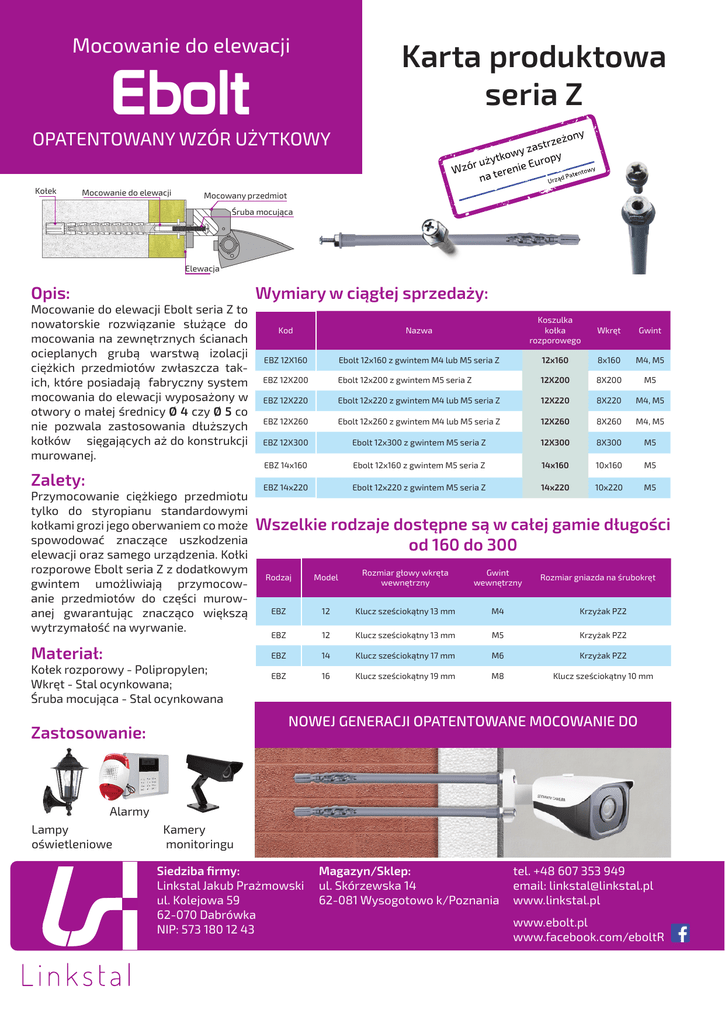 Mocowanie do elewacji Karta produktowa seria Z Ebolt OPATENTOWANY WZÓR UŻYTKOWY Kołek Mocowanie do elewacji Mocowany przedmiot Śruba mocująca Elewacja Opis: Mocowanie do elewacji Ebolt seria Z to nowatorskie rozwiązanie służące do mocowania na zewnętrznych ścianach ocieplanych grubą warstwą izolacji ciężkich przedmiotów zwłaszcza takich, które posiadają fabryczny system mocowania do elewacji wyposażony w otwory o małej średnicy Ø 4 czy Ø 5 co nie pozwala zastosowania dłuższych kołków sięgających aż do konstrukcji murowanej. Zalety: Przymocowanie ciężkiego przedmiotu tylko do styropianu standardowymi kołkami grozi jego oberwaniem co może spowodować znaczące uszkodzenia elewacji oraz samego urządzenia. Kołki rozporowe Ebolt seria Z z dodatkowym gwintem umożliwiają przymocowanie przedmiotów do części murowanej gwarantując znacząco większą wytrzymałość na wyrwanie. Materiał: Kołek rozporowy - Polipropylen; Wkręt - Stal ocynkowana; Śruba mocująca - Stal ocynkowana Wymiary w ciągłej sprzedaży: Kod Nazwa Koszulka kołka rozporowego Wkręt Gwint EBZ 12X160 Ebolt 12x160 z gwintem M4 lub M5 seria Z 12x160 8x160 M4, M5 EBZ 12X200 Ebolt 12x200 z gwintem M5 seria Z 12X200 8X200 M5 EBZ 12X220 Ebolt 12x220 z gwintem M4 lub M5 seria Z 12X220 8X220 M4, M5 EBZ 12X260 Ebolt 12x260 z gwintem M4 lub M5 seria Z 12X260 8X260 M4, M5 EBZ 12X300 Ebolt 12x300 z gwintem M5 seria Z 12X300 8X300 M5 EBZ 14x160 Ebolt 12x160 z gwintem M5 seria Z 14x160 10x160 M5 EBZ 14x220 Ebolt 12x220 z gwintem M5 seria Z 14x220 10x220 M5 Wszelkie rodzaje dostępne są w całej gamie długości od 160 do 300 Rodzaj Model Rozmiar głowy wkręta wewnętrzny Gwint wewnętrzny EBZ 12 Klucz sześciokątny 13 mm M4 Krzyżak PZ2 EBZ 12 Klucz sześciokątny 13 mm M5 Krzyżak PZ2 EBZ 14 Klucz sześciokątny 17 mm M6 Krzyżak PZ2 EBZ 16 Klucz sześciokątny 19 mm M8 Klucz sześciokątny 10 mm Rozmiar gniazda na śrubokręt NOWEJ GENERACJI OPATENTOWANE MOCOWANIE DO Zastosowanie: Alarmy Lampy oświetleniowe Kamery monitoringu Siedziba firmy: Linkstal Jakub Prażmowski ul. Kolejowa 59 62-070 Dabrówka NIP: 573 180 12 43 Magazyn/Sklep: ul. Skórzewska 14 62-081 Wysogotowo k/Poznania tel. +48 607 353 949 email: [email protected] www.linkstal.pl www.ebolt.pl www.facebook.com/eboltR