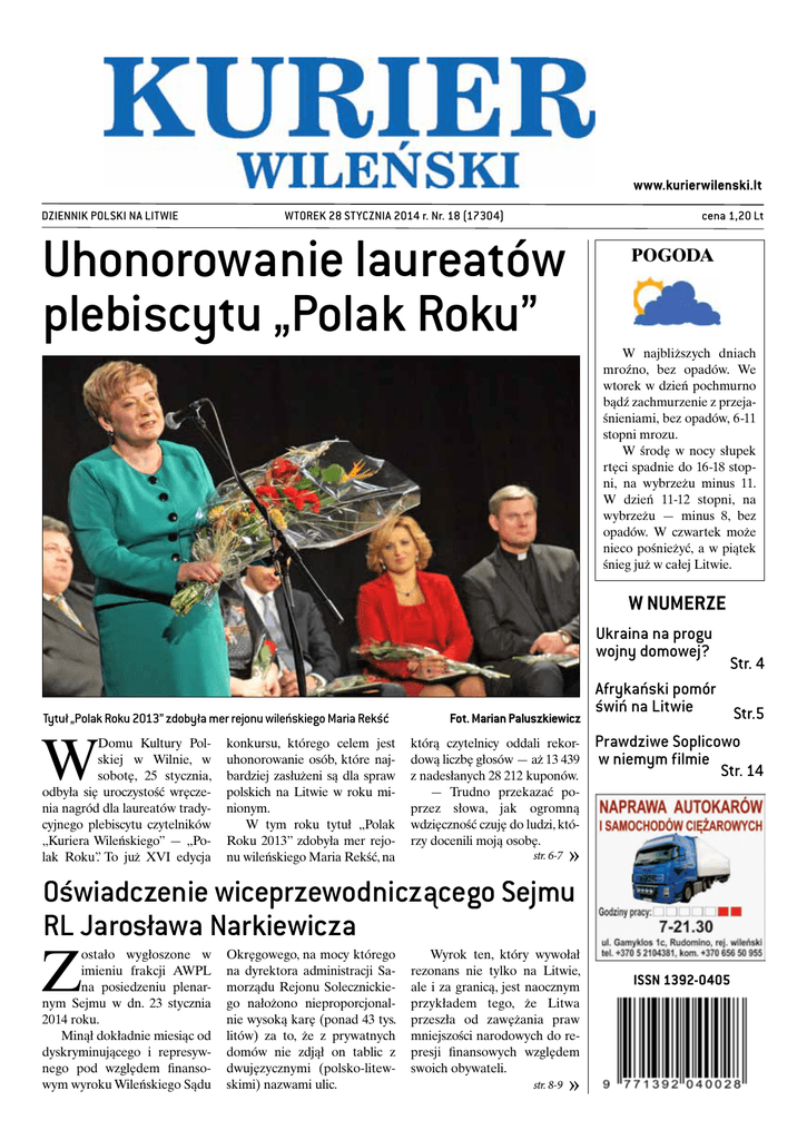 www.kurierwilenski.lt DZIENNIK POLSKI NA LITWIE WTOREK 28 STYCZNIA 2014 r. Nr. 18 (17304) cena 1,20 Lt Uhonorowanie laureatów plebiscytu „Polak Roku” POGODA W najbliższych dniach mroźno, bez opadów. We wtorek w dzień pochmurno bądź zachmurzenie z przejaśnieniami, bez opadów, 6-11 stopni mrozu. W środę w nocy słupek rtęci spadnie do 16-18 stopni, na wybrzeżu minus 11. W dzień 11-12 stopni, na wybrzeżu — minus 8, bez opadów. W czwartek może nieco pośnieżyć, a w piątek śnieg już w całej Litwie. W NUMERZE Ukraina na progu wojny domowej? Tytuł „Polak Roku 2013” zdobyła mer rejonu wileńskiego Maria Rekść W Domu Kultury Polskiej w Wilnie, w sobotę, 25 stycznia, odbyła się uroczystość wręczenia nagród dla laureatów tradycyjnego plebiscytu czytelników „Kuriera Wileńskiego” — „Polak Roku”. To już XVI edycja konkursu, którego celem jest uhonorowanie osób, które najbardziej zasłużeni są dla spraw polskich na Litwie w roku minionym. W tym roku tytuł „Polak Roku 2013” zdobyła mer rejonu wileńskiego Maria Rekść, na Fot. Marian Paluszkiewicz którą czytelnicy oddali rekordową liczbę głosów — aż 13 439 z nadesłanych 28 212 kuponów. — Trudno przekazać poprzez słowa, jak ogromną wdzięczność czuję do ludzi, którzy docenili moją osobę. str. 6-7 Str. 4 Afrykański pomór świń na Litwie Str.5 Prawdziwe Soplicowo w niemym filmie Str. 14 » Oświadczenie wiceprzewodniczącego Sejmu RL Jarosława Narkiewicza Z ostało wygłoszone w imieniu frakcji AWPL na posiedzeniu plenarnym Sejmu w dn. 23 stycznia 2014 roku. Minął dokładnie miesiąc od dyskryminującego i represywnego pod względem finansowym wyroku Wileńskiego Sądu Okręgowego, na mocy którego na dyrektora administracji Samorządu Rejonu Solecznickiego nałożono nieproporcjonalnie wysoką karę (ponad 43 tys. litów) za to, że z prywatnych domów nie zdjął on tablic z dwujęzycznymi (polsko-litewskimi) nazwami ulic. Wyrok ten, który wywołał rezonans nie tylko na Litwie, ale i za granicą, jest naocznym przykładem tego, że Litwa przeszła od zawężania praw mniejszości narodowych do represji finansowych względem swoich obywateli. str. 8-9 » ISSN 1392-0405 WYDARZENIA 3 KURIER WILEŃSKI • Wtorek, 28 stycznia 2014 r. Najnowsze wydanie podręcznika „Polacy, Europejczycy, Obywatele”! E uropejska Fundacja Praw Człowieka (EFHR) z radością informuje o najnowszym wydaniu podręcznika „Polacy, Europejczycy, Obywatele”, który został przygotowany z myślą o młodzieży klas 9-12. Zadaniem podręcznika jest dostarczenie uczniom niezbędnych podstaw wiedzy o zachodzących w naszym otoczeniu procesach politycznych i społecznych, w tym również problemach i wyzwaniach współczesnego świata. W podręczniku jest poruszany szeroki zakres tematyczny, zawierający liczne odniesienia do realiów życia na Litwie, dzięki czemu przyswajanie wiedzy staje się o wiele ciekawsze. Wśród głównych bloków tematycznych jest rozdział o aktywności społecznej, samorządzie, władzy, mediach masowych, transformacji, gospodarce, organizacjach międzynarodowych, konfliktach międzynarodowych, wykluczeniu społecznym i chorobach, problemach współczesnego świata, narodzie i państwie oraz prawach człowieka. Podręcznik jest bogaty również w liczne ilustracje, zdjęcia, wykresy i mapy, przez co jego lektura staje się bliższa dla współczesnego czytelnika. Pierwotna wersja podręcznika była przygotowana wspólnie przez Fundację Nowoczesna Polska i Europejską Fundację Praw Człowieka, natomiast aktuali- Zadaniem podręczni ka jest dostarczenie uczniom niezbędnych podstaw wiedzy o za chodzących w naszym otoczeniu procesach politycznych i społecz nych, w tym również pro blemach i wyzwaniach współczesnego świata zacji podręcznika samodzielnie podjęła się EFHR. W drugim, uzupełnionym wydaniu podręcznika, Fundacja dokonała aktualizacji materiału z poprzedniego wydania. Dodano nowe rozdziały: naród i państwo, prawa człowieka i prawo. Zaktualizowano również zawarte w podręczniku informacje dotyczące realiów litewskich. Wszystkie materiały dostępne są na licencji Creative Commons Uznanie Autorstwa Na tych Samych Warunkach, co oznacza, że materiały mogą być edytowane i adaptowane do własnych potrzeb. Elektroniczna wersja podręcznika jest również dostępna w Internecie po kliknięciu na link. Aktualizacja podręcznika zbiegła się również z kontynuacją innowacyjnego projektu edukacyjnego „Europejczycy, Polacy, Obywatele” mającego na celu wdrożenie nowoczesnego programu nauczania przedmiotu „Wiedza o społeczeństwie” w szkołach polskich na Litwie. W grudniu 2013 roku odbył się natomiast uroczysty finał projektu „Europejczycy, Polacy, Obywatele” (więcej o finale projektu), w czasie którego uczniowie, którzy zdobyli największą ilość punktów, zdobyli atrakcyjne nagrody ufundowane przez EFHR, natomiast wszyscy inni, którzy zdali egzamin, otrzymali certyfikaty. W czasie uroczystości został zaprezentowany świeżo wydany podręcznik. Wierzymy, że będzie on bogatym i użytecznym źródłem wiedzy zarówno dla uczniów, nauczycieli, jak i innych czytelników, pragnących pogłębić wiedzę o społeczeństwie obywatelskim. W ciągu najbliższych tygodni podręczniki będą przekazane do polskich szkół i bibliotek na Litwie. Informujemy również, że każdy może zwrócić się do Fundacji z prośbą o przekazanie nieodpłatnego egzemplarza podręcznika. Życzymy miłego czytania! Inf. EFHR PULS KURIERA ZDJĘCIE DNIA Na modlitwie Anioł Pański papież Franciszek wypuścił z dwojgiem dzieci z włoskiej Akcji Katolickiej gołębie pokoju Fot. archiwum KOMENTARZ DNIA To ci dopiero kieszonkowe! W roku ubiegłym na tak zwaną działalność parlamentarną wydano 3,5 miliona litów. Pieniądze z tak określanego państwowego „spichrza” brali absolutnie wszyscy posłowie. Jedni w mniejszym, 