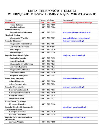 LISTA TELEFONÓW I EMAILI W URZĘDZIE MIASTA I GMINY KĄTY WROCŁAWSKIE Nazwa Sekretariat Iwona Tatarek Magdalena Zając Sekretarz Gminy Teresa Litwin-Bobowska Skarbnik Gminy Małgorzata Wujciów Wydział Finansowy Małgorzata Komarnicka Genowefa Latkowska Zofia Piątek Violetta Bigda Wydział Podatków i Opłat Janina Rajkowska Irena Ottenbreit Małgorzata Kwiatkowska Genowefa Kawałko Małgorzata Gidzińska Halina Borowska Krzysztof Matejunas Biuro Rady Miejskiej Adam Klimczak Alicja Sawoniewicz Wydział Obywatelski Lucyna Garbaczonek Katarzyna Brzozowska Grażyna Płuska Stanisław Kulpa Urząd Stanu Cywilnego Krystyna Lisiecka Wydział Geodezji i Gospodarki Nieruchomościami Krystyna Zaracka Urszula Olszewska Wydział Ochrony Środowiska i Rolnictwa Jadwiga Wójcik Numer telefonu +48 71 390 72 00 +48 71 390 72 00 +48 71 390 72 06 Adres email [email protected] +48 71 390 72 15 [email protected] +48 71 390 72 29 [email protected] [email protected] +48 71 390 72 04 +48 71 39 072 04 +48 71 390 72 30 +48 71 390 72 28 [email protected] +48 71 390 72 32 +48 71 390 72 31 +48 71 390 72 31 +48 71 390 72 31 +48 71 390 72 31 +48 17 390 72 30 +48 71 390 72 43 [email protected] +48 71 390 72 16 +48 71 390 72 14 [email protected] +48 71 390 72 11 +48 17 390 72 40 +48 71 390 72 24 +48 71 390 72 33 +48 71 390 72 18 [email protected] +48 71 390 72 39 +48 71 390 72 39 [email protected] +48 71 390 72 08 Anna Szczepańska Dorota Demko Agnieszka Pacyna Wydział Gospodarki Przestrzennej Przemysław Nowacki Agnieszka Zakrzewska Iwona Domagalska Sławomir Palichleb Wydział Gospodarki Komunalnej Piotr Litwin Ewa Figas Bożena Rząca Wydział Planowania Rozwoju i Inwestycji Agnieszka Litwin Edyta Kmiecik Ewa Kołodziej Stanisław Chojecki Czesław Stec Michał Czekański Wydział Organizacyjny Renata Spleśniak Anna Dębicka Aldona Niżnik Weronika Szwaj Tomasz Kudyba Dariusz Pacyna Zamówienia Publiczne Jadwiga Kurpiel Zespół Obsługi Jednostek Oświatowych Marek Osiński Danuta Pieniaka Grażyna Dudziec Renata Krzyżanowska Dominika Porochońska Gminny Ośrodek Pomocy Społecznej Danuta Szczerbień Jadwiga Kuriata Grażyna Kapitaniec +48 17 390 72 07 +48 71 390 72 07 +48 71 390 72 07 [email protected] +48 71 390 72 26 +48 71 39 072 27 +48 71 390 72 27 +48 71 390 72 27 [email protected] +48 71 390 72 25 +48 71 390 72 12 +48 71 390 72 12 [email protected] +48 71 390 72 36 +48 71 390 72 34 +48 71 390 72 34 +48 71 390 72 37 +48 71 390 72 37 +48 71 390 72 37 [email protected] +48 71 390 72 05 +48 71 390 72 14 +48 71 390 72 22 +48 71 390 72 22 +48 71 390 72 23 +48 71 390 72 23 [email protected] +48 71 390 72 19 [email protected] +48 71 390 72 13 +48 71 390 72 02 +48 71 390 72 21 +48 71 390 72 20 +48 71 390 72 13 +48 71 390 72 10 +48 17 390 72 17 +48 17 390 72 38
