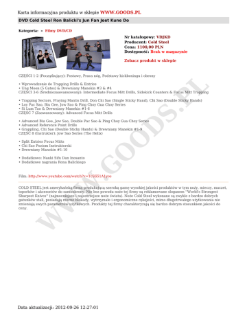 Karta informacyjna produktu w sklepie WWW.GOODS.PL DVD Cold Steel Ron Balicki's Jun Fan Jeet Kune Do Kategoria: » Filmy DVD/CD Nr katalogowy: VDJKD Producent: Cold Steel Cena: 1100,00 PLN Dostępność: Brak w magazynie Zobacz produkt w sklepie CZĘŚCI 1-2 (Początkujący): Postawy, Praca nóg, Podstawy kickboxingu i obrony S. PL • Wprowadzenie do Trapping Drills & Entries • Ung Moon (5 Gates) & Drewniany Manekin #3 & #4 CZĘŚCI 3-6 (Średniozaawansowany): Intermediate Focus Mitt Drills, Sidekick Counters & Focus Mitt Trapping • Trapping Sectors, Praying Mantis Drill, Don Chi Sao (Single Sticky Hand), Chi Sao (Double Sticky Hands) • Loy Pac Sao, Biu Gee, Jow Sao & Ping Choy Gua Choy Series • Si Lum Tao & Drewniany Manekin #1-6 CZĘŚĆ 7 (Zaawansowany): Advanced Focus Mitt Drills W .G • Dodatkowo: Nauki Sifu Dan Inosanto • Dodatkowe nagrania Rona Balickiego O • Split Entries Focus Mitts • Chi Sao Poziom Instruktorski • Drewniany Manekin #1-10 O D • Advanced Biu Gee, Jow Sao, Double Pac Sao & Ping Choy Gua Choy Series • Advanced Reference Point Drills • Grappling, Chi Sao (Double Sticky Hands) & Drewniany Manekin #1-9 CZĘŚĆ 8 (Instruktor): Jow Sao Series (The Helix) Film: http://www.youtube.com/watch?v=TcSS51A1yos W W COLD STEEL jest amerykańską firmą produkującą szeroką gamę wysokiej jakości produktów w tym noży, mieczy, maczet, toporków i akcesoriów do samoobrony. Nie bez powodu noże tej firmy są reklamowane sloganem ''World's Strongest Sharpest Knives'' (najmocniejsze i najostrzejsze noże świata). Noże Cold Steel wykonane są zwykle z bardzo dobrych gatunków stali, posiadają mocne blokady, wytrzymałe i ergonomiczne rękojeści, mimo długotrwałego użytkowania nie zmieniają swych parametrów użytkowych. Produkty tej firmy charakteryzują się bardzo dobrym stosunkiem jakości do ceny. Data aktualizacji: 2012-09-26 12:27:01