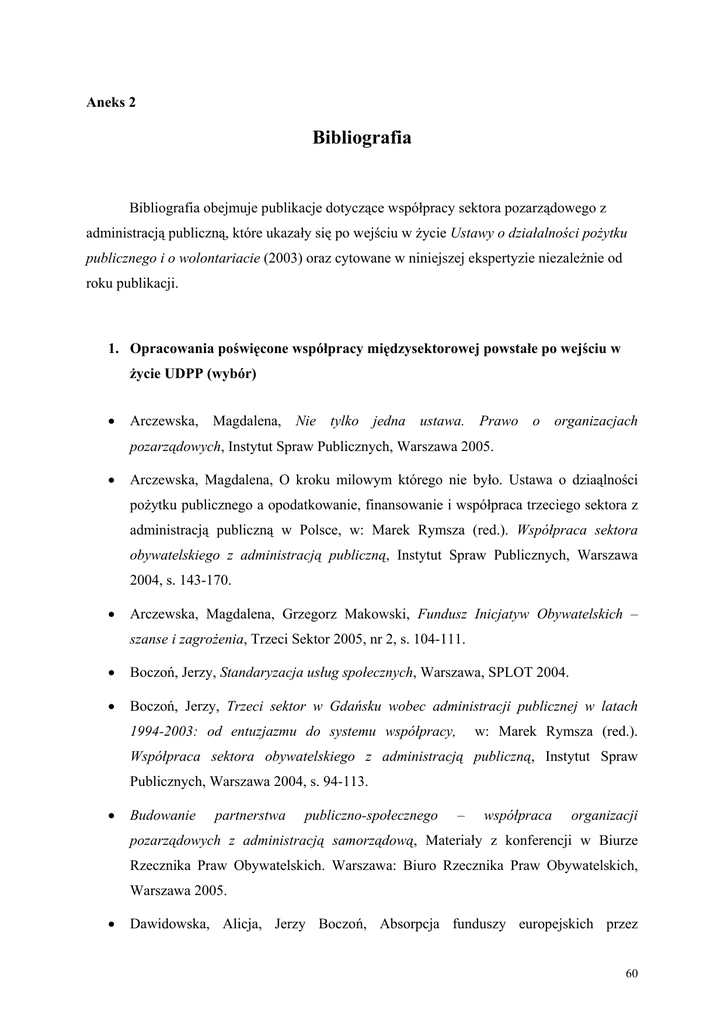 Aneks 2 Bibliografia Bibliografia obejmuje publikacje dotyczące współpracy sektora pozarządowego z administracją publiczną, które ukazały się po wejściu w życie Ustawy o działalności pożytku publicznego i o wolontariacie (2003) oraz cytowane w niniejszej ekspertyzie niezależnie od roku publikacji. 1. Opracowania poświęcone współpracy międzysektorowej powstałe po wejściu w życie UDPP (wybór) • Arczewska, Magdalena, Nie tylko jedna ustawa. Prawo o organizacjach pozarządowych, Instytut Spraw Publicznych, Warszawa 2005. • Arczewska, Magdalena, O kroku milowym którego nie było. Ustawa o dziaąlności pożytku publicznego a opodatkowanie, finansowanie i współpraca trzeciego sektora z administracją publiczną w Polsce, w: Marek Rymsza (red.). Współpraca sektora obywatelskiego z administracją publiczną, Instytut Spraw Publicznych, Warszawa 2004, s. 143-170. • Arczewska, Magdalena, Grzegorz Makowski, Fundusz Inicjatyw Obywatelskich – szanse i zagrożenia, Trzeci Sektor 2005, nr 2, s. 104-111. • Boczoń, Jerzy, Standaryzacja usług społecznych, Warszawa, SPLOT 2004. • Boczoń, Jerzy, Trzeci sektor w Gdańsku wobec administracji publicznej w latach 1994-2003: od entuzjazmu do systemu współpracy, w: Marek Rymsza (red.). Współpraca sektora obywatelskiego z administracją publiczną, Instytut Spraw Publicznych, Warszawa 2004, s. 94-113. • Budowanie partnerstwa publiczno-społecznego – współpraca organizacji pozarządowych z administracją samorządową, Materiały z konferencji w Biurze Rzecznika Praw Obywatelskich. Warszawa: Biuro Rzecznika Praw Obywatelskich, Warszawa 2005. • Dawidowska, Alicja, Jerzy Boczoń, Absorpcja funduszy europejskich przez 60 organizacje pozarządowe w latach 2004-2006, „Trzeci Sektor” 2006, nr 7, s. 28-35. • Długosz, Dagmar, W kierunku debaty publicznej? Nowe rozwiązania partycypacyjne a pożądane zmiany w systemie dialogu społecznego i obywatelskiego w Polsce, „Trzeci Sektor 2006”, nr 4, s. 91-108. • Dudkiewicz, Magdalena, Agnieszka Kumaniecka-Wiśniewska i Grzegorz Makowski. 2006. Opinie radnych o organizacjach pozarządowych i współpracy międzysektorowej. Raport z realizacji projektu badawczego „Radni a współpraca między organizacjami pozarządowymi i administracją publiczną”, Instytut Spraw Publicznych, Warszawa 2006, maszynopis. • „Dyskusja ekspercka na temat funkcjonowania Ustawy o działalności pożytku publicznego i o wolontariacie”, „Trzeci Sektor” 2005, nr 3. • Frączak, Piotr, Między współpracą a konfliktem: dylematy relacji między organizacjami pozarzadowymi a władzami lokalnymi, w: Marek Rymsza (red.). Współpraca sektora obywatelskiego z administracją publiczną. Warszawa. Instytut Spraw Publicznych, Warszawa 2004 (a), s. 35-53. • Frączak, Piotr, 2004b. Lokalne partnerstwo – siła nieporozumień. W: Gliński Piotr, Barbara Lewenstein i Andrzej Siciński (red.). Samoorganizacja społeczeństwa polskiego: trzeci sektor i wspólnoty lokalne w jednoczącej się Europie, Wydawnictwo IFiS PAN, Warszawa 2004 (b). • Frieske, Kazimierz W. „Wspólnoty obywatelskie i administracja publiczna. Warunki dobrej współpracy”. Instytut Pracy i Spraw Socjalnych, http://www.pozytek.gov.pl/ • Guć, Michał, Ekonomia społeczna - szanse i zagrożenia rozwoju z perspektywy samorządu. w: „Wydawnictwo Ekonomia Społeczna - Teksty (Raport Otwarcia)”. http://ekonomiaspoleczna.pl/x/235916 2006. • Guć, Michał, Uwagi do projektu nowelizacji Rozporządzenia Ministra Polityki Społecznej w sprawie wzoru oferty realizacji zadania publicznego, „Trzeci Sektor” 2005, nr 3, s. 98-113. • Guć, Michał, Ustawa o działalności pożytku publicznego. Poradnik dla samorządów, Fundacja Rozwoju Demokracji Lokalnej, Warszawa 2004. • Gumkowska Marta, Organizacje pozarządowe jako partner administracji publicznej. 61 w: „Wydawnictwo Ekonomia Społeczna - Teksty 2006 (Raport Otwarcia)”. http://ekonomiaspoleczna.pl/x/235916 2006. • Herbst, Jan, Stare problemy wedle nowych reguł. Współpraca między organizacjami pozarządowymi i administracją w świetle badań ilościowych, „Trzeci Sektor” 2005, nr 3, s. 32-41. • Hryniewiecka, Agnieszka, Zlecanie zadań pomocy społecznej organizacjom pozarządowym: przykład gminy Warszawa-Centrum, w: Marek Rymsza (red.). Współpraca sektora obywatelskiego z administracją publiczną, Instytut Spraw Publicznych, Warszawa 2004, s. 114-140. • Izdebski, Hubert, Spółdzielnie socjalne a organizacje pozarządowe – przewidywane skutki Ustawy o spółdzielniach socjalnych, „Trzeci Sektor”, 2006, nr 7, s. 7-14. • Izdebski, Hubert, Ustawa o działalności pożytku publicznego i o wolontariacie. Komentarz, Ministerstwo Polityki Społecznej Warszawa 2003 (broszura). • Jachimowicz, Arkadiusz, Przyjazny system współpracy, „Pozarządowiec” 2005, nr 1. • Jachimowicz, Arkadiusz. Samorząd terytorialny i organizacje pozarządowe partnerzy w rozwoju ekonomii społecznej? W: „Wydawnictwo Ekonomia Społeczna Teksty 2006 (Raport Otwarcia)”. http://ekonomiaspoleczna.pl/x/235916 2006. • Juros, Andrzej, Spółdzielnie socjalne a trzeci sektor, „Trzeci Sektor 2006, nr 7, s. 1427. • Makowska, Małgorzata (oprac.), Współpraca organizacji pozarządowych z samorządem. Podsumowanie programu Polsko-Amerykańskiej Fundacji Wolności ‘Obywatele i samorząd lokalny’, Fundacja Rozwoju Demokracji Lokalnej, Warszawa 2004. • Makowski, Grzegorz, Brakujący element, czyli gdzie jest miejsce radnych w systemie współpracy administracji publicznej i organizacji pozarządowych?, „Trzeci Sektor” 2006, nr 5, s. 58-66. • Makowski, Grzegorz, Zasady współpracy międzysektorowej a Ustawie o działalności pożytku publicznego, „Trzeci Sektor” 2005, nr 3, s. 11-19. • Mandes, Sławomir (red.), Dobre praktyki. Przykłady udanej współpracy samorządów z organizacjami pozarządowymi, Fundacja Rozwoju Demokracji Loka