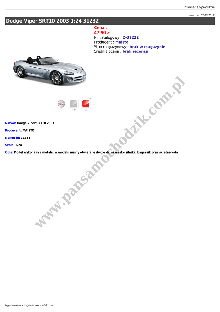 Informacje o produkcie Utworzono 02-03-2017 Dodge Viper SRT10 2003 1:24 31232 Cena : 47,90 zł dz ik .c om .p l Nr katalogowy : Z-31232 Producent : Maisto Stan magazynowy : brak w magazynie Średnia ocena : brak recenzji Nazwa: Dodge Viper SRT10 2003 Producent: MAISTO ho Numer id: 31232 Skala: 1/24 w w w .p an sa m oc Opis: Model wykonany z metalu, w modelu mamy otwierane dwoje drzwi maske silnika, bagażnik oraz skrętne koła Wygenerowano w programie www.oscGold.com