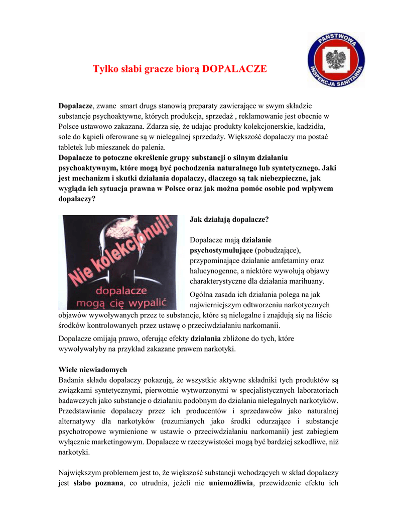 Tylko słabi gracze biorą DOPALACZE Dopalacze, zwane smart drugs stanowią preparaty zawierające w swym składzie substancje psychoaktywne, których produkcja, sprzedaż , reklamowanie jest obecnie w Polsce ustawowo zakazana. Zdarza się, że udając produkty kolekcjonerskie, kadzidła, sole do kąpieli oferowane są w nielegalnej sprzedaży. Większość dopalaczy ma postać tabletek lub mieszanek do palenia. Dopalacze to potoczne określenie grupy substancji o silnym działaniu psychoaktywnym, które mogą być pochodzenia naturalnego lub syntetycznego. Jaki jest mechanizm i skutki działania dopalaczy, dlaczego są tak niebezpieczne, jak wygląda ich sytuacja prawna w Polsce oraz jak można pomóc osobie pod wpływem dopalaczy? Jak działają dopalacze? Dopalacze mają działanie psychostymulujące (pobudzające), przypominające działanie amfetaminy oraz halucynogenne, a niektóre wywołują objawy charakterystyczne dla działania marihuany. Ogólna zasada ich działania polega na jak najwierniejszym odtworzeniu narkotycznych objawów wywoływanych przez te substancje, które są nielegalne i znajdują się na liście środków kontrolowanych przez ustawę o przeciwdziałaniu narkomanii. Dopalacze omijają prawo, oferując efekty działania zbliżone do tych, które wywoływałyby na przykład zakazane prawem narkotyki. Wiele niewiadomych Badania składu dopalaczy pokazują, że wszystkie aktywne składniki tych produktów są związkami syntetycznymi, pierwotnie wytworzonymi w specjalistycznych laboratoriach badawczych jako substancje o działaniu podobnym do działania nielegalnych narkotyków. Przedstawianie dopalaczy przez ich producentów i sprzedawców jako naturalnej alternatywy dla narkotyków (rozumianych jako środki odurzające i substancje psychotropowe wymienione w ustawie o przeciwdziałaniu narkomanii) jest zabiegiem wyłącznie marketingowym. Dopalacze w rzeczywistości mogą być bardziej szkodliwe, niż narkotyki. Największym problemem jest to, że większość substancji wchodzących w skład dopalaczy jest słabo poznana, co utrudnia, jeżeli nie uniemożliwia, przewidzenie efektu ich działania. W rezultacie prowadzi to do obniżenia skuteczności działań ratujących zdrowie lub życie. Dodatkowo opisy zawartości w poszczególnych produktach często nie stanowią rzetelnej informacji. Duża ilość niewiadomych służy oczywiście jak najlepszemu zamaskowaniu substancji tak, aby nie doprowadzić do ich szybkiej delegalizacji. Osoby sięgające po dopalacze wzmacniają ich efekt, niejednokrotnie spożywając jednocześnie inne używki, jak niektóre rodzaje narkotyków czy alkohol. Zagrożenie dla młodych Dopalacze same w sobie prowadzą do lub ułatwiają rozwój uzależnienia. Dodatkowo są szczególnie popularne wśród nastolatków, czyli grupy społecznej, która bardzo łatwo popada w różne nałogi. Skutki działania dopalaczy prowadzą do zaburzeń w prawidłowym działaniu najistotniejszych funkcji mózgowych odpowiedzialnych za: pamięć, uczenie się, układ nagrody sterujący zachowaniem i motywacją. Pamiętaj!!! Podobnie jak większość ekspertów, odradzamy jakichkolwiek eksperymentów z środkami psychoaktywnymi włączając w to tzw. "dopalacze". Są to substancje zmieniające świadomość i w określonych sytuacjach mogą być niebezpieczne dla zdrowia i życia.