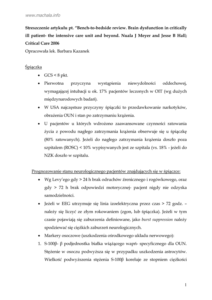 www.machala.info Streszczenie artykułu pt. “Bench-to-bedside review. Brain dysfunction in critically ill patient- the intensive care unit and beyond. Nuala J Meyer and Jesse B Hall; Critical Care 2006 Opracowała lek. Barbara Kazanek Śpiączka GCS < 8 pkt. Pierwotna przyczyna wystąpienia niewydolności oddechowej, wymagającej intubacji u ok. 17% pacjentów leczonych w OIT (wg dużych międzynarodowych badań). W USA najczęstsze przyczyny śpiączki to przedawkowanie narkotyków, obrażenia OUN i stan po zatrzymaniu krążenia. U pacjentów u których wdrożono zaawansowane czynności ratowania życia z powodu nagłego zatrzymania krążenia obserwuje się u śpiączkę (80% ratowanych). Jeżeli do nagłego zatrzymania krążenia doszło poza szpitalem (ROSC) < 10% wypisywanych jest ze szpitala (vs. 18% - jeżeli do NZK doszło w szpitalu. Prognozowanie stanu neurologicznego pacjentów znajdujących się w śpiączce: Wg Levy’ego gdy > 24 h brak odruchów źrenicznego i rogówkowego, oraz gdy > 72 h brak odpowiedzi motorycznej- pacjent nigdy nie odzyska samodzielności. Jeżeli w EEG utrzymuje się linia izoelektryczna przez czas > 72 godz. – należy się liczyć ze złym rokowaniem (zgon, lub śpiączka). Jeżeli w tym czasie pojawiają się zaburzenia definiowane, jako burst suppression należy spodziewać się ciężkich zaburzeń neurologicznych. Markery osoczowe (uszkodzenia ośrodkowego układu nerwowego): 1. S-100β- β podjednostka białka wiążącego wapń- specyficznego dla OUN. Stężenie w osoczu podwyższa się w przypadku uszkodzenia astrocytów. Wielkość podwyższenia stężenia S-100β koreluje ze stopniem ciężkości 1 www.machala.info uszkodzenia OUN. Nie ustalono wartości prognostycznych pomocnych przy określaniu wyniku neurologicznego. 2. NSE- neuronospecyficzna enolaza- stężenie osoczowe bardzo dobrze koreluje z ciężkością uszkodzeń OUN. Jeżeli po 24 godz. od zatrzymania krążenia stężenie NSE > 33 µg/ l należy przewidywać złe rokowanie (zgon lub stan śpiączkowy). SSEP- somatosensoryczne potencjały wywołane pozwalają na dokładne określenie uszkodzeń anatomicznych. Wynik nie jest zakłócony znieczuleniem ogólnym; nie wpływa na jego wynik (interpretację) sen barbituranowy. W przypadku stwierdzenia obustronnego braku sygnału N20 (z nerwu pośrodkowego)- w najlepszym przypadku pacjent będzie w stanie przetrwałego stanu wegetatywnego. Leczenie śpiączki Hipotermia 32-34°C przez 24 h - czas ochładzania 8h (badania europejskie), lub 12 h (badania australijskie). W grupie badanej poprawa stanu neurologicznego (w obu badaniach) i przeżywalności pacjentów po 6 miesiącach- w badaniu europejskim. Stan majaczeniowy Stwierdzany u 70-80% pacjentów wentylowanych mechanicznie. 3 formy kliniczne delirium: Hiperaktywna – 2% przypadków- przebiegająca gwałtownie z pobudzeniem psychoruchowym. Hipoaktywna - 45% - pacjenci „wycofani”, spokojni, depresyjni, nie sprawiający problemów personelowi. Postać mieszana – najczęstsza - z okresami pobudzeń i wyciszenia. Czynniki ryzyka: Wiek. Wentylacja mechaniczna. Rasa. 2 www.machala.info Deprawacja snu. Brak dostępu do aparatu słuchowego i okularów. Farmakoterapia - zwłaszcza benzodwuazepiny. Śmiertelność: Stan majaczeniowy powinien być traktowany równie poważnie co wstrząs septyczny czy ARDS, ponieważ jest klinicznym wykładnikiem ciężkich zaburzeń czynności OUN. Śmiertelność po 6 miesiącach wśród sztucznie wentylowanych pacjentów z zespołem majaczeniowym była ponad dwukrotnie większa niż u pacjentów, u których stan majaczeniowy nie wystąpił. Potencjalne mechanizmy delirium: Niedokrwienie OUN. Teoria zapalna - dochodzi do uruchomienia kaskady cytokin, a następnie do nacieku zapalnego i w konsekwencji- uszkodzenia OUN. Zaburzenia w układzie neurotransmiterów- ACh, GABA, Norepinefryna, Glutamina, 5-HT, Dopamina. Zapobieganie i leczenie: Minimalizacja czynników ryzyka: aktywizacja chorych, zapobieganie deprywacji snu, unikanie leków psychoaktywnych, udostępnienie chorym okularów i aparatów słuchowych, wsparcie rodziny, zapewnienie pacjentowi komfortowej pozycji, usuwanie zbędnych cewników. Metody alternatywne- masaż pleców, muzykoterapia. Farmakoterapia zarezerwowana dla pacjentów pobudzonych z tendencją do samouszkodzenia (haloperidol, resperidon, benzodwuazepiny, antydepresanty). Zaburzenia poznawcze i zespół stresu pourazowego 50% pacjentów wentylowanych mechanicznie przy wypisie z OIT prezentuje zaburzenia neuropsychologiczne. 3 www.machala.info 30% pacjentów po 6 miesiącach ma utrzymujące się zaburzenia poznawcze. Zespół stresu pourazowego - natrętne wspomnienia, objawy wycofania, bezsenność; objawy utrzymujące się 1-3 miesiące od traumatycznego wydarzenia - opisywane u 27% pacjentów wyleczonych z ARDS, a także u rodzin pacjentów leczonych w OIT. Pacjenci, u których wystąpił stan majaczeniowy mieli ok. 9x większe prawdopodobieństwo wystąpienia zaburzeń poznawczych i zespołu stresu pourazowego przy wypisie ze szpitala, prognozowanie długoterminowe jest niejednoznaczne Pacjenci poddani sedacji - u których sedacja w ciągu dnia była wstrzymywana - mieli tendencję do mniejszego ryzyka wystąpienia zespołu stresu pourazowego, byli lepiej przygotowani psychologicznie do akceptacji choroby, oraz krócej wymagali wentylacji mechanicznej Leczenie - terapia behawioralna i selektywne inhibitory receptora 5-HT. 4