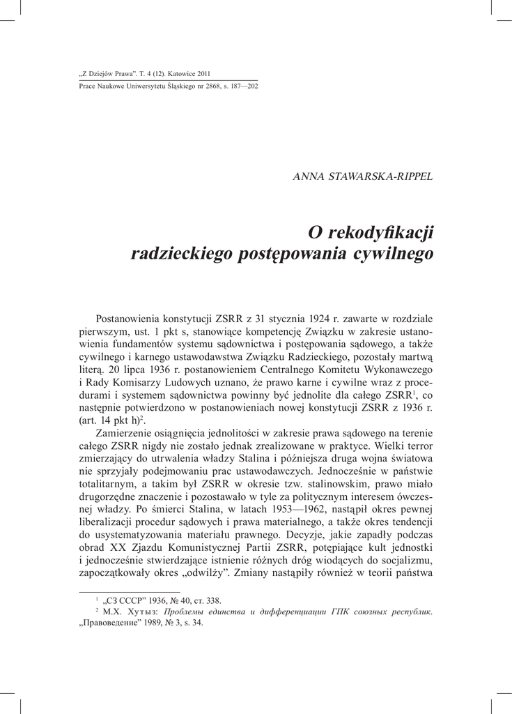 „Z Dziejów Prawa”. T. 4 (12). Katowice 2011 Prace Naukowe Uniwersytetu Śląskiego nr 2868, s. 187—202 ANNA STAWARSKA-RIPPEL O rekodyfikacji radzieckiego postępowania cywilnego Postanowienia konstytucji ZSRR z 31 stycznia 1924 r. zawarte w rozdziale pierwszym, ust. 1 pkt s, stanowiące kompetencję Związku w zakresie ustanowienia fundamentów systemu sądownictwa i postępowania sądowego, a także cywilnego i karnego ustawodawstwa Związku Radzieckiego, pozostały martwą literą. 20 lipca 1936 r. postanowieniem Centralnego Komitetu Wykonawczego i Rady Komisarzy Ludowych uznano, że prawo karne i cywilne wraz z procedurami i systemem sądownictwa powinny być jednolite dla całego ZSRR, co następnie potwierdzono w postanowieniach nowej konstytucji ZSRR z 1936 r. (art. 14 pkt h). Zamierzenie osiągnięcia jednolitości w zakresie prawa sądowego na terenie całego ZSRR nigdy nie zostało jednak zrealizowane w praktyce. Wielki terror zmierzający do utrwalenia władzy Stalina i późniejsza druga wojna światowa nie sprzyjały podejmowaniu prac ustawodawczych. Jednocześnie w państwie totalitarnym, a takim był ZSRR w okresie tzw. stalinowskim, prawo miało drugorzędne znaczenie i pozostawało w tyle za politycznym interesem ówczesnej władzy. Po śmierci Stalina, w latach 1953—1962, nastąpił okres pewnej liberalizacji procedur sądowych i prawa materialnego, a także okres tendencji do usystematyzowania materiału prawnego. Decyzje, jakie zapadły podczas obrad XX Zjazdu Komunistycznej Partii ZSRR, potępiające kult jednostki i jednocześnie stwierdzające istnienie różnych dróg wiodących do socjalizmu, zapoczątkowały okres „odwilży”. Zmiany nastąpiły również w teorii państwa „СЗ СССР” 1936, № 40, ст. 338. М.Х. Ху т ы з: Проблемы единства и дифференциации ГПК союзных республик. „Правоведение” 1989, № 3, s. 34. 188 Anna Stawarska-Rippel i prawa, która eliminowała niektóre stalinowskie modyfikacje leninowskiej doktryny. Dnia 11 lutego 1957 r. postanowieniem Rady Najwyższej ZSRR ustanowiono kompetencję Związku Socjalistycznych Republik Radzieckich do ustalenia zasad ustawodawstwa o ustroju sądów republik związkowych, prawa cywilnego, karnego i procesowego. Postanowienie Rady Najwyższej ZSRR dało podstawę do przeprowadzenia rekodyfikacji radzieckiego prawa na podstawie ustanowionych wcześniej zasad ustawodawstwa. Zasady ustawodawstwa w zakresie postępowania w sprawach cywilnych zostały uchwalone 8 grudnia 1961 r. Zasady postępowania cywilnego ZSRR i republik związkowych składały się z 64 artykułów ułożonych w sześć rozdziałów. Rozdział pierwszy zawierał postanowienia ogólne: przepisy jurysdykcyjne, dotyczące statusu sędziego, składu sądu, wszczęcia postępowania, udziału prokuratora, dowodów, kosztów procesowych. Rozdział drugi Zasad dotyczył uczestników procesu, czyli stron, prokuratora i osób trzecich, określając ich prawa i obowiązki. Rozdział trzeci uregulował zasady postępowania cywilnego w pierwszej instancji oraz zabezpieczenie powództwa i prawomocność orzeczeń, zawieszenie postępowania i jego umorzenie. Rozdział czwarty Zasad regulował postępowanie kasacyjne i postępowanie w trybie nadzoru. Rozdział piąty dotyczył wykonania orzeczeń sądu. Rozdział szósty stanowił nowość względem obowiązującego k.p.c. z 1923 r., regulując cywilne prawa procesowe obywateli innych państw i bezpaństwowców oraz powództw cywilnych przeciwko innym państwom, sądowe polecenia i orzeczenia obcych sądów i międzynarodowe umowy dotyczące procedury cywilnej. W latach 1964—1965 wszystkie republiki ustanowiły nowe kodeksy procedury cywilnej oparte na Zasadach postępowania cywilnego ZSRR i republik związkowych. H. B e r m a n: Justice in the U.S.S.R. An Interpretation of Soviet Law. 5th Ed. Harvard University Press 1978, s. 69—70. Об отнесении к ведению союзных республик законодательства об устройстве судов союзных республик, принятия гражданского, уголовного и процессуального кодексов. „Ведомости Верховного Совета СССР” 1957, № 4, ст. 63; „Известия”, 12 февраля 1957 г. Об утверждении Основ гражданского cyдопроизводства Союза ССР и союзных республик от 8 декабря 1961 года. „Ведомости Верховного Совета СССР” 1961, № 50, ст. 525. Zob. też Soviet Civil Legislation and Procedure. Official Texts and Commentaries. Прев. Y. S d o b n i kov. Москва [b.d.w.]; Я.Ф. Ф а рх тд и н о в: Ведомственные нормативные акты — источники гражданского процессуального права. „Правоведение” 1982, № 6, s. 85; W.E. B u t le r: Soviet Law. Londyn 1983, s. 293. Об утверждении Основ гражданского cyдопроизводства…; Podstawy uzupełniono 6 razy: „Ведомости ВС СССР” 1972, № 33, ст. 289; „Ведомости ВС СССР” 1977, № 21, ст. 313; „Ведомости ВС СССР” 1979, № 42, ст. 697; „Ведомости ВС СССР” 1985, № 6, ст. 101; „Ведомости ВС СССР” 1987, № 50, ст. 806; „Ведомости ВС СССР” 1988, № 2, ст. 21. Zmiany polegały na rozwinięciu regulacji Zasad i wzmocnieniu socjalistycznej praworządności. I tak, 1 stycznia 1964 r. wszedł w życie kodeks procedury cywilnej Republiki Uzbeckiej i Republiki Ukraińskiej; 1 czerwca — k.p.c. Republiki Łotewskiej; 1 lipca — kodeksy procedury O rekodyfikacji radzieckiego postępowania cywilnego 189 Nowy kodeks postępowa
