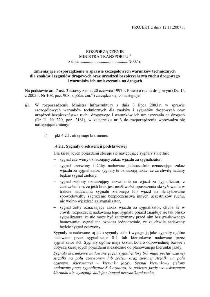 PROJEKT z dnia 12.11.2007 r. ROZPORZĄDZENIE MINISTRA TRANSPORTU1) z dnia .............................................. 2007 r. zmieniające rozporządzenie w sprawie szczegółowych warunków technicznych dla znaków i sygnałów drogowych oraz urządzeń bezpieczeństwa ruchu drogowego i warunków ich umieszczania na drogach Na podstawie art. 7 ust. 3 ustawy z dnia 20 czerwca 1997 r. Prawo o ruchu drogowym (Dz. U. z 2005 r. Nr 108, poz. 908, z późn. zm.2)) zarządza się, co następuje: §1. W rozporządzeniu Ministra Infrastruktury z dnia 3 lipca 2003 r. w sprawie szczegółowych warunków technicznych dla znaków i sygnałów drogowych oraz urządzeń bezpieczeństwa ruchu drogowego i warunków ich umieszczania na drogach (Dz. U. Nr 220, poz. 2181), w załączniku nr 3 do rozporządzenia wprowadza się następujące zmiany: 1) pkt 4.2.1. otrzymuje brzmienie: „4.2.1. Sygnały o sekwencji podstawowej Dla kierujących pojazdami stosuje się następujące sygnały świetlne: − sygnał czerwony oznaczający zakaz wjazdu za sygnalizator, − sygnał czerwony i żółty nadawane jednocześnie oznaczające zakaz wjazdu za sygnalizator; sygnały te oznaczają także, że za chwilę nadany będzie sygnał zielony, − sygnał zielony oznaczający zezwolenie na wjazd za sygnalizator, z zastrzeżeniem, że jeśli brak jest możliwości opuszczenia skrzyżowania w trakcie nadawania sygnału zielonego lub wjazd na skrzyżowanie spowodowałby zagrożenie bezpieczeństwa innych uczestników ruchu, nie wolno wjeżdżać za sygnalizator, − sygnał żółty oznaczający zakaz wjazdu za sygnalizator, chyba że w chwili rozpoczęcia nadawania tego sygnału pojazd znajduje się tak blisko sygnalizatora, że nie może być zatrzymany przed nim bez gwałtownego hamowania; sygnał ten oznacza jednocześnie, że za chwilę nadawany będzie sygnał czerwony. Sygnały te nadawane są jako sygnały stałe i występują jako sygnały ogólne nadawane przez sygnalizator S-1 lub kierunkowe nadawane przez sygnalizator S-3. Sygnały ogólne mają kształt koła o odpowiedniej barwie i dotyczą kierujących pojazdami niezależnie od planowanego kierunku jazdy. Sygnały kierunkowe nadawane przez sygnalizatory S-3 mają postać czarnej strzałki na polu czerwonym lub żółtym oraz zielonej strzałki na polu czarnym, skierowanej w kierunku jazdy. Sygnał kierunkowy zielony nadawany przez sygnalizator S-3 oznacza, że podczas jazdy we wskazanym kierunku nie występuje kolizja z innymi uczestnikami ruchu. 2 Dopuszcza się zastosowanie na jednym wlocie sygnału ogólnego i kierunkowego wyłącznie w przypadku, gdy sygnał kierunkowy nie wskazuje kierunku tylko na wprost. Nie dopuszcza się stosowania na jednym wlocie sygnałów ogólnych należących do różnych grup sygnałowych. Sygnały dla kierujących pojazdami nadawane są w następującej sekwencji podstawowej: czerwony → czerwony i żółty → zielony →żółty → czerwony Sygnały o sekwencji podstawowej nadawane są przez sygnalizatory trójkomorowe o układzie komór jak pokazano na rysunkach: 4.2.1 – sygnały ogólne oraz 4.2.2 do 4.2.8 – sygnały kierunkowe. Jeżeli przy zastosowaniu sygnału kierunkowego dla skręcających w lewo możliwe jest bezkolizyjne zawracanie z lewego skrajnego pasa ruchu, na sygnalizatorze kierunkowym wskazuje się kierunek w lewo i do zawracania zgodnie z opisem do rys. 4.2.5. Jeżeli pas do jazdy w prawo lub w lewo jest ukierunkowany pod kątem mniejszym niż 50°, strzałkę należy skierować w górę pod kątem 45°. Rys. 4.2.1. Sygnalizator ogólny S-1 nadający podstawową sekwencję sygnałów Rys. 4.2.2. Sygnalizator kierunkowy S-3 z sygnałami kierunkowymi na wprost 3 Rys. 4.2.3. Sygnalizator kierunkowy S-3 z sygnałami kierunkowymi w lewo Rys. 4.2.4. Sygnalizator kierunkowy S-3 z sygnałami kierunkowymi w prawo Rys. 4.2.5. Sygnalizator kierunkowy S-3 z sygnałami kierunkowymi na wprost i w lewo. Symbole strzałek obrócone o 90° w lewo oznaczają sygnały kierunkowe w lewo i do zawracania 4 Rys. 4.2.6. Sygnalizator kierunkowy S-3 z sygnałami kierunkowymi na wprost i w prawo Rys. 4.2.7. Sygnalizator kierunkowy S-3 z sygnałami kierunkowymi w lewo i w prawo Rys. 4.2.8. Sygnalizator kierunkowy S-3 z sygnałami kierunkowymi do zawracania” 5 2) pkt 4.2.2. otrzymuje brzmienie: „4.2.2. Sygnał dopuszczający skręcanie w kierunku wskazanym strzałką Oprócz sygnałów ogólnych oraz kierunkowych, na skrzyżowaniu stosuje się sygnał dopuszczający skręcanie w kierunku wskazanym strzałką w postaci sygnału czerwonego ogólnego i zielonej strzałki skierowanej w lewo lub w prawo nadawany przez sygnalizator S-2 (rys. 4.2.9). Sygnał ten zezwala na ruch w najbliższą drogę na skrzyżowaniu w kierunku wskazanym strzałką, po zatrzymaniu się przed sygnalizatorem. Sygnał dopuszczający skręcanie w kierunku wskazanym strzałką może być nadawany jednokrotnie lub wielokrotnie podczas nadawania sygnału czerwonego, przy czym nie dopuszcza się nadawania go w trakcie nadawania sygnału żółtego. Rys. 4.2.9. Sygnalizatory S-2 nadające sygnał dopuszczający skręcanie w kierunku wskazanym strzałką W przypadkach uzasadnionych natężeniem i kierunkowym rozkładem ruchu, gdy pas przeznaczony dla skręcających w prawo lub w lewo jest wydzielony wysepką w krawężnikach lub jest jedynym pasem ruchu na wlocie, można zamiast pełnego sygnału trójbarwnego zastosować sygnał 6 dopuszczający skręcanie w kierunku wskazanym strzałką, nadawany w sekwencji: czerwony → czerwony z zieloną strzałką → czerwony 3) pkt 6.2.1.2 otrzymuje brzmienie: „6.2.1.2. Stosowanie sygnału ogólnego i sygnału kierunkowego Rodzaje stosowanych sygnałów (ogólne lub kierunkowe) dla kierujących pojazdami zależą od geometrii skrzyżowania, natężeń poszczególnych strumieni ruchu i przyjętej metody sterowania. Zaleca się, aby unikać wspólnego nadawania sygnału zielonego dla strumieni kolizyjnych o dopus