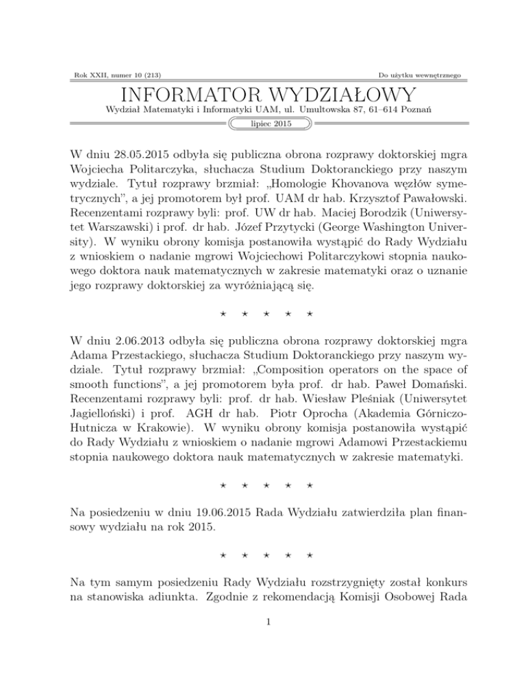 Rok XXII, numer 10 (213) Do użytku wewnętrznego INFORMATOR WYDZIAŁOWY Wydział Matematyki i Informatyki UAM, ul. Umultowska 87, 61–614 Poznań lipiec 2015 W dniu 28.05.2015 odbyła się publiczna obrona rozprawy doktorskiej mgra Wojciecha Politarczyka, słuchacza Studium Doktoranckiego przy naszym wydziale. Tytuł rozprawy brzmiał: „Homologie Khovanova węzłów symetrycznych”, a jej promotorem był prof. UAM dr hab. Krzysztof Pawałowski. Recenzentami rozprawy byli: prof. UW dr hab. Maciej Borodzik (Uniwersytet Warszawski) i prof. dr hab. Józef Przytycki (George Washington University). W wyniku obrony komisja postanowiła wystąpić do Rady Wydziału z wnioskiem o nadanie mgrowi Wojciechowi Politarczykowi stopnia naukowego doktora nauk matematycznych w zakresie matematyki oraz o uznanie jego rozprawy doktorskiej za wyróżniającą się. ? ? ? ? ? W dniu 2.06.2013 odbyła się publiczna obrona rozprawy doktorskiej mgra Adama Przestackiego, słuchacza Studium Doktoranckiego przy naszym wydziale. Tytuł rozprawy brzmiał: „Composition operators on the space of smooth functions”, a jej promotorem była prof. dr hab. Paweł Domański. Recenzentami rozprawy byli: prof. dr hab. Wiesław Pleśniak (Uniwersytet Jagielloński) i prof. AGH dr hab. Piotr Oprocha (Akademia GórniczoHutnicza w Krakowie). W wyniku obrony komisja postanowiła wystąpić do Rady Wydziału z wnioskiem o nadanie mgrowi Adamowi Przestackiemu stopnia naukowego doktora nauk matematycznych w zakresie matematyki. ? ? ? ? ? Na posiedzeniu w dniu 19.06.2015 Rada Wydziału zatwierdziła plan finansowy wydziału na rok 2015. ? ? ? ? ? Na tym samym posiedzeniu Rady Wydziału rozstrzygnięty został konkurs na stanowiska adiunkta. Zgodnie z rekomendacją Komisji Osobowej Rada 1 postanowiła o zatrudnieniu na stanowisku adiunkta na okres 4 lat dra Wojciecha Politarczyka, dra Adama Przestackiego i dra Wojciecha Pałubickiego oraz na okres 1 roku dra Marcina Witkowskiego. ? ? ? ? ? Rada Wydziału zaopiniowała negatywnie rozwiązanie stosunku pracy dr Małgorzaty Bednarskiej-Bzdęgi (Zakład Matematyki Dyskretnej) na stanowisku adiunkta w związku z nieuzyskaniem stopnia doktora habilitowanego. ? ? ? ? ? Na tym samym posiedzeniu Rada Wydziału zaopiniowała pozytywnie następujące kandydatury do nagrody JM Rektora UAM: • nagrody naukowe: 1. prof. dr hab. Ryszard Doman (za uzyskanie tytułu naukowego) – nagroda I stopnia, 2. prof. dr hab. Tomasz Schoen (za uzyskanie tytułu naukowego) – nagroda I stopnia, 3. prof. dr hab. Leszek Skrzypczak (za uzyskanie tytułu naukowego) – nagroda I stopnia, 4. prof. dr hab. Wiesław Śliwa (za uzyskanie tytułu naukowego) – nagroda I stopnia, 5. dr hab. Aldona Dutkiewicz (za uzyskanie stopnia doktora habilitowanego oraz za osiągnięcie dydaktyczne, tj. koordynację i nadzór nad utworzeniem nowego kierunku studiów „Nauczanie matematyki i informatyki”) – nagroda II stopnia , 6. dr hab. Maciej Radziejewski (za uzyskanie stopnia doktora habilitowanego) – nagroda II stopnia, • nagroda za efektywność naukową: prof. dr hab. Mieczysław Mastyło (nagroda I stopnia za współczynnik efektywności – 45 – uzyskany dzięki publikacji dwóch prac w czasopiśmie „Nonlinear Analysis: Theory, Methods & Applications”), • nagrody dydaktyczne: 1. dr hab. Michał Jasiczak (za koordynację i nadzór nad utworzeniem studiów w języku angielskim na kierunku matematyka oraz 2 za przygotowanie modułu „Matematyka i elementy informatyki” będącego częścią składową kursu dokształcającego AMU PreTech, czyli Adam Mickiewicz University in Poznań Pre-Engineering Preparatory Course) – nagroda II stopnia, 2. dr Krzysztof Dyczkowski (za kierowanie Laboratorium Sieci i Systemów Komputerowych, aktywne wspieranie działalności Koła Robotyki, współorganizowanie hackhaton „BrainCode Mobi 2” (zawody programistów) oraz konferencji IDEA 2014, opiekę nad Microsoft IT Academy oraz IBM Academic Initiative, organizację i pełnienie funkcji opiekuna praktyk studenckich w wydziałowych laboratoriach komputerowych i współpracę z firmą IBM w przygotowywaniu wirtualnych praktyk studenckich, wkład w opracowanie koncepcji regulaminu projektu inżynierskiego i pracy inżynierskiej) – nagroda III stopnia. ? ? ? ? ? Rada Wydziału na posiedzeniu w dniu 19.06.2015 przyjęła uchwałę w sprawie utworzenia studiów podyplomowych z technologii mobilnych oraz z przetwarzania danych (Big Data), jak również w sprawie siatek godzin tych studiów. ? ? ? ? ? Rada Wydziału zaopiniowała pozytywnie wniosek prof. dra hab. Andrzeja Rucińskiego (Zakład Matematyki Dyskretnej) o udzielenie mu urlopu naukowego w okresie 1–31.10.2015 (płatny urlop naukowy) oraz 1.11.2015– 15.06.2016 (bezpłatny urlop naukowy). W tym okresie prof. Ruciński będzie prowadził badania naukowe w Departamencie Matematyki i Informatyki Uniwersytetu Emory w Atlancie (USA). ? ? ? ? ? Rada Wydziału zaopiniowała pozytywnie wniosek dra Marka Kaluby (Zakład Geometrii i Topologii) o bezpłatny urlop naukowy w okresie 1.10.2015– 30.09.2016. Dr Kaluba będzie w tym czasie pracował na stanowisku adiunkta w Instytucie Matematycznym Polskiej Akademii Nauk w Warszawie. ? ? ? 3 ? ? W dniu 19.06.2015 Rada Wydziału wszczęła przewód doktorski mgra Patryka Żywicy, słuchacza Studium Doktoranckiego przy naszym wydziale. Rada zatwierdziła temat rozprawy doktorskiej, który brzmi: „Miary podobieństwa przedziałowych zbiorów rozmytych w klasyfikacji danych niepewnych. Zastosowania w diagnostyce guzów jajnika”. Rada powołała na promotora prof. UAM dra hab. Macieja Wygralaka (Zakład Metod Przetwarzania Informacji Nieprecyzyjnej), a na promotora pomocniczego dr Annę Stachowiak (tenże zakład). Rada zatwierdziła również następujący zakres egzaminów doktorskich: • dyscyplina podstawowa: analiza danych i sztuczna inteligencja, • dyscyplina dodatkowa: filozofia matematyki, • język obcy: angi