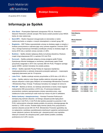 Biuletyn Dzienny 23 grudnia 2015 | 6 stron Informacje ze Spółek Alior Bank – Przemysław Dąbrowski (wiceprezes PZU ds. finansów) i Sławomir Niemerek (członek zarządu PZU Życie) zostali powołani przez NWZA banku do rady nadzorczej. Rafał Materka Bank BPH – Roshni Haywood zrezygnowała ze stanowiska w radzie nadzorczej banku w związku z nowymi obowiązkami w ramach grupy GE. Maciej Kałowski Analityk Analityk Bogdanka – EDF Paliwa wypowiedziało umowę na dostawę węgla w związku z brakiem porozumienia w zakresie jego ceny (umowa wygaśnie z końcem 2016 roku). Energa Dystrybucja Ostrołęka przedłużyła umowę na dostawę węgla do końca 2016 roku a wartość umowy wzrosła o 4,36%. Budimex – Spółka złożyła najlepszą ofertę na budowę obwodnicy Olsztyna (część drogi ekspresowa S51) o wartości 913 mln PLN. Eurocash – Spółka podpisała wstępną umowę przejęcia spółki Polska Dystrybucja Alkoholi działającej w centralnej i południowej części Polski (przychody osiągnięte w 2014 roku wyniosły 268 mln PLN). Przejęcie wymaga zgody UOKiK; wartość transakcji nie została podana. GPW WIG WIG20 mWIG40 sWIG80 46,421 1,874 3,535 12,749 międzyoperatorskiej w zakresie doręczania przesyłek sądowych – rozpoczęcie negocjacji planowane jest do 15 stycznia. Labo Print – Spółka oczekuje wzrostu przychodów w 2016 roku o 20-30% r/r. Lotos – Spółka zależna Lotos Norge (spółka zależna) otrzymało zgodę na nabycie aktywów w złożu gazu Sleipner od norweskiego Ministerstwa Finansów i Ministerstwa Ropy i Energii. Finalizacja transakcji ma nastąpić do końca br. PKO BP – Bankier.pl donosi, że redukcja zatrudnienia w banku może sięgnąć maksymalnie 836 pracowników w 2016 roku. W pierwszej kolejności pracownikom zostanie zaproponowana zmiana warunków pracy, więc ostateczna liczba zwolnionych osób może być niższa niż jest to zakładane. 1M YTD -6.1% -9.7% -7.3% -19.1% -3.2% 1.5% -4.5% 5.3% RYNKI WSCHODZĄCE MSCI BUX RTS ISE 120.1 23,456 762 73,102 InPost – Spółka zaprosiła Pocztę Polską do negocjacji współpracy 1D 0.4% 0.4% 0.2% 0.7% 1D 1M YTD -0.1% -6.8% 2.9% -1.2% 1.4% 41.0% 0.5% -14.2% -3.6% -0.3% -9.4% -14.7% RYNKI ROZWINIĘTE DJIA S&P500 NASDAQ DAX FTSE100 CAC40 17,417 2,039 5,001 10,489 6,083 4,568 1D 1.0% 0.9% 0.6% -0.1% 0.8% 0.1% 1M -2.3% -2.4% -2.0% -5.7% -4.0% -7.0% YTD -2.3% -1.0% 5.6% 7.0% -7.4% 6.9% RYNEK PIENIĘŻNY I WALUTOWY WIBOR O/N WIBOR 1M WIBOR 1Y Stopa REPO 1.62% 1.66% 1.79% 1.50% USDPLN EURPLN CHFPLN EURUSD 3.8788 4.2490 3.9311 1.0955 -0.5% -0.1% 0.1% 0.4% Sektor bankowy i ubezpieczeniowy – Komisja Finansów Publicznych obniżyła próg wartości aktywów, od którego ubezpieczyciele będą płacić podatek do 2 mld PLN z 4 mld PLN (dla banków pozostał na poziomie 4 mld PLN) i jednocześnie zrównała stawkę podatku do poziomu obowiązującego dla banków tj. 0.39% rocznie. Podatek będą również płaciły firmy pożyczkowe o wartości aktywów ponad 200 mln PLN. Ministerstwo Finansów zgodziłoby się na wyłączenie z podstawy opodatkowania skarbowych papierów wartościowych (nowe założenie zarówno dla banków jak i ubezpieczycieli) oraz kapitałów własnych (nowość dla ubezpieczycieli), jeżeli stawka podatku zostałaby podniesiona do 0,44% rocznie. Biuro Analiz DMBH Biuletyn dzienny 23 grudnia 2015 Selvita – Spółka podpisała umowę z Merckiem w zakresie współpracy w projekcie onkologicznym. Spółka otrzyma płatności za osiągnięcie kamieni milowych – całkowita wartość płatności może wynieść 16,5 mln EUR. Sygnity – Spółka podpisała z Energa Informatyka i Technologie umowę dostarczenia oprogramowania o wartości 5,48 mln EUR (23,2 mln PLN). Wynagrodzenie z tytułu umowy będzie płatne z góry za rok w trzech równych częściach, a ostatnia płatność nastąpi 22 grudnia 2017 roku. Kalendarium Spółek AlejaSamochodowa.pl – NWZA w sprawie powołania członków rady nadzorczej nowej kadencji oraz zmiany § 9 ust. 1 Statutu. Alterco – Publikacja wyników za 2014 rok. Call Center Tools – NWZA w sprawie powołania członków rady nadzorczej oraz zmiany statutu. Czerwona Torebka – NWZA w sprawie zmiany statutu oraz powołania członka rady nadzorczej. InPost – NWZA w sprawie zmian w składzie rady nadzorczej oraz ustalenia wynagrodzenia członków rady nadzorczej. Integer.pl – NWZA w sprawie zmian w składzie rady nadzorczej oraz ustalenia wynagrodzenia członków rady nadzorczej. MPL Verbum – Wypłata dywidendy (0,05 PLN na akcję). Projprzem – NWZA w sprawie zmian w składzie rady nadzorczej obecnej kadencji. Ronson Europe – Dzień przyznania prawa do dywidendy (0,04 PLN na akcję). Ropczyce – NWZA w sprawie wyrażenia zgody na ustanowienie odrębnej własności lokalu i zbycie nieruchomości spółki. Your Image – NWZA w sprawie podwyższenia kapitału zakładowego poprzez emisję akcji serii G w trybie subskrypcji prywatnej oraz zmiany statutu. Kalendarium Makro GUS – Bieżący wskaźnik ufności konsumenckiej w grudniu (-3,9 w listopadzie). GUS – Wyprzedzający wskaźnik ufności konsumenckiej w grudniu (-8,3 w listopadzie). GUS – Stopa bezrobocia w listopadzie (oczekiwane 9,7% w stosunku do 9,6% w październiku). Biuletyn dzienny 23 grudnia 2015 Wskaźniki Spółek (1) C/Z Spółka C/WK EV/EBITDA Kurs 2014 2015 2016 2014 2015 2016 2014 2015 2016 34.09 4.2 5.6 6.0 0.5 0.4 0.4 2.4 2.9 2.9 BUDIMEX 192.00 26.8 21.1 18.7 9.4 8.3 7.6 13.2 11.3 9.1 ELEKTROBUDOWA 133.00 22.9 12.9 12.3 1.9 1.6 1.5 12.4 7.8 6.8 TRAKCJA PRKiI 12.75 8.2 12.4 16.6 1.0 0.9 0.9 6.7 7.1 7.9 ELECTRICA 11.94 11.5 11.9 12.6 0.8 0.7 0.7 4.5 3.4 3.9 ENEA 11.37 5.5 5.3 6.6 0.4 0.4 0.4 3.3 4.9 5.4 ENERGA 12.58 5.3 6.0 7.5 0.6 0.6 0.6 4.0 4.3 5.0 EUROCASH 51.7 40.0 36.7 25.7 7.2 6.6 5.6 18.8 17.6 14.3 FARMACOL 50.35 13.1 11.7 11.1 1.0 0.9 0.9 7.2 6.7 5.6 GRUPA AZOTY 100.8 43.1 21.0 22.9 1.7 1.6 1.5 14.2 9.8 10.0 BOGDANKA INTERCARS 242 19.4 17.2 15.3 3.2 2.7 2.4 1