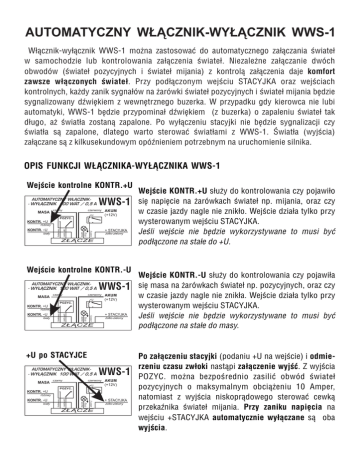 AUTOMATYCZNY W£¥CZNIK-WY£¥CZNIK WWS-1 W³¹cznik-wy³¹cznik WWS-1 mo¿na zastosowaæ do automatycznego za³¹czania œwiate³ w samochodzie lub kontrolowania za³¹czenia œwiate³. Niezale¿ne za³¹czanie dwóch obwodów (œwiate³ pozycyjnych i œwiate³ mijania) z kontrol¹ za³¹czenia daje komfort zawsze w³¹czonych œwiate³. Przy pod³¹czonym wejœciu STACYJKA oraz wejœciach kontrolnych, ka¿dy zanik sygna³ów na ¿arówki œwiate³ pozycyjnych i œwiate³ mijania bêdzie sygnalizowany dŸwiêkiem z wewnêtrznego buzerka. W przypadku gdy kierowca nie lubi automatyki, WWS-1 bêdzie przypomina³ dŸwiêkiem (z buzerka) o zapaleniu œwiate³ tak d³ugo, a¿ œwiat³a zostan¹ zapalone. Po wy³¹czeniu stacyjki nie bêdzie sygnalizacji czy œwiat³a s¹ zapalone, dlatego warto sterowaæ œwiat³ami z WWS-1. Œwiat³a (wyjœcia) za³¹czane s¹ z kilkusekundowym opóŸnieniem potrzebnym na uruchomienie silnika. OPIS FUNKCJI W£¥CZNIKA-WY£¥CZNIKA WWS-1 Wejœcie kontrolne KONTR.+U AUTOMATYCZNY W£¥CZNIK- WY£¥CZNIK 100 WAT / 0,5 A MASA czarny WWS-1 czerwony +U AKUM (+12V) POZYC. KONTR. +U + STACYJKA zielony œwiat. drog. niebieski bia³y fioletowy ró¿owy KONTR. -U ¿ó³to-zielony Z£¥CZE Wejœcie kontrolne KONTR.-U AUTOMATYCZNY W£¥CZNIK- WY£¥CZNIK 100 WAT / 0,5 A MASA czarny WWS-1 czerwony +U AKUM (+12V) POZYC. KONTR. +U + STACYJKA zielony œwiat. drog. niebieski bia³y fioletowy ró¿owy KONTR. -U ¿ó³to-zielony Z£¥CZE +U po STACYJCE AUTOMATYCZNY W£¥CZNIK- WY£¥CZNIK 100 WAT / 0,5 A MASA czarny WWS-1 czerwony +U AKUM (+12V) POZYC. KONTR. +U zielony œwiat. drog. niebieski bia³y fioletowy ró¿owy KONTR. -U Z£¥CZE + STACYJKA ¿ó³to-zielony Wejœcie KONTR.+U s³u¿y do kontrolowania czy pojawi³o siê napiêcie na ¿arówkach œwiate³ np. mijania, oraz czy w czasie jazdy nagle nie znik³o. Wejœcie dzia³a tylko przy wysterowanym wejœciu STACYJKA. Jeœli wejœcie nie bêdzie wykorzystywane to musi byæ pod³¹czone na sta³e do +U. Wejœcie KONTR.-U s³u¿y do kontrolowania czy pojawi³a siê masa na ¿arówkach œwiate³ np. pozycyjnych, oraz czy w czasie jazdy nagle nie znik³a. Wejœcie dzia³a tylko przy wysterowanym wejœciu STACYJKA. Jeœli wejœcie nie bêdzie wykorzystywane to musi byæ pod³¹czone na sta³e do masy. Po za³¹czeniu stacyjki (podaniu +U na wejœcie) i odmierzeniu czasu zw³oki nast¹pi za³¹czenie wyjœæ. Z wyjœcia POZYC. mo¿na bezpoœrednio zasiliæ obwód œwiate³ pozycyjnych o maksymalnym obci¹¿eniu 10 Amper, natomiast z wyjœcia niskopr¹dowego sterowaæ cewk¹ przekaŸnika œwiate³ mijania. Przy zaniku napiêcia na wejœciu +STACYJKA automatycznie wy³¹czane s¹ oba wyjœcia. KOLEJNOŒÆ ZA£¥CZANIA WEJŒÆ I WYJŒÆ WWS-1 czas za³¹czenia stacyjki wejœcie +STACYJKA ~5s opóŸnienie za³¹cz. wyjœæ wejœcie KONTR.+U wejœcie KONTR.-U czas kontroli wejœæ czas za³¹czenia wyjœæ wyjœcie POZYC. wyjœcie niskopr¹dowe sygnalizacja buzerkiem nie za³¹czonych œwiate³ œwiat³a za³¹czane automatycznie œwiat³a za³¹czane rêcznie PRZYK£ADY POD£¥CZENIA W£¥CZNIKA-WY£¥CZNIKA WWS-1 AUTOMATYCZNY W£¥CZNIK- WY£¥CZNIK 100 WAT / 0,5 A czarny WWS-1 czerwony +U AUTOMATYCZNY W£¥CZNIK- WY£¥CZNIK 100 WAT / 0,5 A AKUM (+12V) MASA czarny +U POZYC. WWS-1 czerwony kontrolka ³adowania AKUM (+12V) +12 V POZYC. KONTR. +U KONTR. +U ró¿owy zielony niebieski bia³y ¿ó³to-zielony Z£¥CZE œwiat. drog. KONTR. -U + STACYJKA fioletowy zielony œwiat. drog. fioletowy bia³y niebieski ró¿owy KONTR. -U + STACYJKA ¿ó³to-zielony Z£¥CZE zielony czarny czerwony ŒWIAT£A DROGOWE Prze³¹cznik lato/zima +12 V 20A pomarañczowy bia³y ŒWIAT£A MIJANIA +12 V +U na ŒWIAT£A POZYCYJNE max. 10A fioletowy +12 V 20A +12 V np. po zap³onie +12 V np. po zap³onie ró¿owy zielony czerwony ŒWIAT£A DROGOWE ¿ó³to-zielony niebieski pomarañczowy masa (-U) na ŒWIAT£A POZYCYJNE max. 10A +12 V niebieski czarny ¿ó³to-zielony fioletowy ró¿owy ALTERNATOR + 13,6 v +12 V po zap³onie znikaj¹cy przy rozruchu silnika (cienki przewód!) MASA ŒWIAT£A MIJANIA przekaŸnik w instalacji elektrycznej samochodu lub dodatkowy przekaŸnik - zalecany 30 Amper UWAGA: Œwiat³a mijania nie bêd¹ œwieciæ jeœli po za³¹czeniu œwiate³ drogowych (d³ugich) zniknie masa na wejœciu (podawana przez ¿arówki œwiate³ drogowych),.