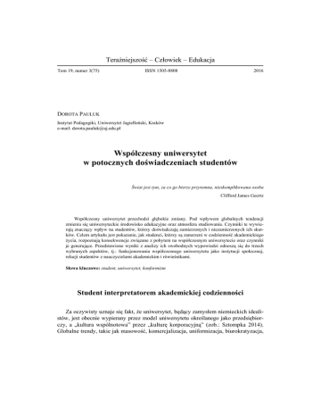 Teraźniejszość – Człowiek – Edukacja Tom 19, numer 3(75) ISSN 1505-8808 2016 DOROTA PAULUK Instytut Pedagogiki, Uniwersytet Jagielloński, Kraków e-mail: [email protected] Współczesny uniwersytet w potocznych doświadczeniach studentów Świat jest tym, za co go bierze przytomna, nieskomplikowana osoba Clifford James Geertz Współczesny uniwersytet przechodzi głębokie zmiany. Pod wpływem globalnych tendencji zmienia się uniwersyteckie środowisko edukacyjne oraz atmosfera studiowania. Czynniki te wywierają znaczący wpływ na studentów, którzy doświadczają zamierzonych i niezamierzonych ich skutków. Celem artykułu jest pokazanie, jak studenci, którzy są zanurzeni w codzienność akademickiego życia, rozpoznają konsekwencje związane z pobytem na współczesnym uniwersytecie oraz czynniki je generujące. Przedstawione wyniki z analizy ich swobodnych wypowiedzi odnoszą się do trzech wybranych aspektów, tj.: funkcjonowania współczesnego uniwersytetu jako instytucji społecznej, relacji studentów z nauczycielami akademickim i rówieśnikami. Słowa kluczowe: student, uniwersytet, konformizm Student interpretatorem akademickiej codzienności Za oczywisty uznaje się fakt, że uniwersytet, będący zamysłem niemieckich idealistów, jest obecnie wypierany przez model uniwersytetu określanego jako przedsiębiorczy, a „kultura wspólnotowa” przez „kulturę korporacyjną” (zob.: Sztompka 2014). Globalne trendy, takie jak masowość, komercjalizacja, uniformizacja, biurokratyzacja, 184 Dorota PAULUK prowadzą do głębokich przemian tej instytucji, także jako środowiska edukacyjnego. Przebywający w nim studenci, w różnych obszarach swojego życia doświadczają skutków jego oddziaływania, tak o charakterze pozytywnym, jak i negatywnym. Poznawanie tych rezultatów i ich uwarunkowań staje się nośnym i atrakcyjnym dla pedagogów obszarem naukowych dociekań. Coraz mocniej wybrzmiewają postulaty, aby badania te pogłębiać o perspektywę patrzenia na uniwersytet przez różne „stany” go reprezentujące. Pojawiają się propozycje uwzględnienia tzw. perspektywy emicznej, czyli perspektywy „aktorów edukacyjnej sceny”. Potrzeby, ale i zaniedbania w tym względzie dostrzega M. Czerepaniak-Walczak, która pisze: Znacznie mniej uwagi (i wagi) przykłada się do jakościowych analiz i subiektywnych opinii na temat rzeczywistych warunków i efektów tego poziomu formalnej edukacji. Uczestnicy nauczania akademickiego (studenci i nauczyciele) stoją na obrzeżach (przeważnie politycznej i ekonomicznej) debaty nad tymi zagadnieniami, co czyni ich obiektami tych ocen i pozbawia możliwości doświadczania podmiotowości w tej sferze (Czerepaniak-Walczak 2014, s. 93). Przyczyn takiego stanu jest wiele. Brakuje sprzyjających warunków ze względu na oddziaływanie globalnych trendów, tradycje metodologiczne, traktowanie studentów za mało wiarygodne źródło wiedzy itp. Powierzchowne relacje pomiędzy uczestnikami społeczności akademickiej przypominają kontakty ograniczonego zaufania, a wyniki wielu badań oraz doniesienia medialne kreują obraz współczesnego studenta jako roszczeniowego klienta, konsumenta usług edukacyjnych, „ksero-studenta”, przedstawiciela pokolenia „zielonego markera”, dla którego studia są czasem dobrej zabawy, zabiegania o dyplom, a nie zaspokajania ciekawości poznawczej. Wszystko to podbudowane hierarchiczną strukturą akademicką sprawia, że głos ważnych podmiotów akademickiej sceny pozostaje nadal głosem ukrytym. Nie negując słuszności formułowanych opinii i wniosków, nie sposób też zaprzeczyć, że studenci są kompetentnymi przewodnikami i interpretatorami uniwersyteckiej rzeczywistości, a oceny studentów pozostają najbardziej rzetelnym i trafnym sposobem zbierania danych ewaluacyjnych (...) podkreślają eksperci zajmujący się mierzeniem jakości kształcenia (Rudnicki, Szwed 2010). Oprócz wyników pochodzących z badań wykorzystujących zarówno te „twarde”, jak i „miękkie” metody wynika, że zanurzeni w codzienność akademickiego życia studenci mają wysoką świadomość tego, co dzieje się na uniwersytecie, własnego w nim miejsca, obowiązujących tam reguł gry, zamierzonych i niezamierzonych skutków studiowania. Przekonuje o tym m.in. taki fragment jednej z wypowiedzi, pochodzący z badań własnych: Czas studiów jest okresem wyjątkowym i niezapomnianym. Daje nam wiele więcej, niż tak naprawdę dostrzegamy, bo wiedzę ukrytą, którą posiądziemy i nie jesteśmy w stanie zwerbalizować. Posługujemy się nią na co dzień, nie zwracając uwagi, kiedy i na jakich fundamentach ona powstała. Wiele rzeczy dzieje się Współczesny uniwersytet w potocznych doświadczeniach studentów 185 w naszym życiu nieświadomie, uczymy się czegoś, nie wiedząc o tym. Nasza ogólna wiedza kształtuje nas każdego dnia, a studia są czasem, kiedy człowiek jest wyjątkowo chłonny i przyswaja na bieżąco nowe umiejętności, rozwijając swój potencjał intelektualny, kształtuje, buduje świat emocji, tak mocnych i odczuwalnych dzięki sile młodości i jej zawierzeniu światu i ludziom (nr 297)1. Wartością nie do przecenienia jest to, że studenci są obserwatorami i uczestnikami oficjalnych i nieoficjalnych zdarzeń, które często umykają narzędziom badawczym i pozostają niedostępne osobom z zewnątrz. Każdego dnia odczuwają skutki dokonujących się zmian, przeobrażających środowisko edukacyjne i atmosferę studiowania. Dlatego też mają oni doskonałe rozeznanie w strukturze organizacyjnej uczelni, obowiązujących wzorach interakcji, rytuałach, zwyczajach, formalnych i nieformalnych normach postępowania, oczekiwaniach wobec dominującej wiedzy, sposobach jej przekazywania i egzekwowania, metodach i formach nauczania, ocenach procesu dydaktycznego wyrażanych przez rówieśników, zaletach i wadach wykładowców itp. Studenci są wysoce zmotywowani, a