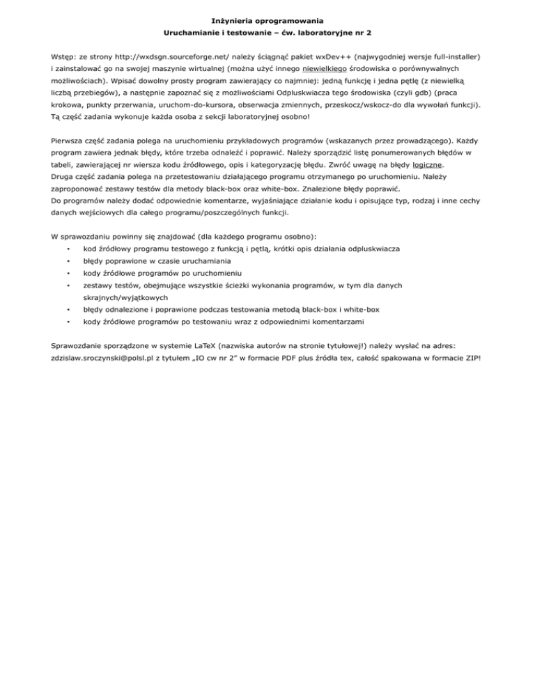 Inżynieria oprogramowania Uruchamianie i testowanie – ćw. laboratoryjne nr 2 Wstęp: ze strony http://wxdsgn.sourceforge.net/ należy ściągnąć pakiet wxDev++ (najwygodniej wersje full-installer) i zainstalować go na swojej maszynie wirtualnej (można użyć innego niewielkiego środowiska o porównywalnych możliwościach). Wpisać dowolny prosty program zawierający co najmniej: jedną funkcję i jedna pętlę (z niewielką liczbą przebiegów), a następnie zapoznać się z możliwościami Odpluskwiacza tego środowiska (czyli gdb) (praca krokowa, punkty przerwania, uruchom-do-kursora, obserwacja zmiennych, przeskocz/wskocz-do dla wywołań funkcji). Tą część zadania wykonuje każda osoba z sekcji laboratoryjnej osobno! Pierwsza część zadania polega na uruchomieniu przykładowych programów (wskazanych przez prowadzącego). Każdy program zawiera jednak błędy, które trzeba odnaleźć i poprawić. Należy sporządzić listę ponumerowanych błędów w tabeli, zawierającej nr wiersza kodu źródłowego, opis i kategoryzację błędu. Zwróć uwagę na błędy logiczne. Druga część zadania polega na przetestowaniu działającego programu otrzymanego po uruchomieniu. Należy zaproponować zestawy testów dla metody black-box oraz white-box. Znalezione błędy poprawić. Do programów należy dodać odpowiednie komentarze, wyjaśniające działanie kodu i opisujące typ, rodzaj i inne cechy danych wejściowych dla całego programu/poszczególnych funkcji. W sprawozdaniu powinny się znajdować (dla każdego programu osobno): • kod źródłowy programu testowego z funkcją i pętlą, krótki opis działania odpluskwiacza • błędy poprawione w czasie uruchamiania • kody źródłowe programów po uruchomieniu • zestawy testów, obejmujące wszystkie ścieżki wykonania programów, w tym dla danych skrajnych/wyjątkowych • błędy odnalezione i poprawione podczas testowania metodą black-box i white-box • kody źródłowe programów po testowaniu wraz z odpowiednimi komentarzami Sprawozdanie sporządzone w systemie LaTeX (nazwiska autorów na stronie tytułowej!) należy wysłać na adres: [email protected] z tytułem „IO cw nr 2” w formacie PDF plus źródła tex, całość spakowana w formacie ZIP!