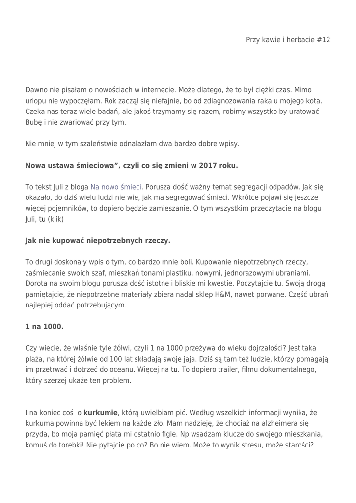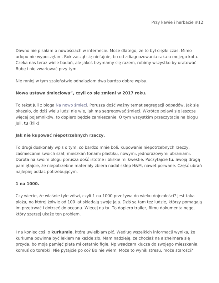 Przy kawie i herbacie #12 Dawno nie pisałam o nowościach w internecie. Może dlatego, że to był ciężki czas. Mimo urlopu nie wypoczęłam. Rok zaczął się niefajnie, bo od zdiagnozowania raka u mojego kota. Czeka nas teraz wiele badań, ale jakoś trzymamy się razem, robimy wszystko by uratować Bubę i nie zwariować przy tym. Nie mniej w tym szaleństwie odnalazłam dwa bardzo dobre wpisy. Nowa ustawa śmieciowa”, czyli co się zmieni w 2017 roku. To tekst Juli z bloga Na nowo śmieci. Porusza dość ważny temat segregacji odpadów. Jak się okazało, do dziś wielu ludzi nie wie, jak ma segregować śmieci. Wkrótce pojawi się jeszcze więcej pojemników, to dopiero będzie zamieszanie. O tym wszystkim przeczytacie na blogu Juli, tu (klik) Jak nie kupować niepotrzebnych rzeczy. To drugi doskonały wpis o tym, co bardzo mnie boli. Kupowanie niepotrzebnych rzeczy, zaśmiecanie swoich szaf, mieszkań tonami plastiku, nowymi, jednorazowymi ubraniami. Dorota na swoim blogu porusza dość istotne i bliskie mi kwestie. Poczytajcie tu. Swoją drogą pamiętajcie, że niepotrzebne materiały zbiera nadal sklep H&M, nawet porwane. Część ubrań najlepiej oddać potrzebującym. 1 na 1000. Czy wiecie, że właśnie tyle żółwi, czyli 1 na 1000 przeżywa do wieku dojrzałości? Jest taka plaża, na której żółwie od 100 lat składają swoje jaja. Dziś są tam też ludzie, którzy pomagają im przetrwać i dotrzeć do oceanu. Więcej na tu. To dopiero trailer, filmu dokumentalnego, który szerzej ukaże ten problem. I na koniec coś o kurkumie, którą uwielbiam pić. Według wszelkich informacji wynika, że kurkuma powinna być lekiem na każde zło. Mam nadzieję, że chociaż na alzheimera się przyda, bo moja pamięć płata mi ostatnio figle. Np wsadzam klucze do swojego mieszkania, komuś do torebki! Nie pytajcie po co? Bo nie wiem. Może to wynik stresu, może starości? Przy kawie i herbacie #12 Dlatego, kurkuma teraz będzie dawkowana codziennie. O jej właściwościach przeczytacie tu. Niestety więcej ciekawych wpisów nie miałam czasu wyszukać, wszyscy piszą o noworocznych postanowieniach a ja takowe mam gdzieś. Oczywiście mam jakiś plan na bloga i na siebie, ale nie muszę chyba o tym pisać? Podziel się: Udostępnij na Twitterze(Otwiera się w nowym oknie) Click to share on Facebook(Otwiera się w nowym oknie) Click to share on Google+(Otwiera się w nowym oknie) Click to share on Pocket(Otwiera się w nowym oknie) Kliknij, aby udostępnić na LinkedIn(Otwiera się w nowym oknie) Więcej Dodaj do ulubionych: Lubię Wczytywanie...