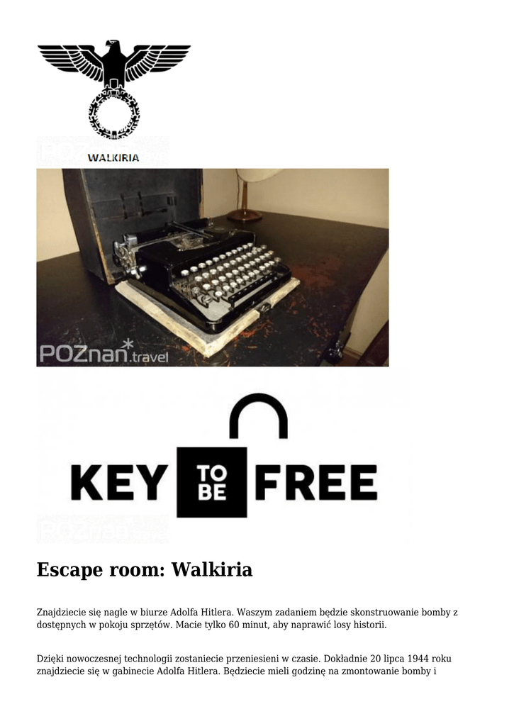 Escape room: Walkiria Znajdziecie się nagle w biurze Adolfa Hitlera. Waszym zadaniem będzie skonstruowanie bomby z dostępnych w pokoju sprzętów. Macie tylko 60 minut, aby naprawić losy historii. Dzięki nowoczesnej technologii zostaniecie przeniesieni w czasie. Dokładnie 20 lipca 1944 roku znajdziecie się w gabinecie Adolfa Hitlera. Będziecie mieli godzinę na zmontowanie bomby i opuszczenie gabinetu przywódcy III Rzeszy. Wszystko co potrzebujecie jest już w nim schowane Waszym zadaniem jest znaleźć części bomby, zmontować ją i opuścić gabinet nie później niż 60 minut po udanym przeniesieniu w czasie i przestrzeni. W razie niepowodzenia zostaniecie złapani lub padniecie ofiarą własnej bomby. Jesteście najlepsi z najlepszych i wierzymy, że uda Wam się zmienić bieg historii............ Pokój dla 2-5 osób.