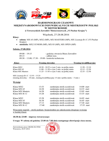 HARMONOGRAM CZASOWY MIĘDZYNARODOWYCH INDYWIDUALNYCH MISTRZOSTW POLSKI W MOTOCROSSIE (i Towarzyskich Zawodów Motocrossowych „VI Puchar Krajny”) Więcbork, 27-28.08.2016 Klasy: sobota: MX 65 (MP), MX2 (MP), MX MASTERS (MP), MX Licencja B i C (VI Puchar Krajny) niedziela: MX2 JUNIOR (MP), MX 85 (MP), MX OPEN (MP) Sobota, 27.08.2016 09:00 – 19:15 - godziny otwarcia Biura Zawodów 09:15 - odbiór toru 09:30 – 13.00; 17:30 – 19:00 - kontrola techniczna Klasy Klasa MX2 Klasa MX 65 Klasa MX Masters Trening dowolny Trening kwalifikacyjny 10:30 - 10:55 w tym 5 min. na próbę startu 11:00 - 11:20 w tym 5 min. na próbę startu 11:25 - 11:45 w tym 5 min. na próbę startu 11:50 - 12:10 12:15 - 12:30 12:35 - 12:50 MX Licencja B i C 12:55 - 13:25 (trening dowolny – 10 min , trening kwalifikacyjny 15 min i próba startu – 5 min ) Wyścigi Klasa MX2 Klasa MX 65 Klasa MX Masters Klasa MX B i C 13:53 14:28 14:58 15:28 zamknięta strefa oczekiwań zamknięta strefa oczekiwań zamknięta strefa oczekiwań zamknięta strefa oczekiwań 14:00 14:35 15:05 15:35 start start start start Klasa MX2 Klasa MX 65 Klasa MX Masters Klasa MX B i C 15:58 16:38 17:13 17:48 zamknięta strefa oczekiwań zamknięta strefa oczekiwań zamknięta strefa oczekiwań zamknięta strefa oczekiwań 16:05 16:45 17:20 17:55 start start start start Wręczanie nagród – strefa podium- bezpośrednio po zakończeniu drugiego wyścigu w każdej klasie 18:30 do 23:00 – imprezy towarzyszące Uwaga: W sobotę od godziny 23.00 do 7.00 dnia następnego obowiązuje cisza nocna. …………………………………………….. Zatwierdzony przez GKSM ZG PZM Warszawa, 28.07.2016 HARMONOGRAM CZASOWY MIĘDZYNARODOWYCH INDYWIDUALNYCH MISTRZOSTW POLSKI W MOTOCROSSIE (i Towarzyskich Zawodów Motocrossowych „VI Puchar Krajny”) Więcbork, 27-28.08.2016 Niedziela, 28.08.2016 08:00 08:15 – 10.30 - otwarcie Biura Zawodów – czynne do zakończenia zawodów - kontrola techniczna Klasy MX 2 Junior MX 85 MX Open Trening dowolny Trening kwalifikacyjny 9:00 - 9:25 w tym 5 min na próbę startu 9:30 - 9:55 w tym 5 min na próbę startu 10:00 - 10:25 w tym 5 min na próbę startu 12:10 - 12.20 10:30 - 10:50 10:55 - 11:15 11:20 - 11:40 Uroczyste otwarcie zawodów. Wyścigi Klasa MX2 Junior Klasa MX 85 Klasa MX Open 12:23 12:58 13:33 zamknięta strefa oczekiwań zamknięta strefa oczekiwań zamknięta strefa oczekiwań 12:30 start 13:05 start 13:40 start Klasa MX 2 Junior Klasa MX 85 Klasa MX Open 14:13 14:58 15:43 zamknięta strefa oczekiwań zamknięta strefa oczekiwań zamknięta strefa oczekiwań 14:20 start 15:05 start 15:50 start Wręczanie nagród – strefa podium - bezpośrednio po zakończeniu drugiego wyścigu w każdej klasie. …………………………….. Zatwierdzony przez GKSM ZG PZM Warszawa, 28.07.2016