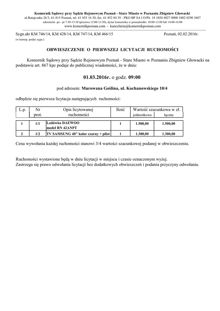 Komornik Sądowy przy Sądzie Rejonowym Poznań - Stare Miasto w Poznaniu Zbigniew Głowacki ul.Ratajczaka 26/3, 61-815 Poznań, tel. 61 855 16 30, fax. 61 852 84 39 - PKO BP SA I O/Pń 18 1020 4027 0000 1002 0290 3607 sekretariat pn - pt 7:30-15:30 (przerwa 12:00-12:30), dyżur komornika w poniedziałki: 10:00-12:00 lub 14:00-16:00 www.komornikpoznan.com - [email protected] Sygn.akt KM 746/14, KM 428/14, KM 747/14, KM 466/15 Poznań, 02.02.2016r. (w koresp. podać sygn.) OBWIESZCZENIE O PIERWSZEJ LICYTACJI RUCHOMOŚCI Komornik Sądowy przy Sądzie Rejonowym Poznań - Stare Miasto w Poznaniu Zbigniew Głowacki na podstawie art. 867 kpc podaje do publicznej wiadomości, że w dniu: 01.03.2016r. o godz. 09:00 pod adresem: Murowana Goślina, ul. Kochanowskiego 10/4 odbędzie się pierwsza licytacja następujących ruchomości: L.p. Nr prot. Opis licytowanej ruchomości Ilość Wartość szacunkowa w zł. jednostkowa łączna 1 1/1 Lodówka DAEWOO model RN 42ANPT 1 1.500,00 1.500,00 2 1/2 TV SAMSUNG 40" kolor czarny + pilot 1 1.300,00 1.300,00 Cena wywołania każdej ruchomości stanowi 3/4 wartości szacunkowej podanej w obwieszczeniu. Ruchomości wystawione będą w dniu licytacji w miejscu i czasie oznaczonym wyżej. Zastrzega się prawo odwołania licytacji bez dodatkowych obwieszczeń i podania przyczyny odwołania.