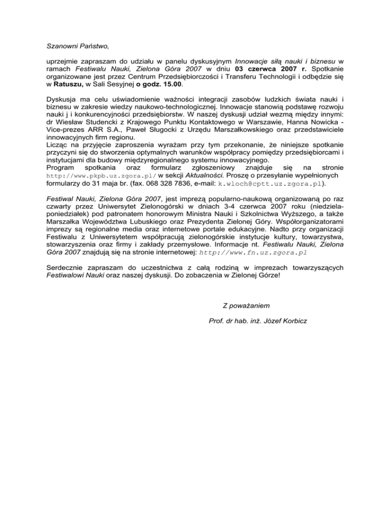 Szanowni Państwo, uprzejmie zapraszam do udziału w panelu dyskusyjnym Innowacje siłą nauki i biznesu w ramach Festiwalu Nauki, Zielona Góra 2007 w dniu 03 czerwca 2007 r. Spotkanie organizowane jest przez Centrum Przedsiębiorczości i Transferu Technologii i odbędzie się w Ratuszu, w Sali Sesyjnej o godz. 15.00. Dyskusja ma celu uświadomienie ważności integracji zasobów ludzkich świata nauki i biznesu w zakresie wiedzy naukowo-technologicznej. Innowacje stanowią podstawę rozwoju nauki j i konkurencyjności przedsiębiorstw. W naszej dyskusji udział wezmą między innymi: dr Wiesław Studencki z Krajowego Punktu Kontaktowego w Warszawie, Hanna Nowicka Vice-prezes ARR S.A., Paweł Sługocki z Urzędu Marszałkowskiego oraz przedstawiciele innowacyjnych firm regionu. Licząc na przyjęcie zaproszenia wyrażam przy tym przekonanie, że niniejsze spotkanie przyczyni się do stworzenia optymalnych warunków współpracy pomiędzy przedsiębiorcami i instytucjami dla budowy międzyregionalnego systemu innowacyjnego. Program spotkania oraz formularz zgłoszeniowy znajduje się na stronie http://www.pkpb.uz.zgora.pl/ w sekcji Aktualności. Proszę o przesyłanie wypełnionych formularzy do 31 maja br. (fax. 068 328 7836, e-mail: [email protected]). Festiwal Nauki, Zielona Góra 2007, jest imprezą popularno-naukową organizowaną po raz czwarty przez Uniwersytet Zielonogórski w dniach 3-4 czerwca 2007 roku (niedzielaponiedziałek) pod patronatem honorowym Ministra Nauki i Szkolnictwa Wyższego, a także Marszałka Województwa Lubuskiego oraz Prezydenta Zielonej Góry. Współorganizatorami imprezy są regionalne media oraz internetowe portale edukacyjne. Nadto przy organizacji Festiwalu z Uniwersytetem współpracują zielonogórskie instytucje kultury, towarzystwa, stowarzyszenia oraz firmy i zakłady przemysłowe. Informacje nt. Festiwalu Nauki, Zielona Góra 2007 znajdują się na stronie internetowej: http://www.fn.uz.zgora.pl Serdecznie zapraszam do uczestnictwa z całą rodziną w imprezach towarzyszących Festiwalowi Nauki oraz naszej dyskusji. Do zobaczenia w Zielonej Górze! Z poważaniem Prof. dr hab. inż. Józef Korbicz