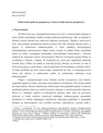 Michał Penkala* Dawid Sześciło* Fiński model społeczno-gospodarczy. Geneza, źródła sukcesu, perspektywy. 1. Wprowadzenie W Polsce toczy się, a przynajmniej powinna się toczyć w ostatnich latach dyskusja na temat wyboru optymalnego modelu rozwoju społeczno-gospodarczego. Idąc za sugestią G. Garretta wskazać możemy dwa całkowicie odmienne rozwiązania1. Zgodnie z pierwszym z nich, celem polityki gospodarczej państwa powinno być stałe obniżanie kosztów pracy, a poprzez to podnoszenie konkurencyjności w sferze produkcji niewymagającej technologicznego zaawansowania. Druga ścieżka rozwoju to, ogólnie biorąc, gospodarka oparta na wiedzy, wymagająca doskonałego wykształconego społeczeństwa i instytucji zdolnych do wspierania wzrostu innowacyjności. Pierwsze rozwiązania skazuje Polskę na rywalizację z Chinami i Indiami. W rywalizacji tej, nawet przy radykalnym obniżaniu kosztów pracy, Polska stoi jednak na straconej pozycji. Okazuje się bowiem, że choć w Polsce koszty pracy w porównaniu z innymi państwami Unii Europejskiej, są bardzo niskie2, to Chiny (podobnie jak wiele innych krajów azjatyckich) nie dość, że dysponują jeszcze tańszą siłą roboczą, to jednocześnie szybko się modernizują, podnosząc swoją konkurencyjność3. Druga z zaproponowanych przez Garretta ścieżek rozwojowych, czyli budowa gospodarki opartej na wiedzy, pozostaje zatem jedynym rozwiązaniem, które można poddać poważnej analizie. Naszym zadaniem jest zilustrowanie wizji gospodarki opartej o wiedzę na przykładzie państwa, które ten model rozwojowy realizuje w sposób niezwykle skuteczny. Mowa tu o Finlandii, zaledwie 5,5-milionowym państwie, które może się poszczycić miejscem w ścisłej czołówce światowych rankingów konkurencyjności gospodarek. Zawdzięcza to właśnie imponującej transformacji tradycyjnej gospodarki w gospodarkę bazującą na innowacyjności oraz wysokim poziomie wykształcenia, rozwoju nauki i * Autorzy są studentami III roku Międzywydziałowych Indywidualnych Studiów Humanistycznych Uniwersytetu Warszawskiego. Są również członkami Zarządu Koła Naukowego Demokratów UW (opiekun naukowy – Prof. dr hab. Mirosław Wyrzykowski). Artykuł powstał w oparciu o prezentację multimedialną przygotowaną przez Marię Śmiglak i Michała Penkalę na konferencję naukową KN Demokratów „Społeczeństwo informacyjne w państwie sieciowym. Kazus Skandynawii” (30-31 marca 2006 roku). 1 G. Garrett, Globalization’s Missing Middle, Foreign Affairs November/December 2004 6 (83), s. 84-96. 2 E. Bendyk, Ręce zamiast głowy, Polityka 5/2006, s. 85. 3 Ibidem. 1 technologii. Co jednak niezwykle istotne, towarzyszy temu także realizacja ambitnej polityki społecznej, u której źródeł leży założenie o eliminowaniu społecznego wykluczenia, m. in. poprzez powszechny, gwarantowany przez państwo dostęp do edukacji i publicznej służby zdrowia. Model fiński – mówiąc w skrócie – łączy zatem tradycyjny skandynawski model państwa dobrobytu (welfare state) ze zdolnością do utrzymania konkurencyjności gospodarczej. Proponujemy zatem przyjrzenie się „modelowi fińskiemu”, jako optymalnej – w naszej opinii – ścieżce społeczno-gospodarczego rozwoju. Przeanalizujemy jego genezę, warunki, w jakich się rodził, a przede wszystkim jego najistotniejsze cechy. Kończąc, będziemy chcieli też podjąć próbę odpowiedzi na pytanie o możliwość przeszczepienia rozwiązań fińskich na polski grunt, biorąc pod uwagę obecną sytuację Polski i jej cechy specyficzne. Upraszczając, będziemy chcieli poznać odpowiedź na pytanie: Czy należy i czy można zbudować w Polsce drugą Finlandię? 2. Bolesne narodziny „modelu fińskiego” To, co określamy jako „model fiński”, a co będziemy starali się zdefiniować w kolejnym punkcie rozważań, nie ma za sobą szczególnie długiej historii. Jego zręby zaczęły powstawać dopiero na początku lat dziewięćdziesiątych ubiegłego stulecia. Impulsem do jego narodzin był dramatyczny kryzys gospodarczy, jaki dotknął Finlandię i inne kraje skandynawskie na przełomie lat 80. i 90. Miał on związek z nieudaną próbą liberalizacji rynku finansowego oraz niedostosowaniem polityki gospodarczej państw do zmieniających się warunków globalnej konkurencji. Jak z satysfakcją odnotował wówczas konserwatywny Instytut Katona (Cato Institute) w odniesieniu do gospodarki szwedzkiej: „Szwecja wydawała się być wyzwaniem intelektualnym dla tych, którzy sprzeciwiali się wysokim podatkom i ingerencji państwa w gospodarkę. Po tym co się stało, już tylko nieliczni mogą uznawać ten model za wart naśladowania.4” Kryzys gospodarczy przełomu lat 80. i 90. w Finlandii sięgnął jednak najgłębiej. Obok czynników, które wystąpiły w innych państwach, na krach gospodarki fińskiej złożyły się jeszcze ekonomiczne konsekwencje upadku Związku Radzieckiego, który był głównym partnerem handlowym Finlandii. O skali kryzysu, jaki dotknął gospodarkę fińską na skutek tych zdarzeń, świadczyć może fakt, że w latach 1990-93 (okres najgłębszej recesji) 4 P. Krugman, Who knew? The Swedish model is working (w:) P. Krugman The Great Unraveling. Losing our way in the new century, W.W.Norton & Company New York 2004, s. 400. 2 odnotowano 13-procentowy spadek PKB5. Jeszcze bardziej dramatycznie przedstawiają się wskaźniki bezrobocia za ten okres. Wzrosło ono z 3,5% w roku 1990, do 17% w 1994 roku. Problemy gospodarcze przełożyły się zatem także na załamanie dotychczasowego modelu społecznego. Katastrofalna sytuacja gospodarcza stała się – w przypadku Finlandii – impulsem do radykalnej zmiany. U jej podstaw legło jednak założenie o konieczności całkowitego przeorientowania polityki gospodarczej, a jednoczesnym utrzymania „przy życiu” koncepcji welfare state. Ciężar reform, począwszy od 1995 roku, wzięły na siebie dwa 
