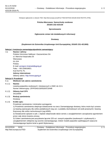 Dz.U./S S232 01/12/2016 423130-2016-PL - - Dostawy - Dodatkowe informacje - Procedura negocjacyjna 1/2 Niniejsze ogłoszenie w witrynie TED: http://ted.europa.eu/udl?uri=TED:NOTICE:423130-2016:TEXT:PL:HTML Polska-Warszawa: Samochody osobowe 2016/S 232-423130 Sprostowanie Ogłoszenie zmian lub dodatkowych informacji Dostawy (Suplement do Dziennika Urzędowego Unii Europejskiej, 2016/S 231-421365) Sekcja I: Instytucja zamawiająca/podmiot zamawiający I.1) Nazwa i adresy Polskie Górnictwo Naftowe i Gazownictwo SA ul. Marcina Kasprzaka 25 Warszawa 01-224 Polska E-mail: [email protected] Faks: +48 226918921 Kod NUTS: PL Adresy internetowe: Główny adres: http://www.pgnig.pl Sekcja II: Przedmiot II.1) Wielkość lub zakres zamówienia II.1.1) Nazwa: Leasing pojazdów osobowych i dostawczych o DMC do 3,5 t. Numer referencyjny: ZP/PGNG/16/0520/CS/WB II.1.2) Główny kod CPV 34110000 II.1.3) Rodzaj zamówienia Dostawy II.1.4) Krótki opis: Przedmiot zamówienia i minimalne wymagania: 1) Przedmiot zamówienia obejmuje świadczenie na rzecz Zamawiającego dostawy, która może być uznana za leasing operacyjny dla celów podatkowych (wg ust. o podatku dochodowym od osób prawnych) i leasing finansowy dla celów rachunkowych (wg MSR); 2) Świadczenie opisane w pkt. 1 będzie obejmowało także serwis z uwzględnieniem zarządzania ogumieniem przez cały okres trwania umowy; 3) Celem zamówienia jest pozyskanie łącznie 225 szt. nowych pojazdów (osobowych i użytkowych) z uwzględnieniem oklejenia wg wzorów Zamawiającego. Dobór modeli pojazdów spełniających wytyczne Zamawiającego będzie leżał w gestii Wykonawcy; 01/12/2016 S232 http://ted.europa.eu/TED - - Dostawy - Dodatkowe informacje - Procedura negocjacyjna Suplement do Dziennika Urzędowego Unii Europejskiej 1/2 Dz.U./S S232 01/12/2016 423130-2016-PL - - Dostawy - Dodatkowe informacje - Procedura negocjacyjna 2/2 4) Ubezpieczenie oraz zakup paliwa będą co do zasady leżały w gestii Zamawiającego; 5) W ramach usługi serwisowej Wykonawca zapewni usługę monitoringu pojazdów (GPS) wg wytycznych Zamawiającego; 6) Odbiór pojazdów odbywać się będzie co do zasady w następujących lokalizacjach: W-wa, Kraków, Zielona Góra, Sanok, Odolanów. Sekcja VI: Informacje uzupełniające VI.5) Data wysłania niniejszego ogłoszenia: 29/11/2016 VI.6) Numer pierwotnego ogłoszenia Numer ogłoszenia w Dz.Urz. UE – OJ/S: 2016/S 231-421365 Sekcja VII: Zmiany VII.1) Informacje do zmiany lub dodania VII.1.2) Tekst, który należy poprawić w pierwotnym ogłoszeniu Numer sekcji: II.1.1 Zamiast: Leasing pojazdów osobowych i dostawczych o DMC do 3,5 t. Powinno być: Leasing pojazdów osobowych i użytkowych o DMC do 3,5 t. Numer sekcji: II.2.4 Część nr: 1 Miejsce, w którym znajduje się tekst do modyfikacji: Opis zamówienia Zamiast: My niżej podpisani, działając w imieniu i na rzecz... (nazwa (firma) i adres Wykonawcy) niniejszym oświadczamy, że ubiegając się o zamówienie publiczne* na: Leasing pojazdów osobowych i dostawczych o DMC do 3,5 t Powinno być: My niżej podpisani, działając w imieniu i na rzecz... (nazwa (firma) i adres Wykonawcy) niniejszym oświadczamy, że ubiegając się o zamówienie publiczne* na: Leasing pojazdów osobowych i użytkowych o DMC do 3,5 t. VII.2) Inne dodatkowe informacje: 01/12/2016 S232 http://ted.europa.eu/TED - - Dostawy - Dodatkowe informacje - Procedura negocjacyjna Suplement do Dziennika Urzędowego Unii Europejskiej 2/2