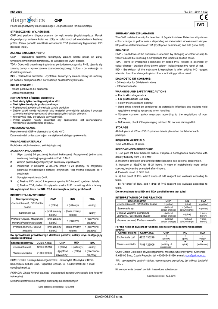 REF 2005 PL / EN - 2014 / 1.02 ONP IVD Pasek diagnostyczny dla mikrobiologii / Diagnostic strip for microbiology STRESZCZENIE I WYJAŚNIENIE ONP jest paskiem diagnostycznym do wykrywania β-galaktozydazy. Pasek diagnostyczny zmienia kolor na żółty w zależności od metabolizum badanej próbki. Pasek ponadto umożliwia oznaczenie TDA (deaminazy tryptofanu) i IND (testu na indol). ZASADA DZIAŁANIA TESTU ONP - Rozkładowi substratu towarzyszy zmiana koloru paska na żółtą, wywołana uwolnieniem nitrofenolu, co wskazuje na wynik dodatni. TDA - Obecność deaminazy tryptofanu, po dodaniu odczynnika PHE, ujawnia się zmianą barwy – wytworzeniem czerwono-brązowego koloru - co wskazuje na dodatni wynik testu. IND - Rozkładowi substratu L-tryptofanu towarzyszy zmiana barwy na różową, po dodaniu odczynnika IND, co wskazuje na dodatni wynik testu. SUMMARY AND EXPLANATION The ONP is detection strip for detection of β-galactosidase. Detection strip shows colour change to yellow colour depending on metabolism of examined sample. Strip allows determination of TDA (tryptophan deaminase) and IND (indol test). PRINCIPLE ONP - Breakdown of the substrate is attended by changing of colour of strip to yellow caused by releasing o-nitrophenol, this indicates positive result. TDA - prove of tryptophan deaminase by added PHE reagent is attended by colour change - creation of red-brown colour - indicating positive result of test. IND - Breakdown of the substrate L-tryptophan is after adding IND reagent attended by colour change to pink colour - indicating positive result. DIAGNOSTIC KIT CONTAINS: - 50 test strips for 50 determinations SKŁAD ZESTAWU - 50 szt. pasków na 50 oznaczeń - Information leaflet - ulotka informacyjna WARNINGS AND SAFETY PRECAUTIONS For in vitro diagnostics. OSTRZEŻENIA I ŚRODKI OCHRONY Test służy tylko do diagnostyki in vitro. Test tylko do użycia profesjonalnego. Postępować zgodnie z instrukcją użycia produktu! Zużyte paski należy traktować jako materiał potencjalnie zakaźny i podczas używania należy przestrzegać obowiązujących środków ochrony. Nie używać testu po upływie daty ważności. Przed użyciem należy sprawdzić czy opakowanie jest nienaruszone. Nie używać uszkodzonego zestawu. For professional use only PRZECHOWYWANIE Przechowywać ONP w ciemności w +2 do +8°C. STORAGE At dark place at +2 to +8°C. Expiration date is placed on the label of each Data ważności umieszczona jest na etykiecie każdego opakowania. package. WYMAGANE MATERIAŁY REQUIRED MATERIALS Tube with 0,5 ml of saline Probówka z 0,5ml roztworu soli fizjologicznej ZALECANA PROCEDURA 1. Użyć czystej 24 godzinnej hodowli bakteryjnej. Przygotować jednorodną 2. 3. 4. 5. zawiesinę bakteryjną o gęstości od 2 do 3 McF. Włożyć pasek diagnostyczny do zawiesiny w probówce. Follow the instructions exactly! Used strips should be considered as potentially infectious and obvious valid regulations must be respected when handling. Observe common safety measures according to the regulations of your country. Before use, check if the packaging is intact. Do not use damaged kit. RECCOMENDED PROCEDURE: 1. Use pure 24 hour bacterial culture. Prepare a homogenous suspension with density turbidity from 2 to 3 McF. 2. Insert the detection strip and dip detection zone into bacterial suspension. Inkubować w cieplarce w 35±2°C przez 18-24 godziny. W przypadku gatunków metabolicznie bardziej aktywnych, test można odczytać po 4 godzinach. Odczytać wynik testu ONP. a) Test na IND, dodać 2 krople odczynnika IND i ocenić zgodnie z tabelą. b) Test na TDA, dodać 1 kroplę odczynnika PHE i ocenić zgodnie z tabelą. Nie wykonywać testu na IND i TDA równolegle w jednej probówce! 3. Incubate at 35±2°C for 18-24 hours. In case of metabolically more active species, test can be evaluated after 4 hours. 4. Evaluate result of ONP test. 5. a) For proof of IND, add 2 drops of IND reagent and evaluate according to table. b) For proof of TDA, add 1 drop of PHE reagent and evaluate according to table. Do not evaluate test IND and TDA parallel in one test tube! INTERPRETACJA WYNIKÓW Szczep bakteryjny ONP IND TDA Escherichia coli, Citrobacter coseri + (żółty) + (różowy) - (żółty) Salmonella sp. - (brak zmiany koloru) - (brak zmiany koloru) - (żółty) + (różowy) + (czerwonobrążowy) Proteus vulgaris, Morganella - (brak zmiany morgnii,Providencia stuarti koloru) Proteus penneri, Proteus - (brak zmiany - (brak zmiany + (czerwono- mirabilis koloru) koloru) brążowy) Do sprawdzenia prawidłowego działania pasków, należy użyć następujący szczep kontrolny: Szczep bakteryjny CCM / ATCC ONP IND TDA Escherichia coli 4223 / 35218 + (żółty) + (różowy) - (żółty) Proteus mirabilis 7188 / 29906 - (gęstość - (żółty) + (czerwono- zawiesiny) brążowy) CCM: Czeska Kolekcja Mikroorganizmów, Uniwersytet Masaryka w Brnie, INTERPRETATION OF THE REACTION Bacterial strain ONP + (yellow) Escherichia coli, Citrobacter koseri - (without Salmonella sp. Proteus vulgaris, Morgalella morganii, Providencia stuartii Proteus penneri, Proteus mirabilis colour change) - (without colour change) - (without colour change) IND + (pink) - (without colour change) + (pink) TDA - (yellow) - (yellow) + (redbrown) - (without + (red- colour change) brown) For the need of own proof function, use following recommend bacterial strains: Control strains CCM/ATCC ONP IND TDA + + Escherichia coli 4225 / 35218 Proteus mirabilis 7188 / 29906 (yellow) (pink) - + (yellow) + (turbidity of suspension) (pink) (red-brown) CCM: Czech Collection of Microorganisms, Masaryk University Brno, Kamenice 5, 625 00 Brno, Czech Republic, tel. +420549491430, e-mail: [email protected] TIP: use negative control – follow recommended procedure, but without bacterial culture. Kamenice 5, 625 00 Brno, Republika Czeska, tel. +420549491430, e-mail: [email protected] Kit components doesn´t contain hazardous substances. PORADA: Uży